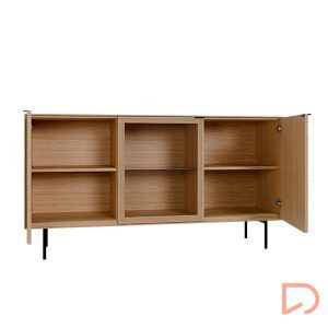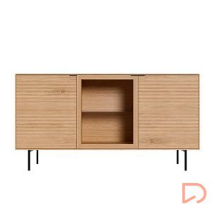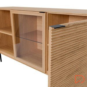 El aparador TULSA con 2 puertas de madera y 1 puerta de cristal combina funcionalidad y diseño con un equilibrio perfecto entre lo natural y lo sofisticado. Su estructura en chapa de roble y los frentes en madera maciza de roble rayado aportan textura, calidez y una presencia elegante.