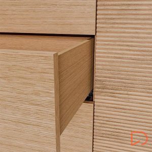 La estructura en chapa de roble natural se complementa con frentes de madera maciza de roble rayado, que aportan textura y un acabado artesanal que resalta por su calidez. Los sistemas de apertura soft closing y las guías metálicas ocultas aseguran un uso fluido y silencioso.