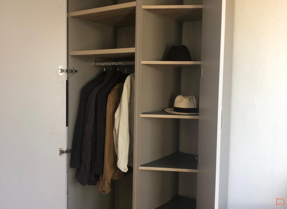 Hemos diseñado este armario con el sistema a medida que ofrecemos, dejando un pequeño espacio en hueco para aportarle un toque de estética.