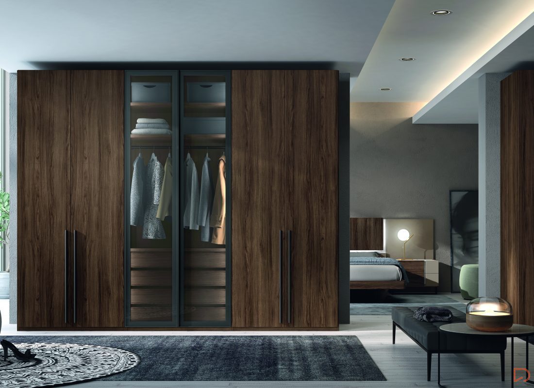 - El armario 52 cuenta con un diseño moderno excelente para cualquier dormitorio de matrimonio. Se trata de una composición de armario con 6 puertas estándar que combina acabados lacados y base.