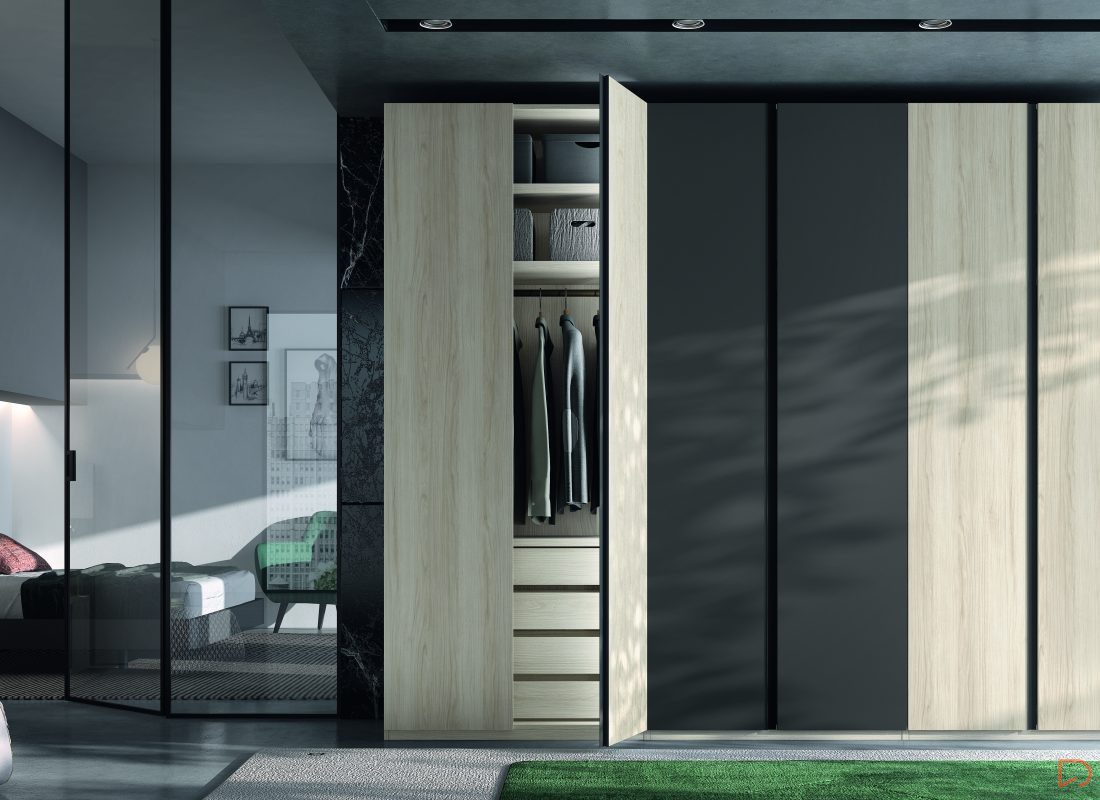 - El armario 54 cuenta con un diseño moderno, excelente para cualquier dormitorio de matrimonio. Se trata de una composición de armario con 6 puertas estándar que combina acabados lacados y base. Tiradores perfil en color pizarra.
