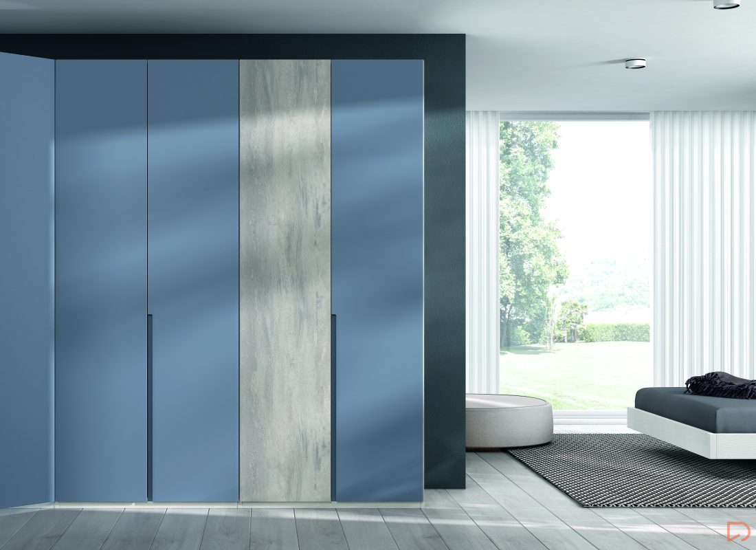 - El armario 56 cuenta con un diseño moderno excelente para cualquier dormitorio de matrimonio. Se trata de una composición de armario con 6 puertas estándar que combina acabados lacados y base.