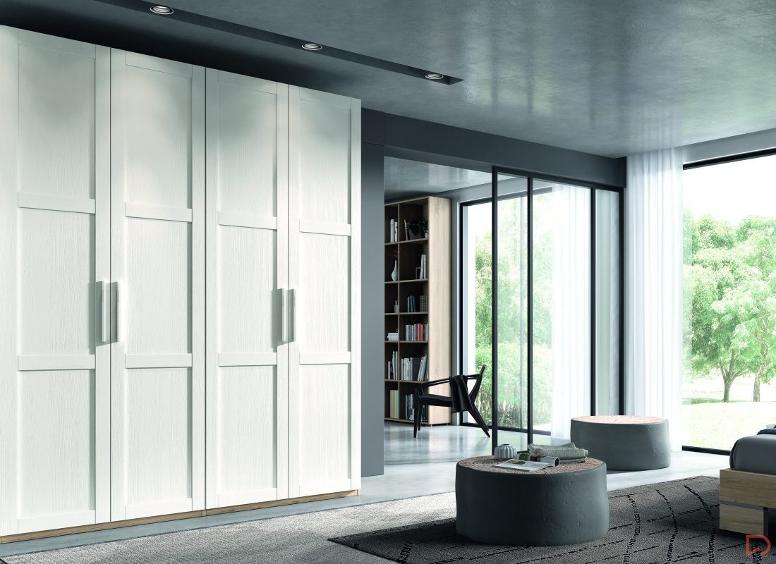 - El armario 58 cuenta con un diseño moderno excelente para cualquier dormitorio de matrimonio. Se trata de una composición de armario con 4 puertas enmarcadas que combina dos acabados base. Tirador barra 30 blanco.