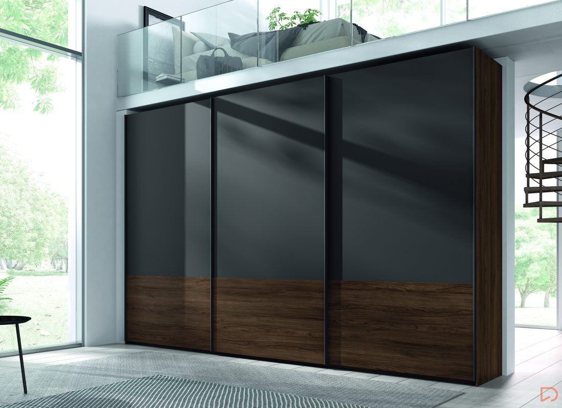 - El armario 71 cuenta con un diseño moderno excelente para cualquier dormitorio de matrimonio e incluso dormitorio juvenil. El armario modelo 71 se compone de 3 puertas correderas colgadas disponibles a configurar en acabados lacados y base. El armazón del producto irá siempre en el acabado escogido para la parte baja de las puertas.