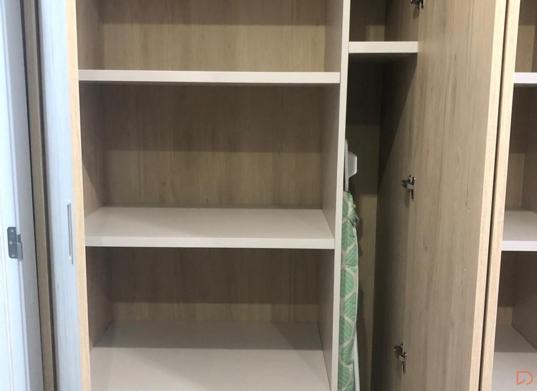 No quería la ropa en barras y dejando la separación correcta entre estante y estante, se puede decir que en cuanto a practicidad cumple con las expectativas de los clientes, integrando también un hueco para la tabla de planchar.
