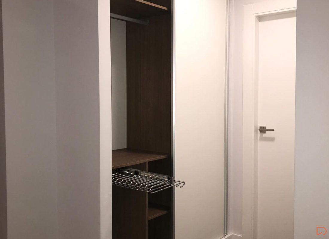 El interior del armario destaca por su acabado en melamina de efecto nogal, que aporta calidez y sofisticación, además de crear una armonía visual con el suelo de tono similar. Esta continuidad de materiales refuerza la sensación de diseño cuidado y coherente.