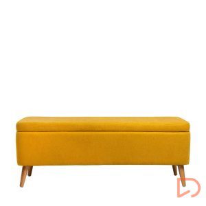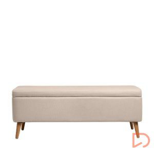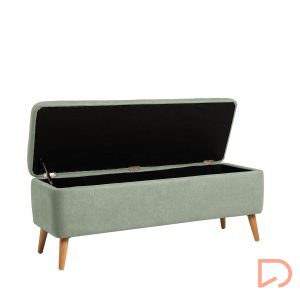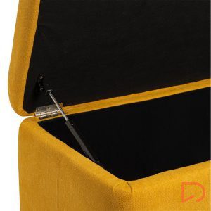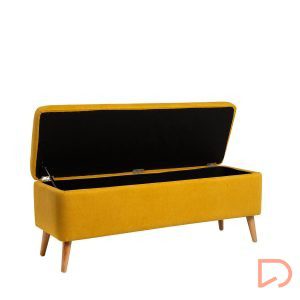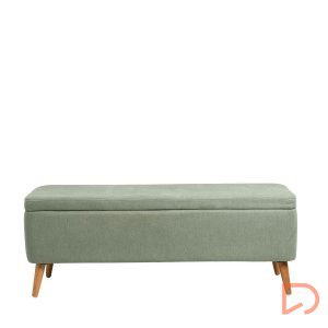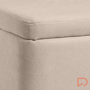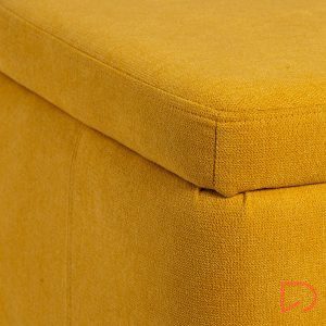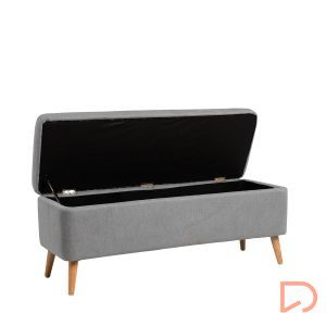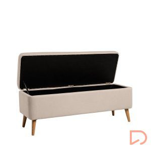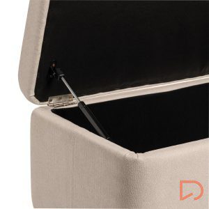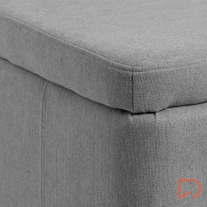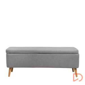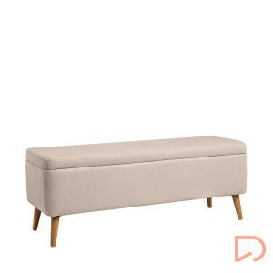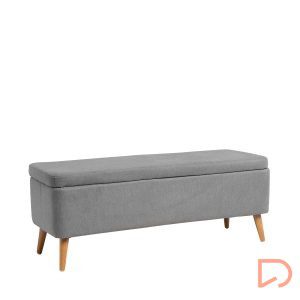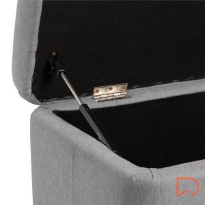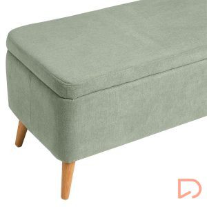 Su asiento tapizado esconde un práctico compartimento de almacenaje, ideal para guardar textiles, calzado o pequeños objetos del día a día.