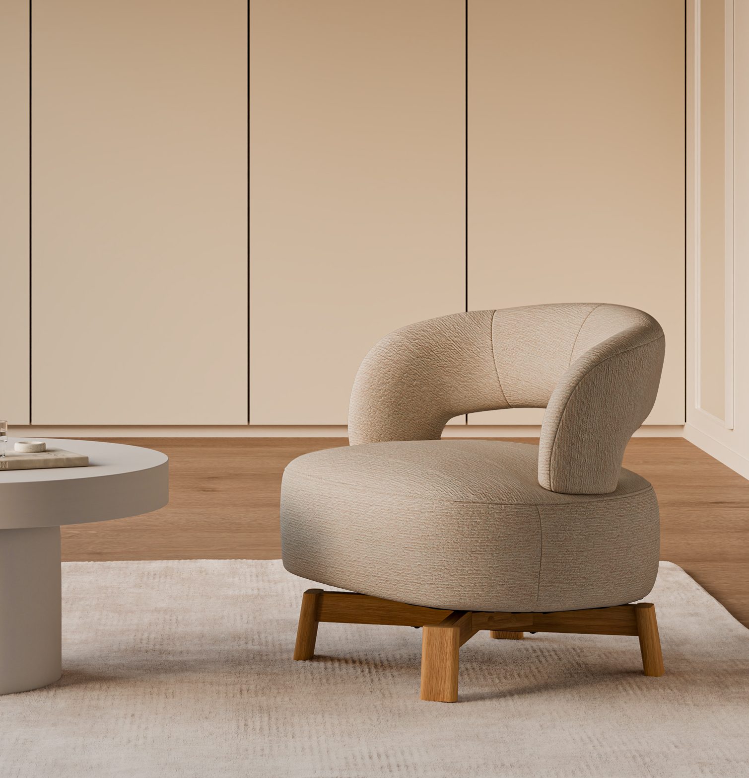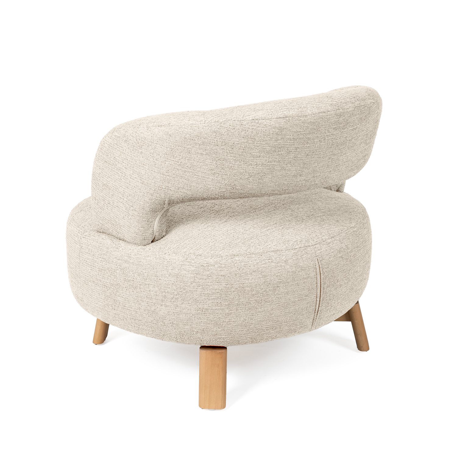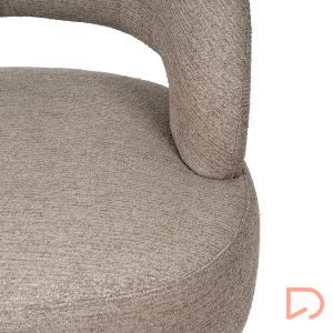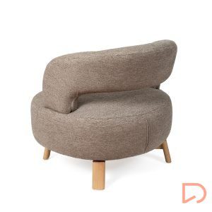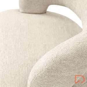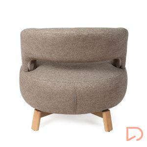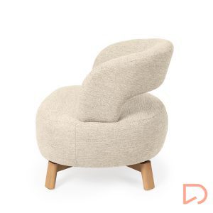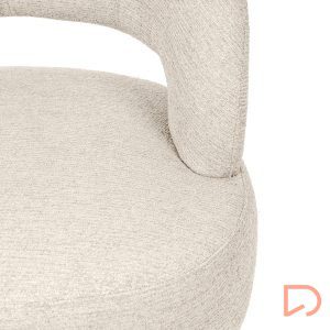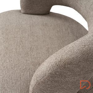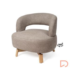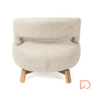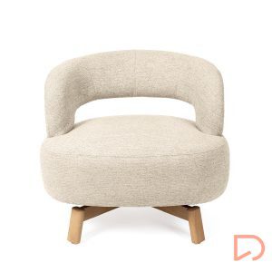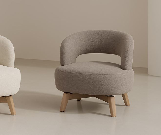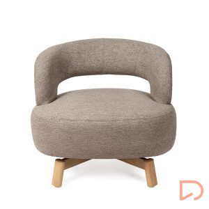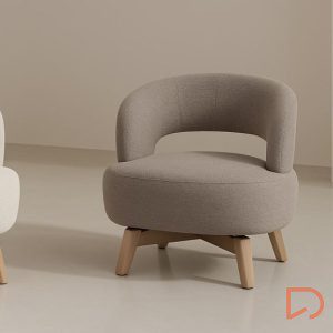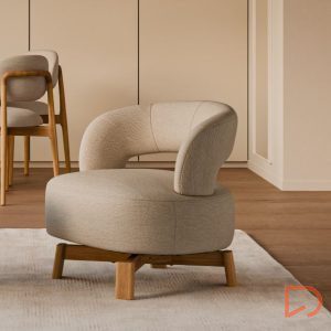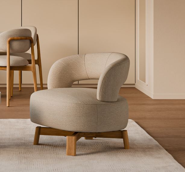 Sus patas de madera de haya elevan la estructura con un sutil contraste natural, aportando estabilidad y un toque orgánico al conjunto. Además, cuenta con un mecanismo giratorio de 360°, que añade comodidad y funcionalidad, ideal para adaptarse a distintos usos y momentos del día.