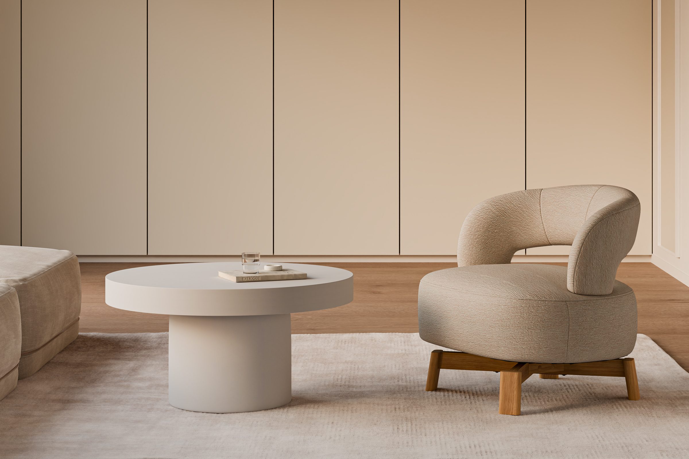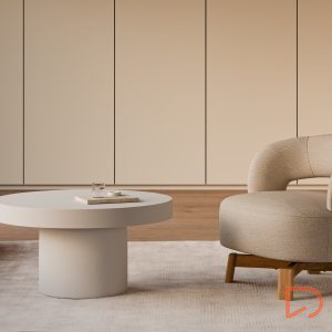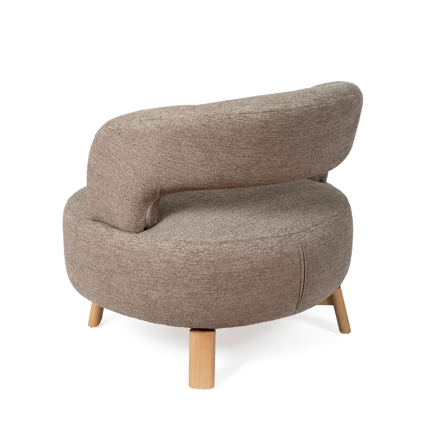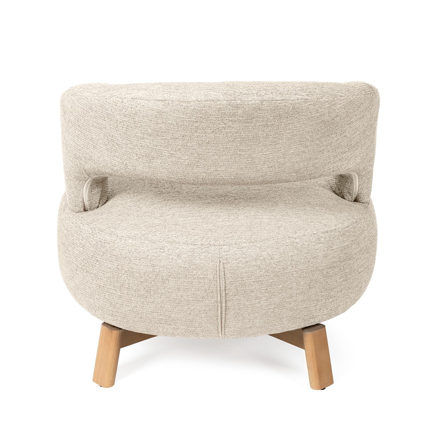 Sus patas de madera de haya elevan la estructura con un sutil contraste natural, aportando estabilidad y un toque orgánico al conjunto. Además, cuenta con un mecanismo giratorio de 360°, que añade comodidad y funcionalidad, ideal para adaptarse a distintos usos y momentos del día.