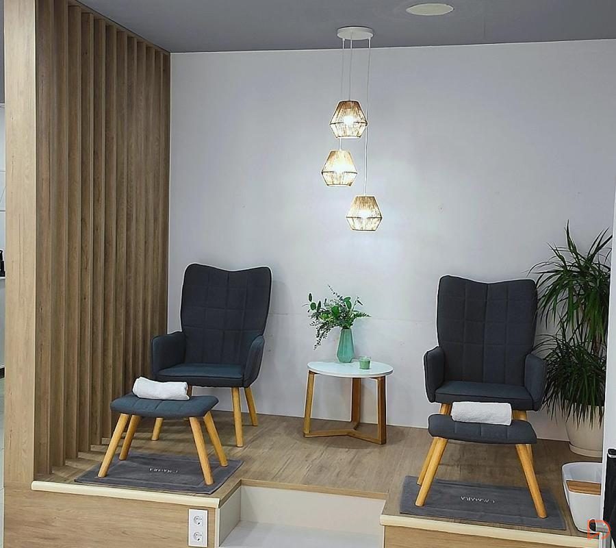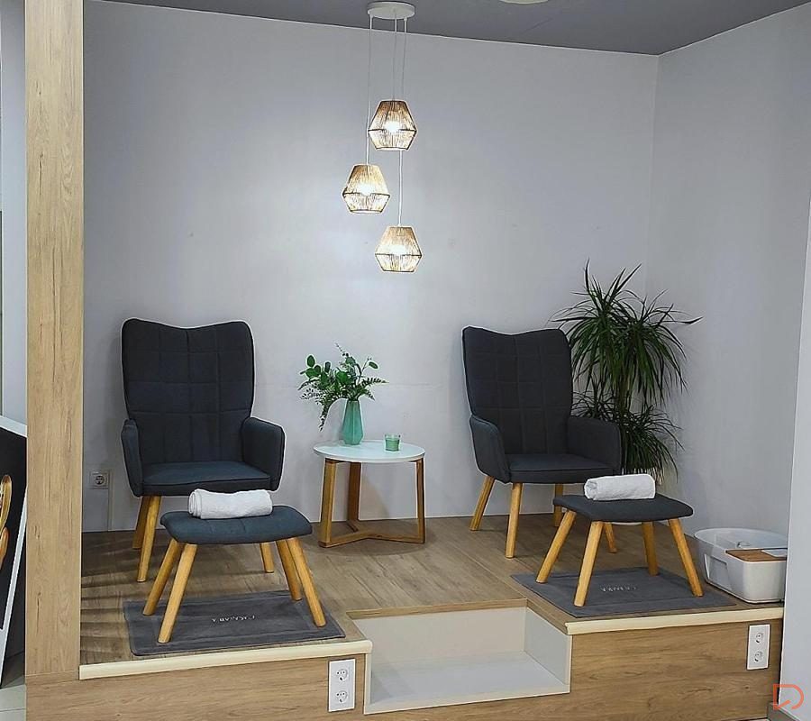 Esta modificación implica una transformación de la imagen en el área de pedicura, con la tarima y el espacio central logramos una perspectiva más extensa del espacio. Además, contamos con dos sillones fijos en tonos grises oscuros con patas de madera, y un taburete a juego para efectuar tratamientos y masajes en los pies.
