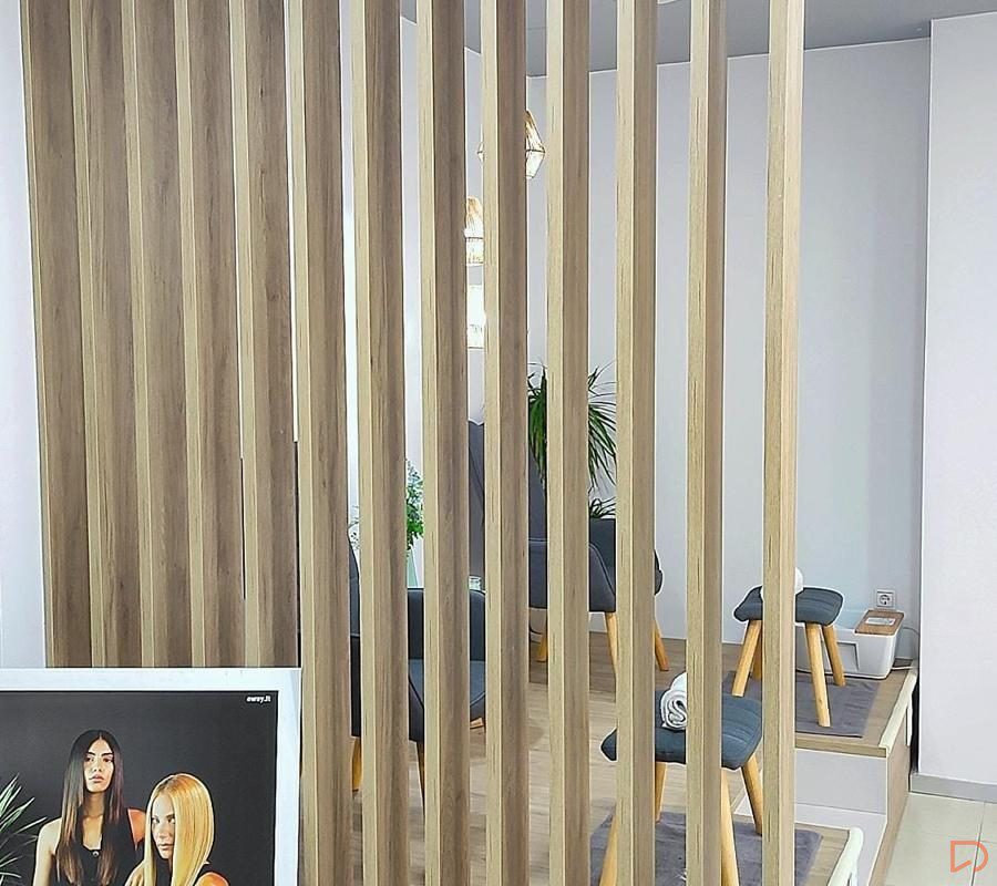 El paraban lateral listonado con el objetivo de distinguir la zona de peluquería y estética, proporcionando un ambiente contemporáneo y rústico a la vez.