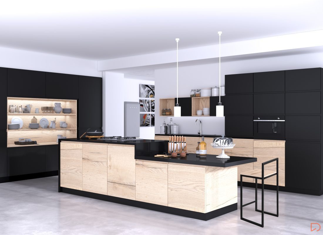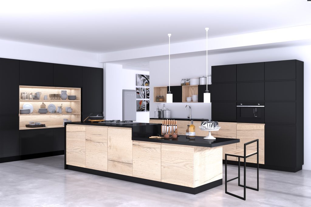 - La cocina PERFIL J NEGRO esta pensada para los mas modernos, con tonos negros y madera, personalizable al gusto, combinando distintos materiales y elementos: puertas, tiradores (estilo uñero), encimeras, penínsulas…