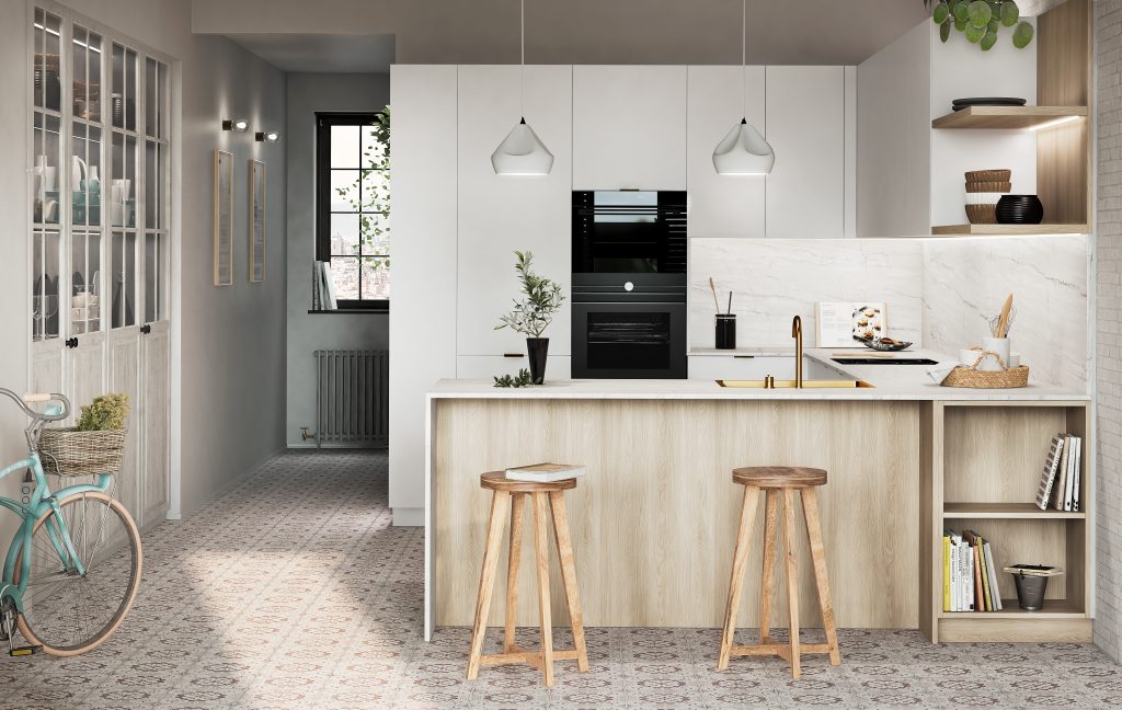 - La cocina SABANA ARTICO Y ROBLE BLANCO esta pensada para los mas modernos, con tonos madera claro y roble blanco, personalizable al gusto, combinando distintos materiales y elementos: puertas, tiradores, encimeras, islas…..