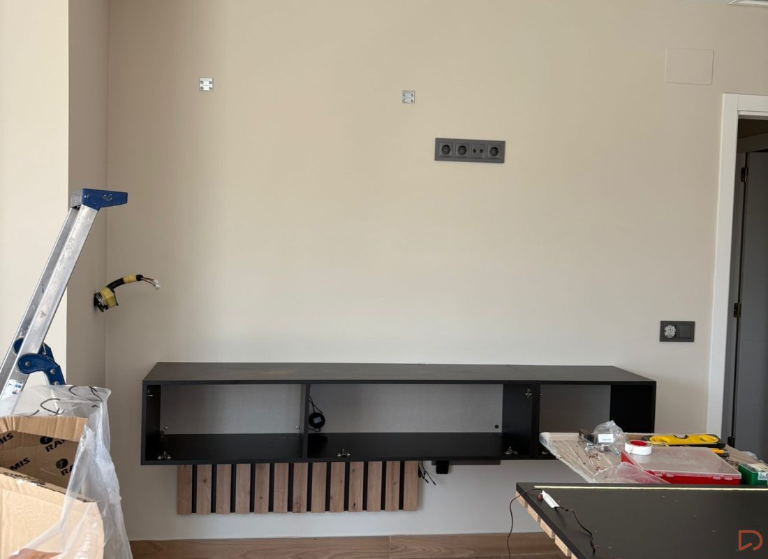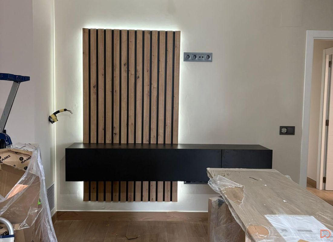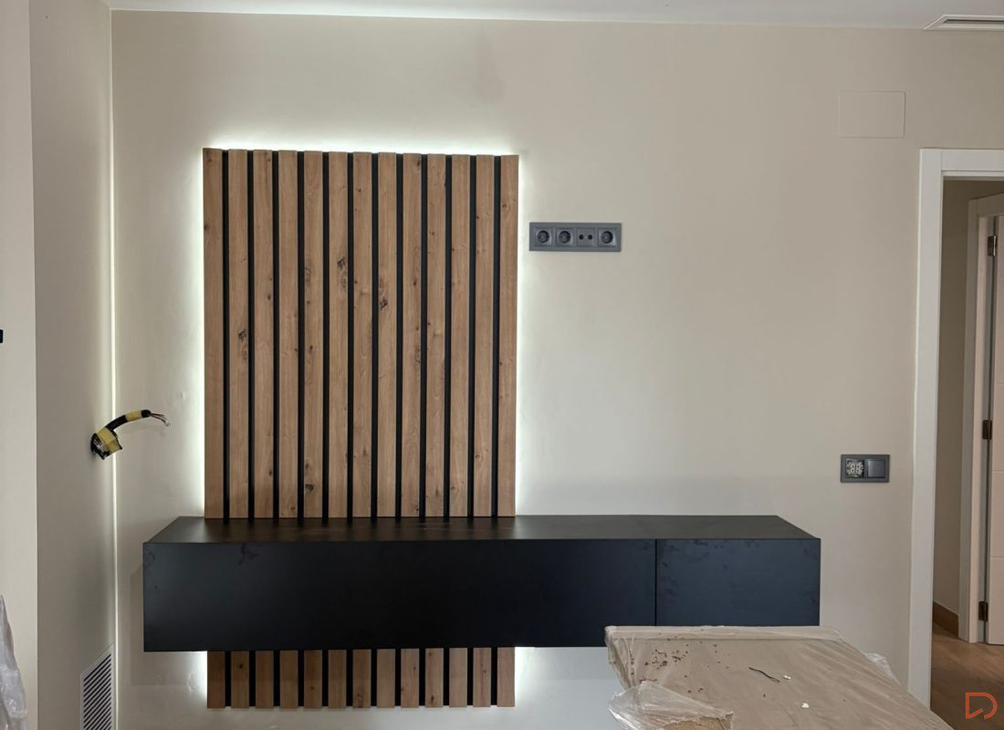Composición de salón moderna y funcional compuesta por módulos colgados (suspendidos) que aportan ligereza visual y aprovechan el espacio. Incluye un elegante panel de palillería vertical en acabado madera natural que aporta calidez y textura al ambiente. La iluminación LED integrada realza los volúmenes y crea una atmósfera acogedora y contemporánea.