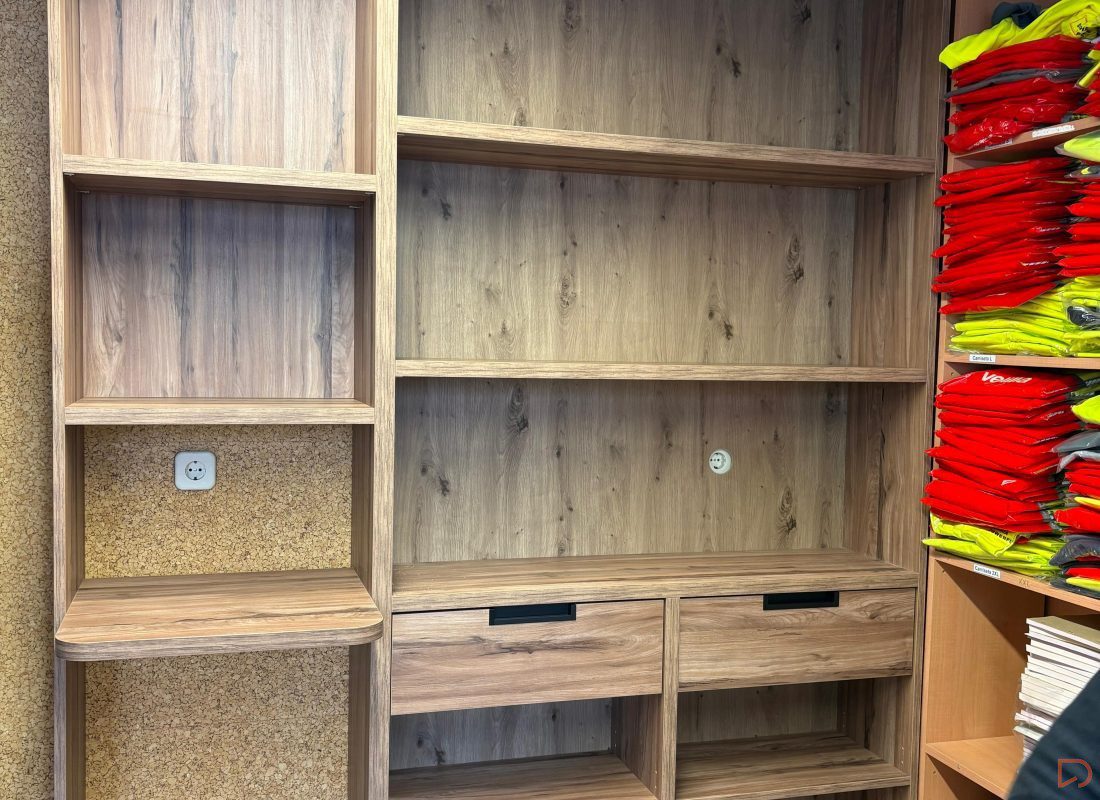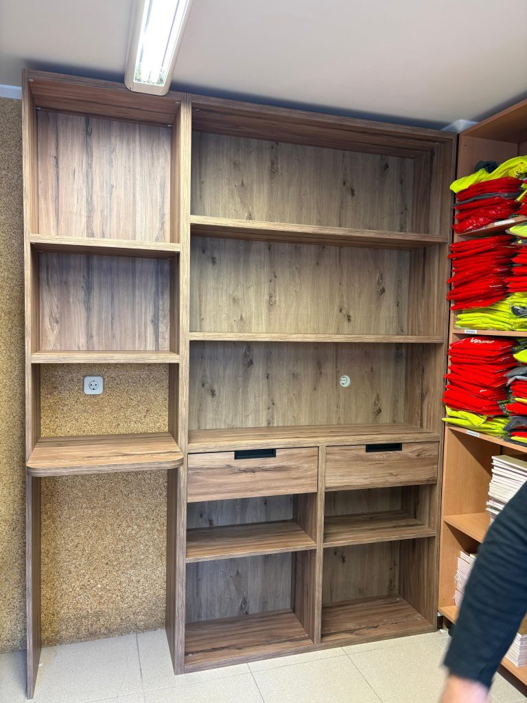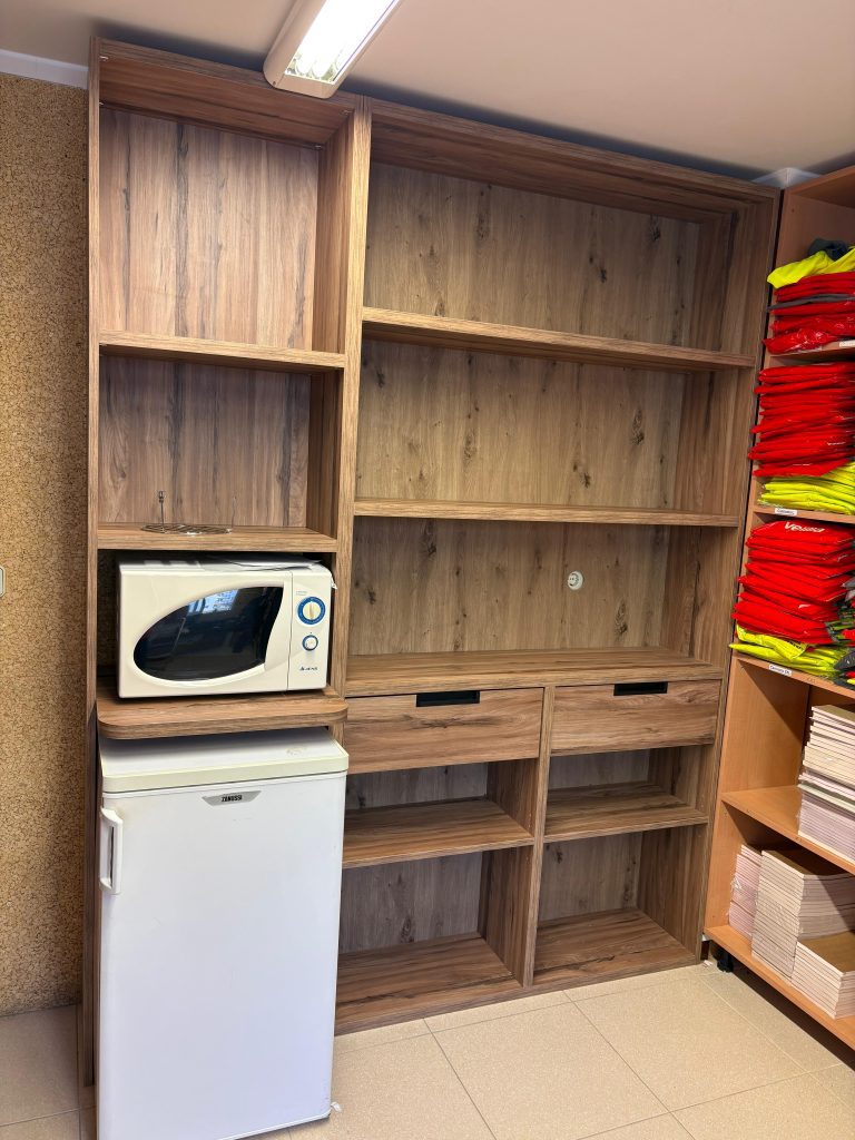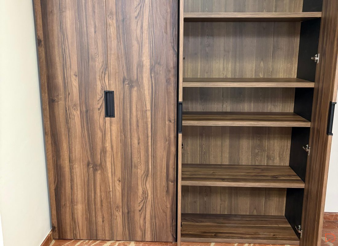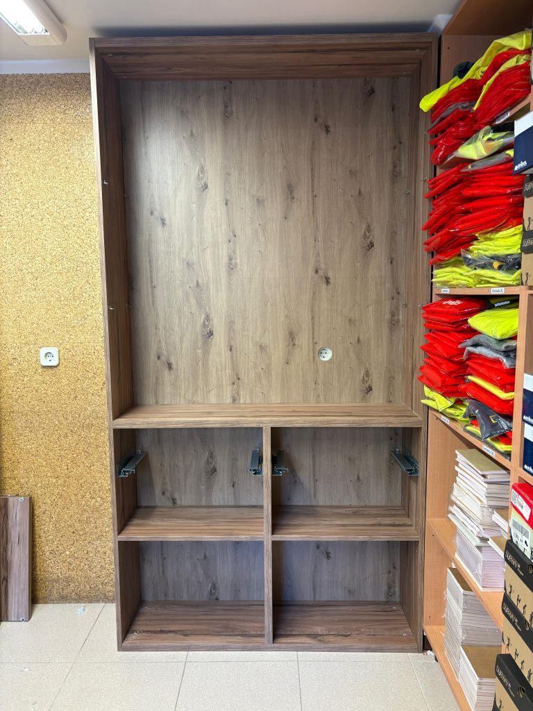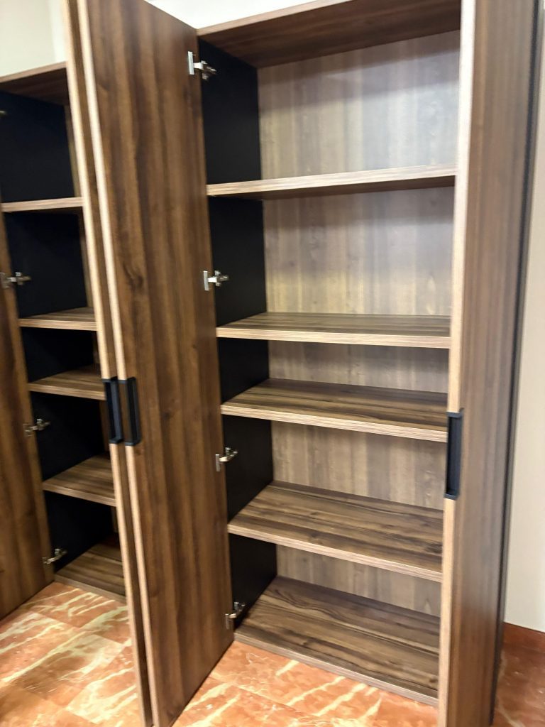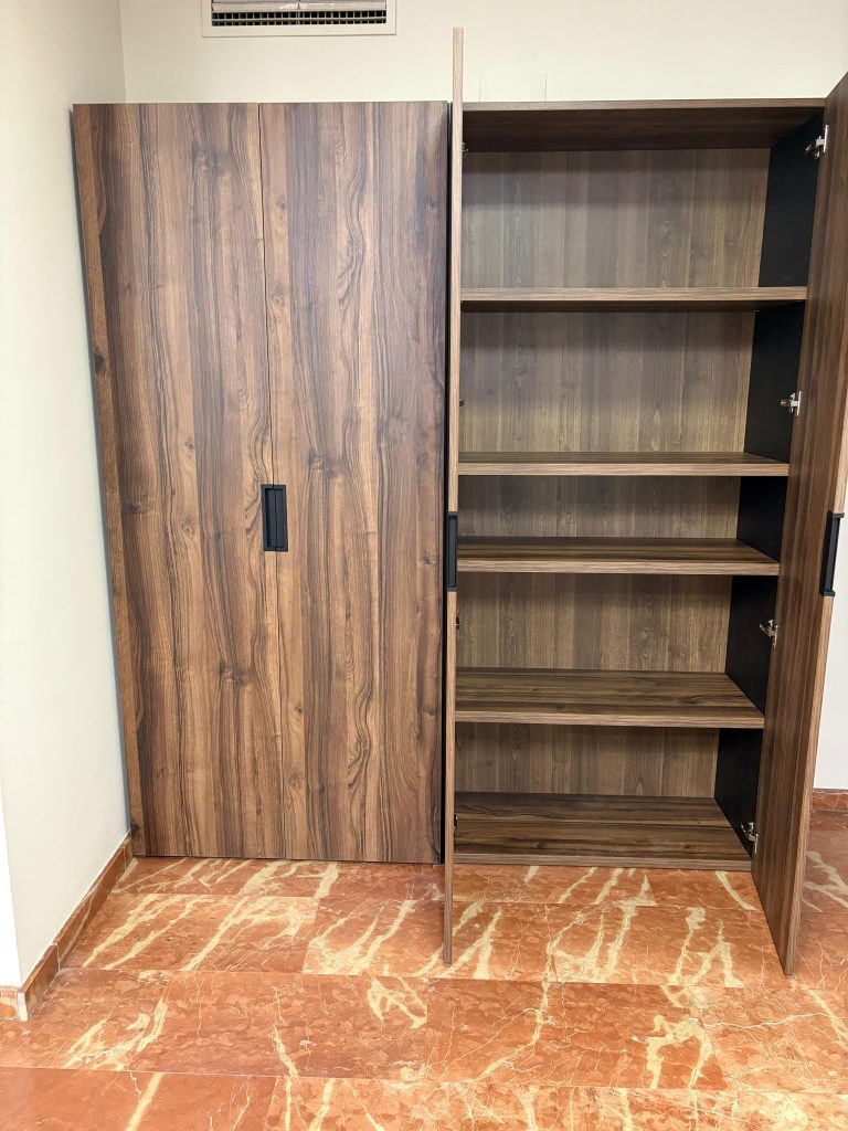El amueblamiento tiene un acabado en madera de nogal, lo que le da un tono más oscuro y elegante, adecuado para un entorno profesional como una empresa de construcción. En la primera imagen, el espacio está optimizado con un microondas y un refrigerador integrados en una estantería que ofrece almacenamiento adicional. La segunda imagen muestra un armario con puertas de nogal que, al abrirse, revelan estantes prácticos para organizar herramientas o documentos de forma ordenada y eficiente. El diseño es robusto y funcional, reflejando un ambiente corporativo organizado.