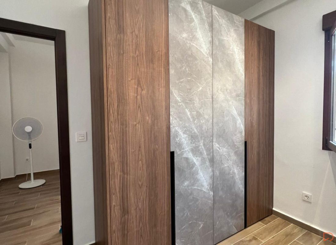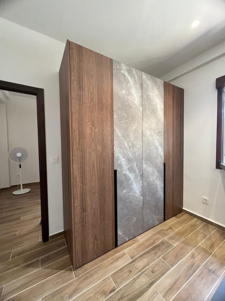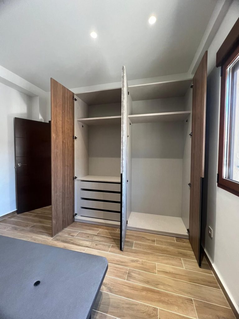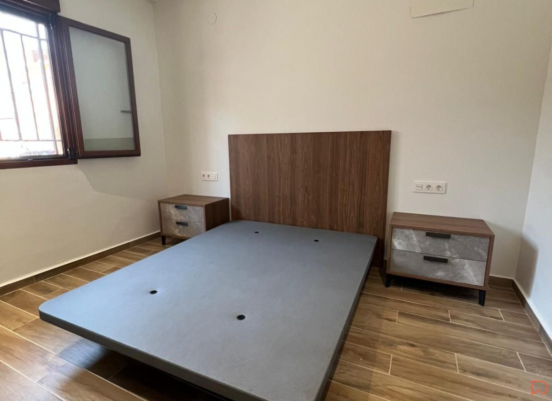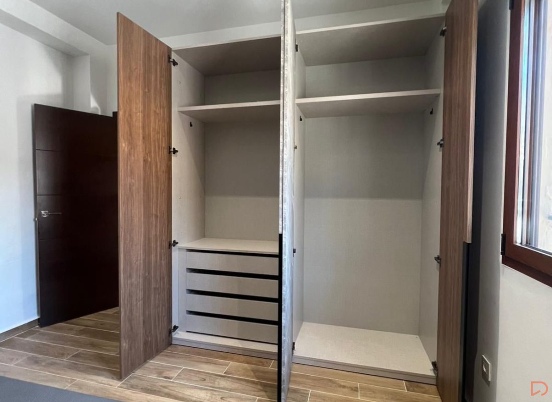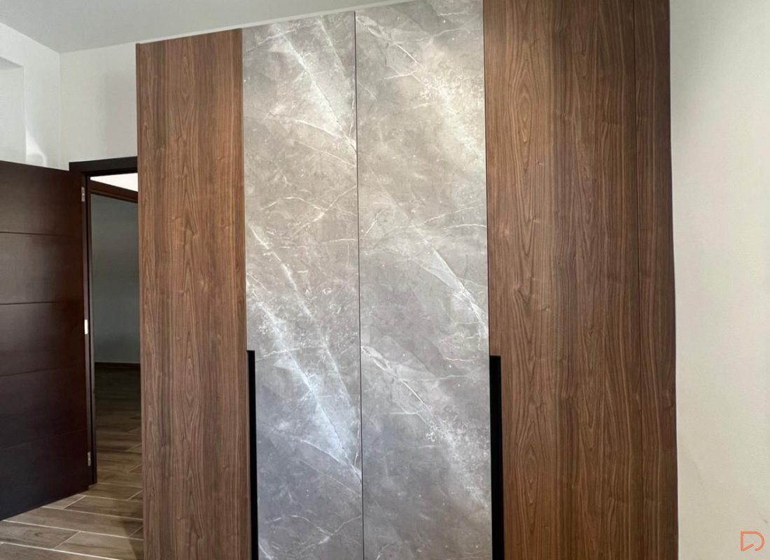 Este dormitorio presenta un diseño moderno y elegante, con una paleta de colores cálidos y neutros. El mobiliario combina acabados en madera oscura y paneles efecto porcelánico gris, lo que aporta un toque sofisticado y contemporáneo.