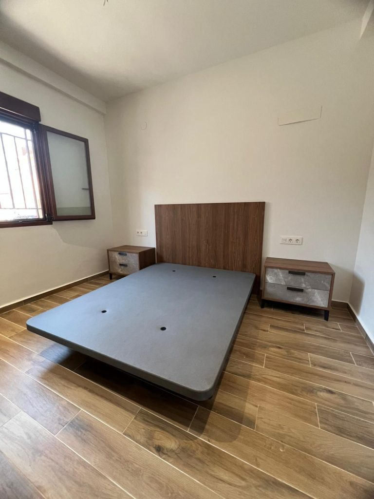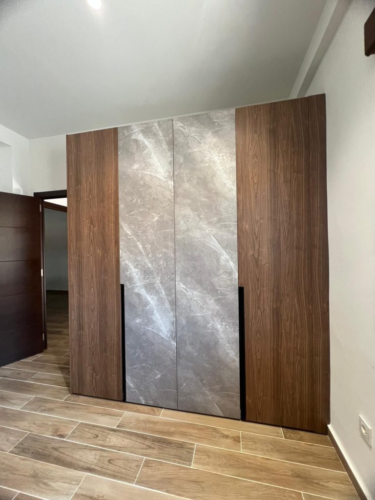 El armario de gran capacidad destaca por su diseño minimalista con tiradores integrados en negro. La cama, con base tapizada en gris oscuro, está acompañada por dos mesas de noche que repiten la misma combinación de materiales del armario, logrando una armonía visual en todo el conjunto. El suelo tipo madera y la luz natural que entra por la ventana refuerzan la calidez del espacio. Ideal para quienes buscan funcionalidad sin renunciar al estilo.