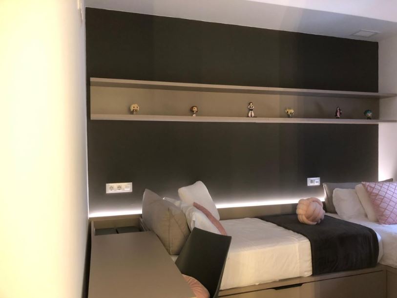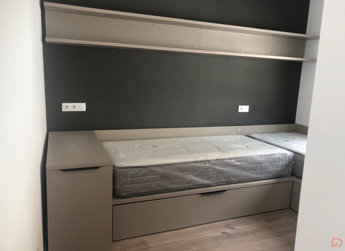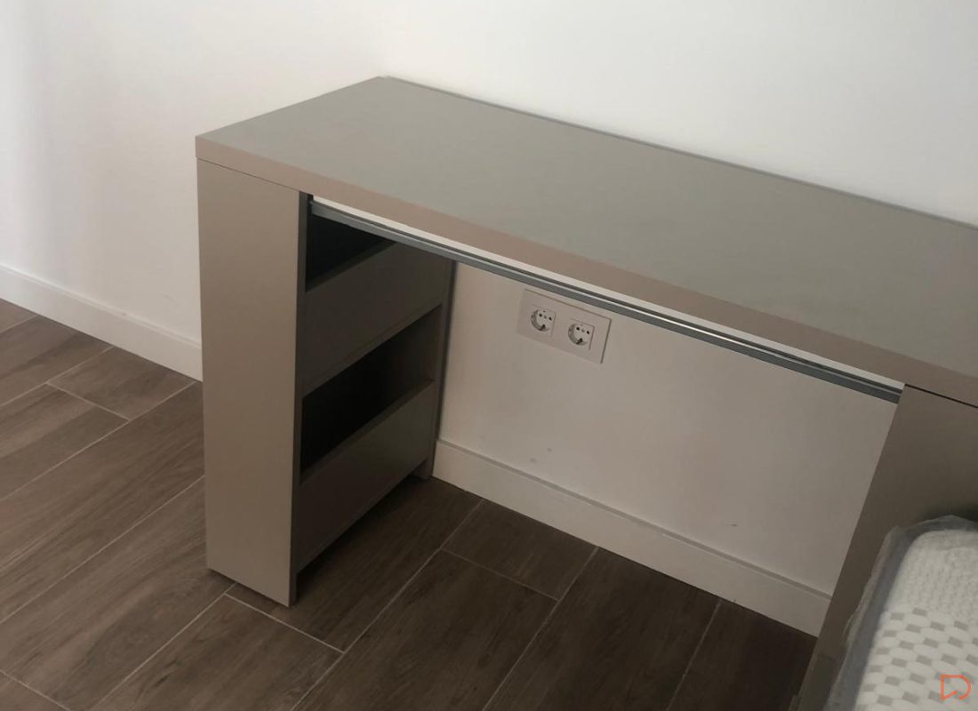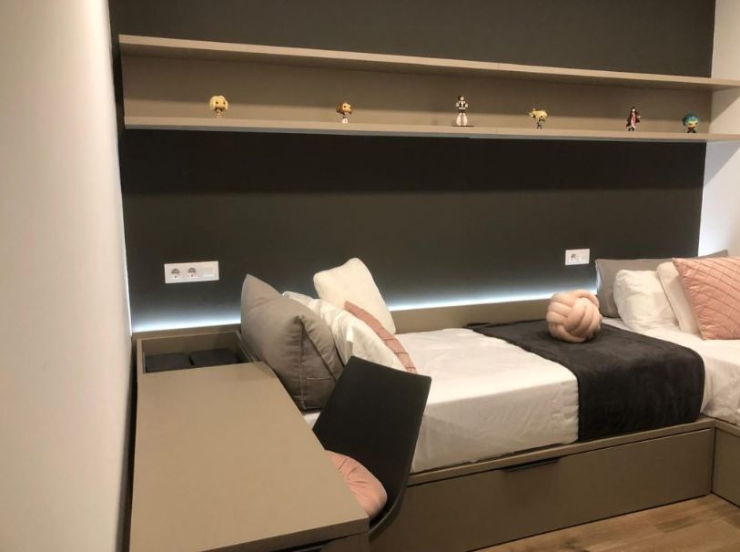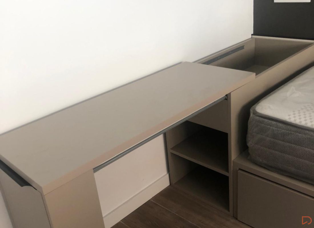 En este proyecto, nuestros clientes requerían un cuarto con área de estudio, añadiendo una encimera a la cama compacta.