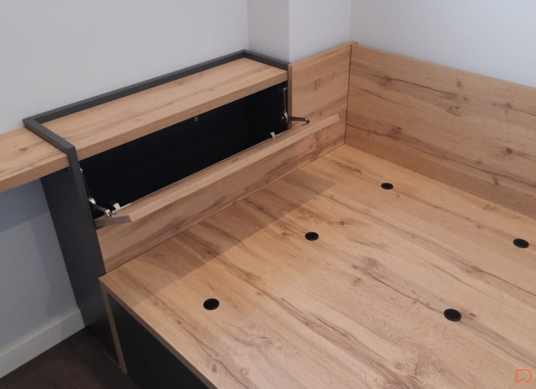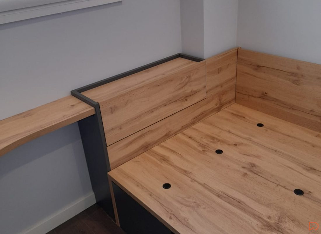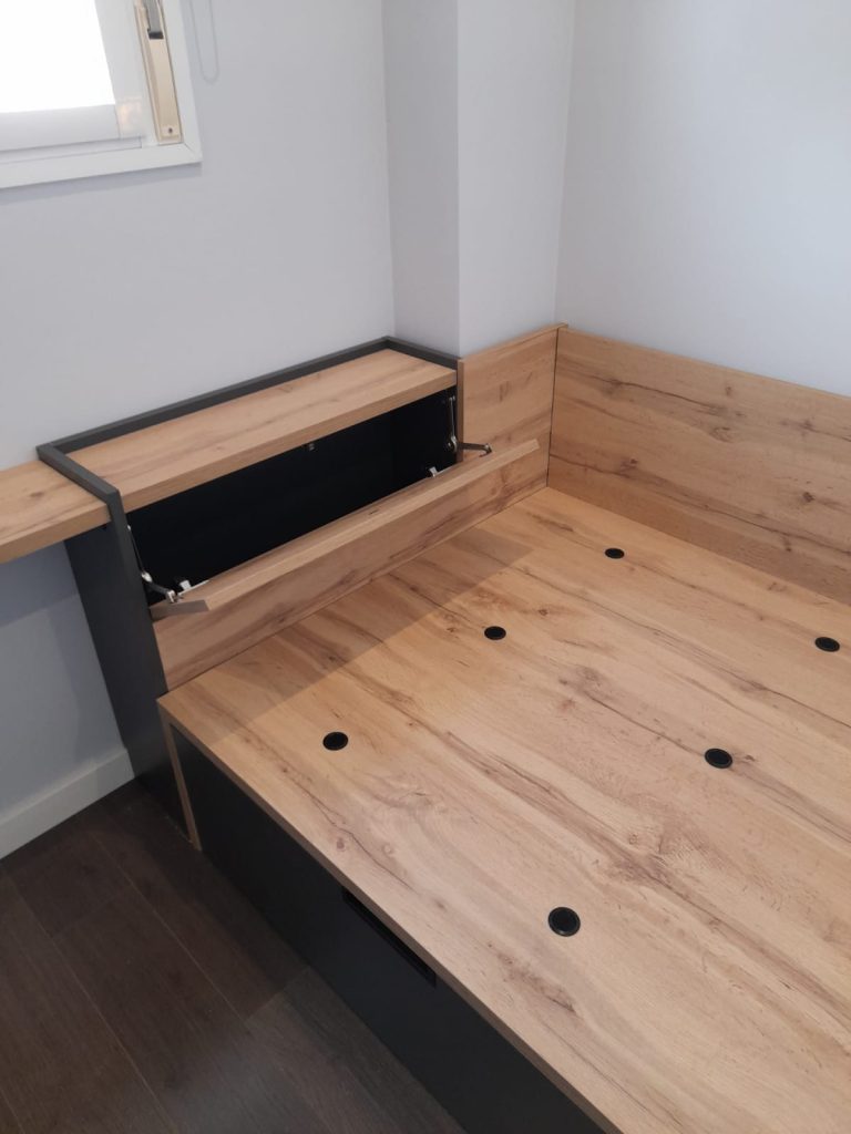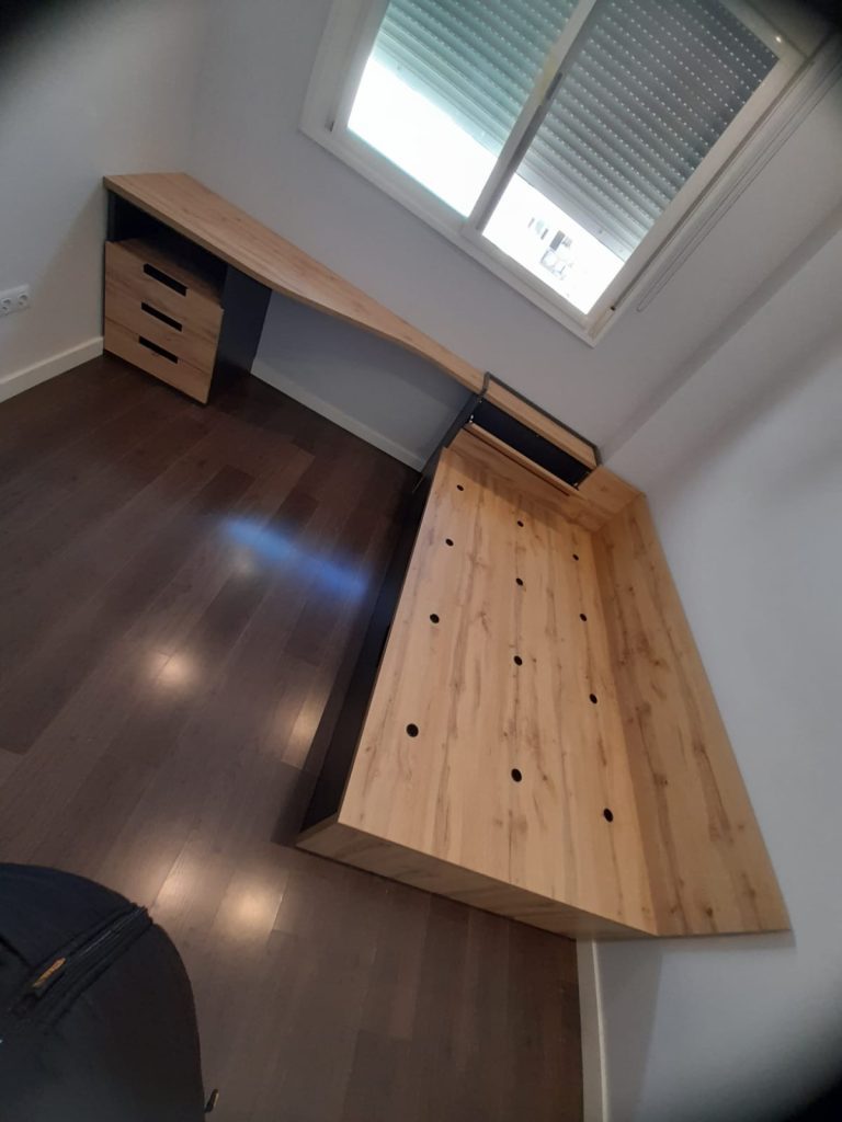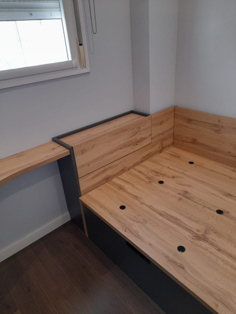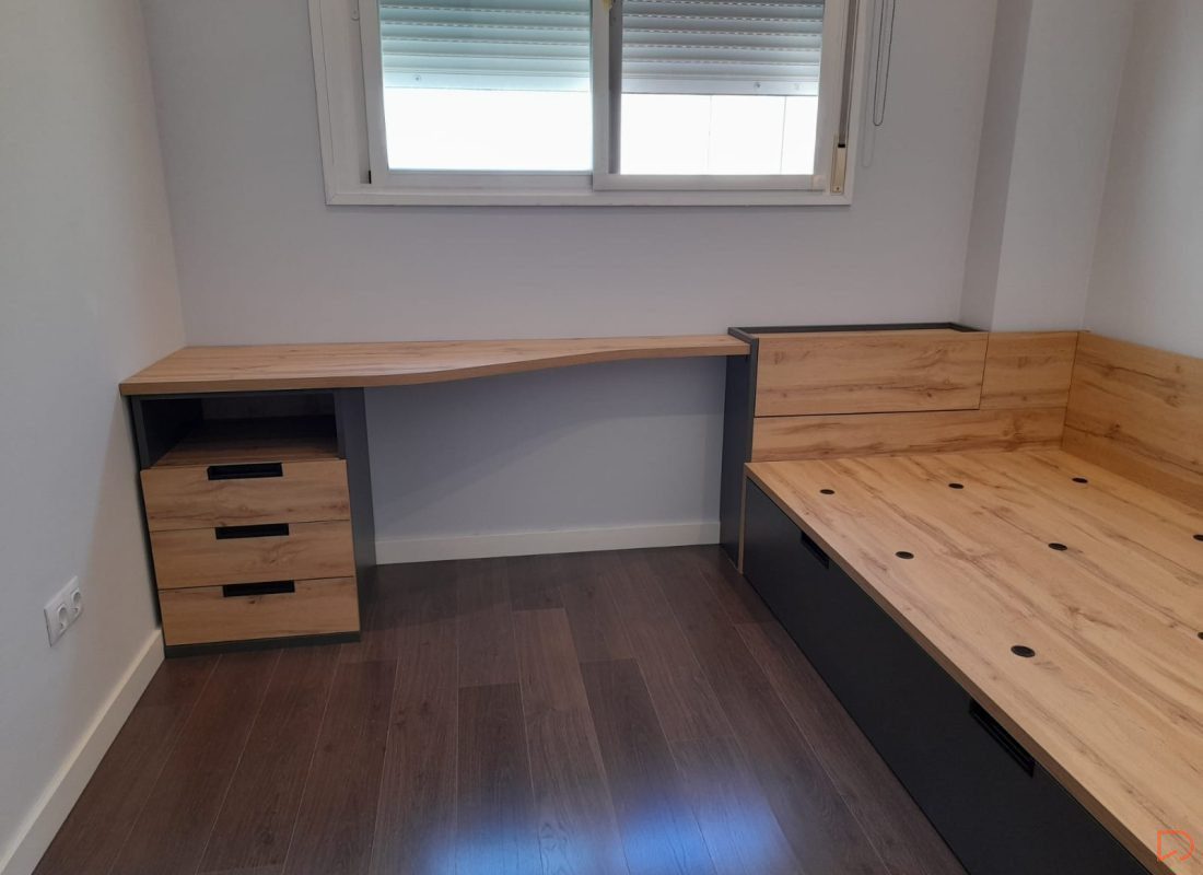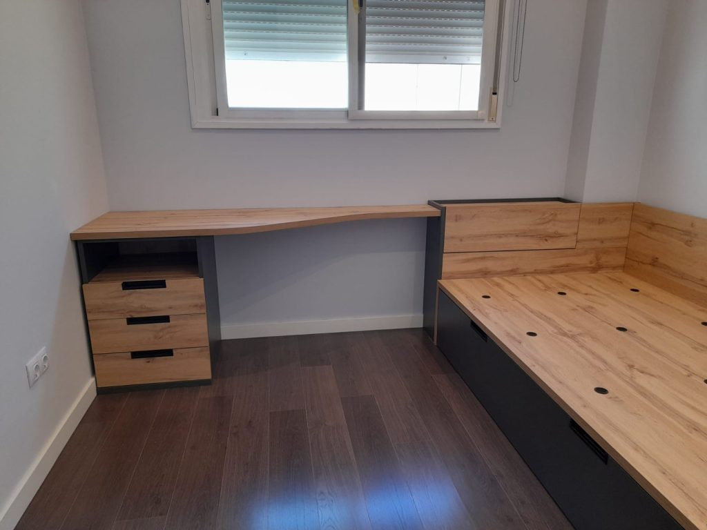 Así de estiloso, elegante y funcional le ha quedado este dormitorio a nuestros clientes, han utilizado los mismos acabados para la zona estudio y la zona descanso.