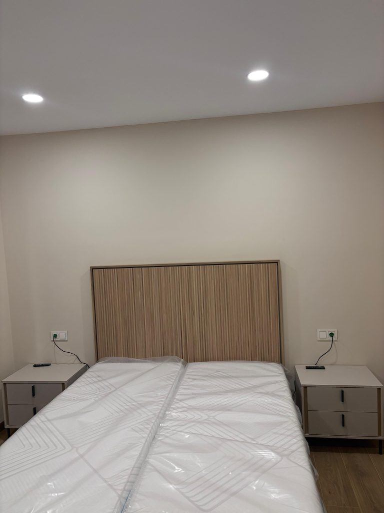 Dormitorio de estilo moderno y minimalista, en tonos neutros. La cama doble presenta un cabecero de madera con vetas verticales, acompañado por dos mesillas a juego de líneas rectas y acabado claro. El conjunto se completa con un xinfonier coordinado, manteniendo una estética uniforme, elegante y funcional. Iluminación empotrada en el techo que refuerza el ambiente limpio y actual.