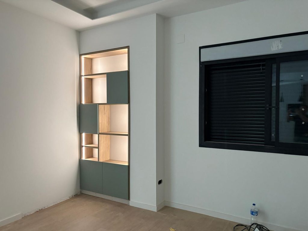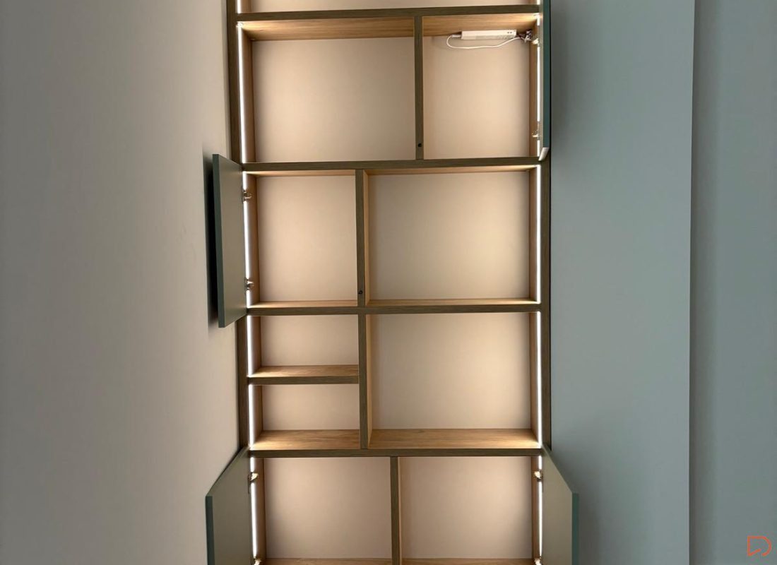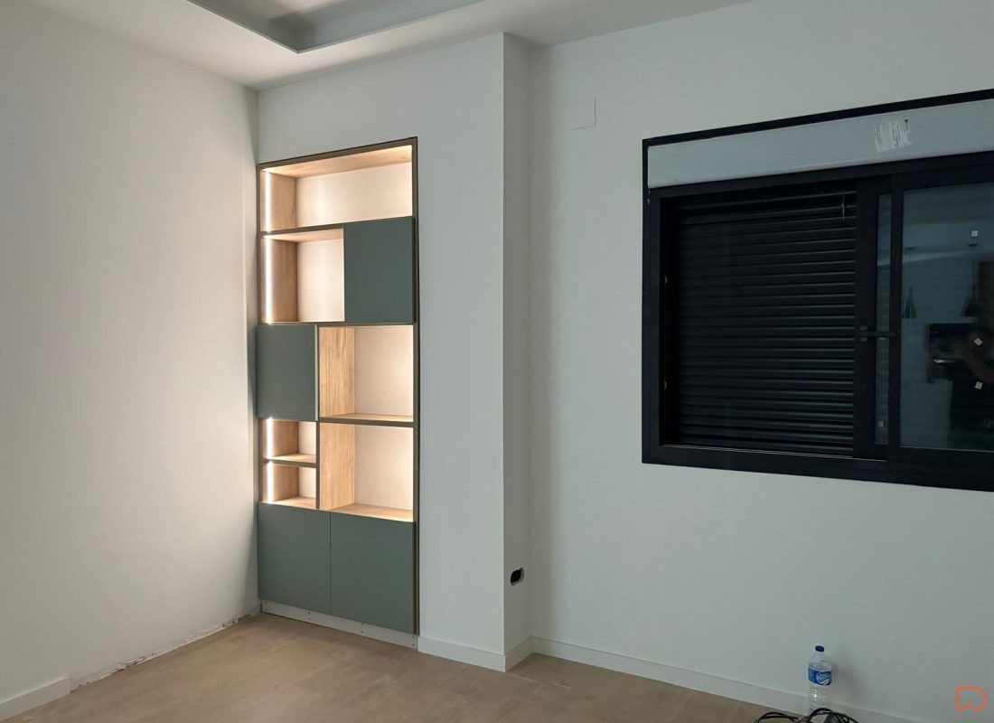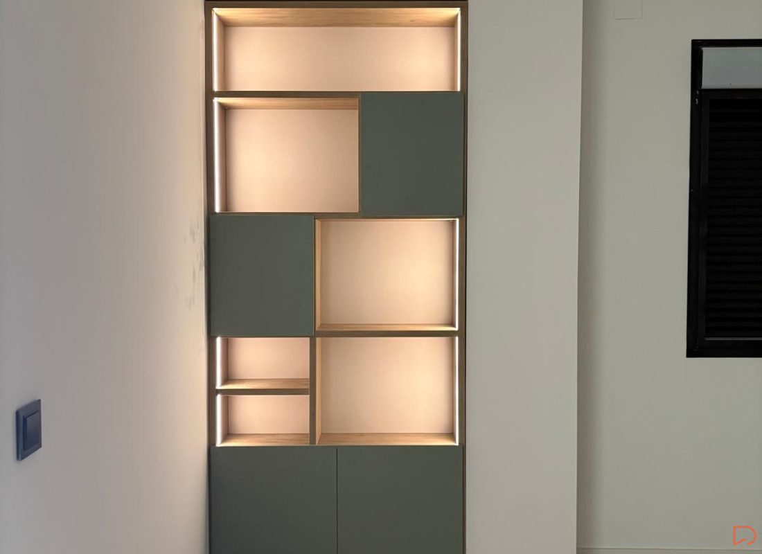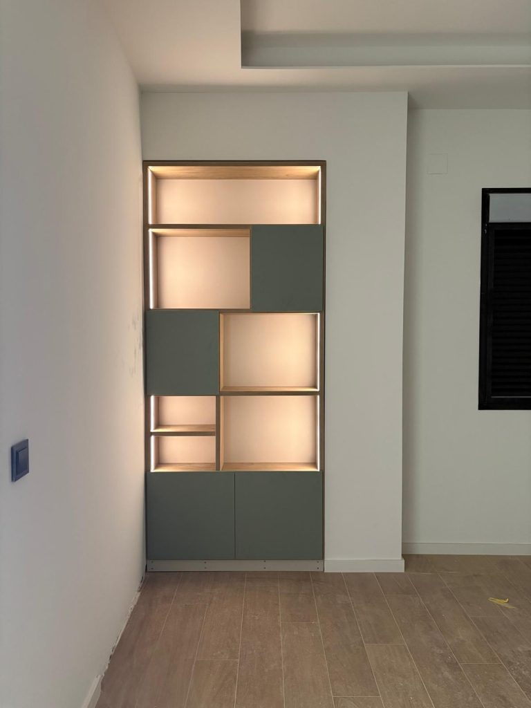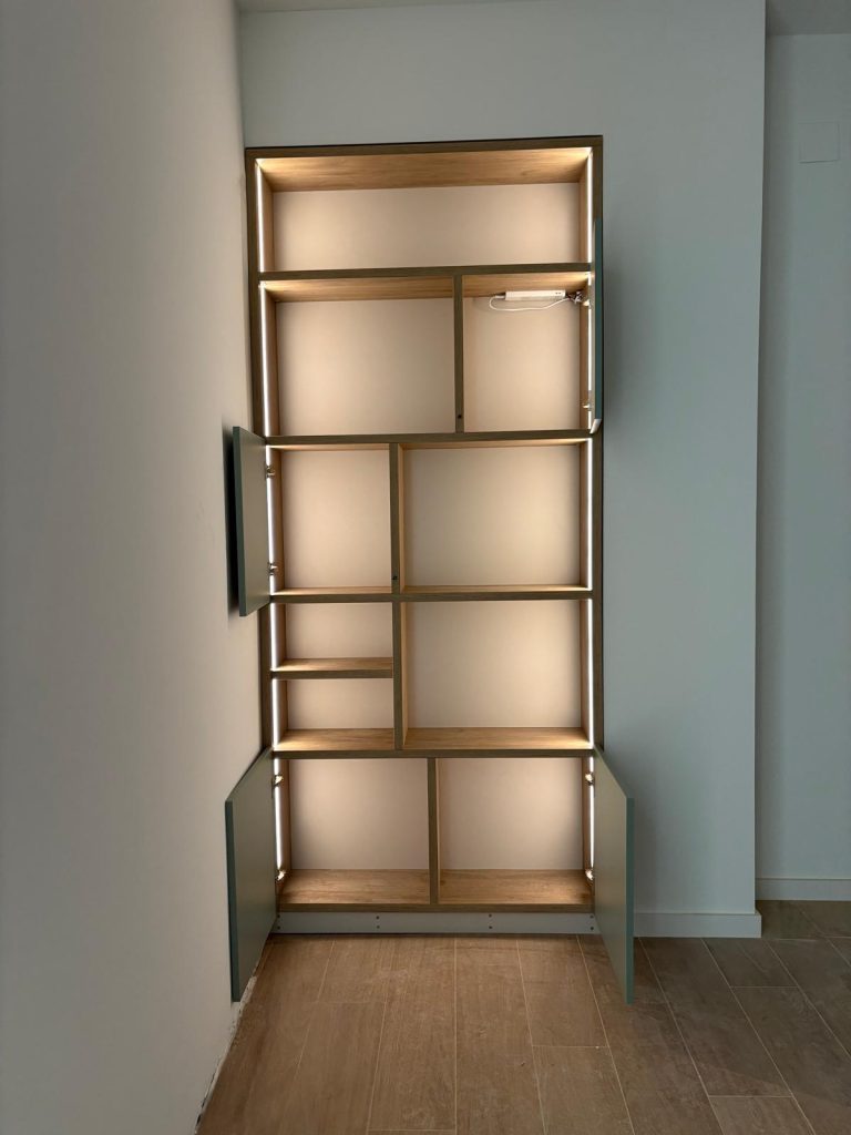 Estantería a medida para hueco, integrada con led y distribución elegida por el cliente.