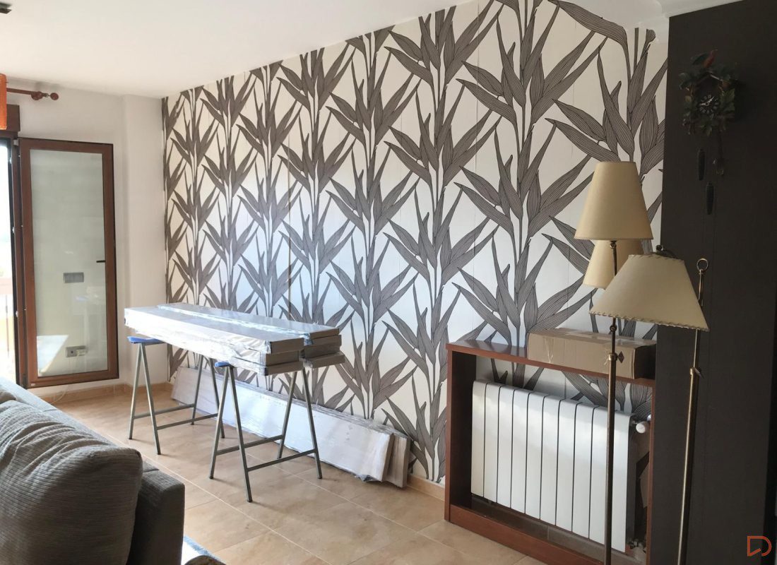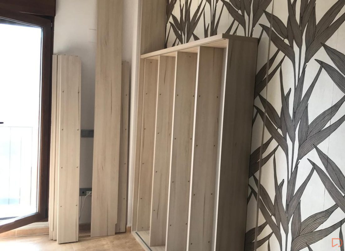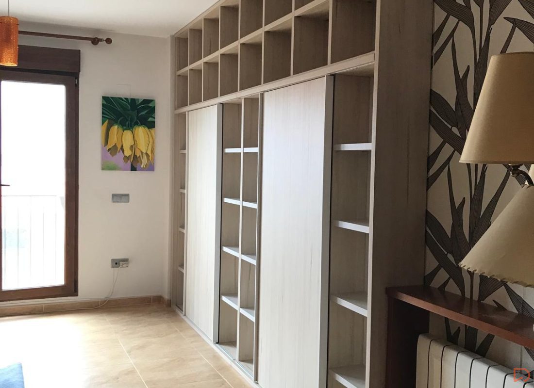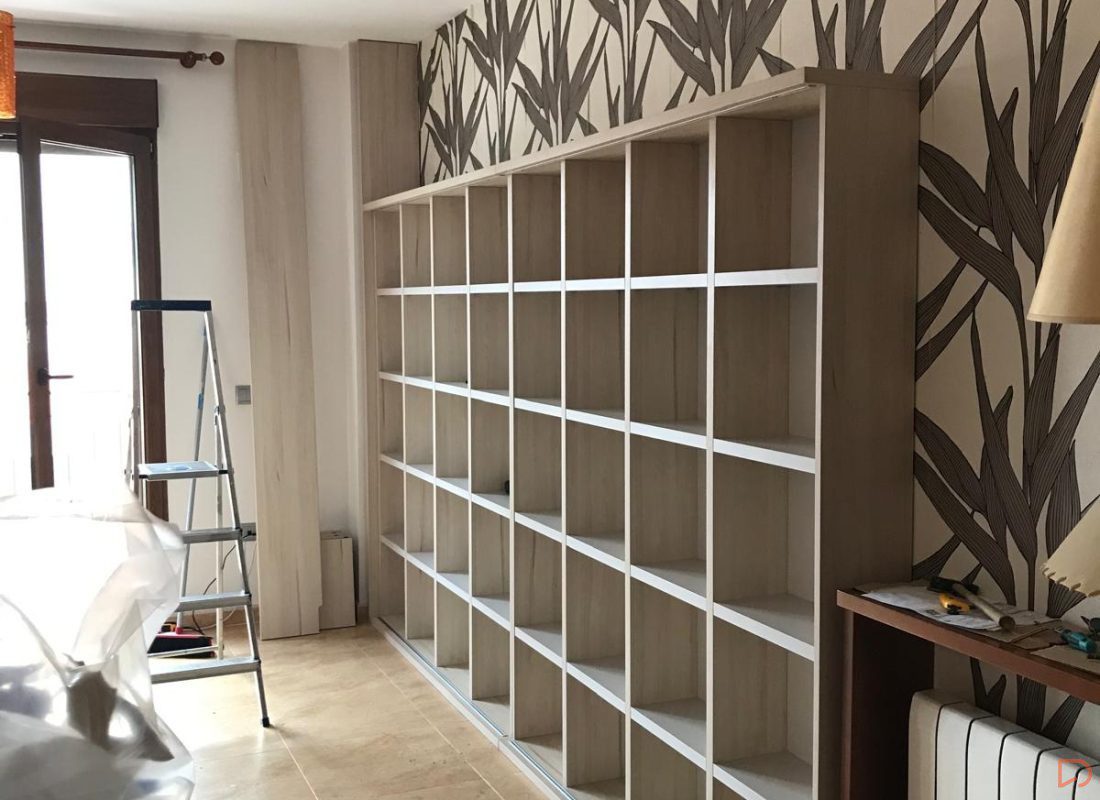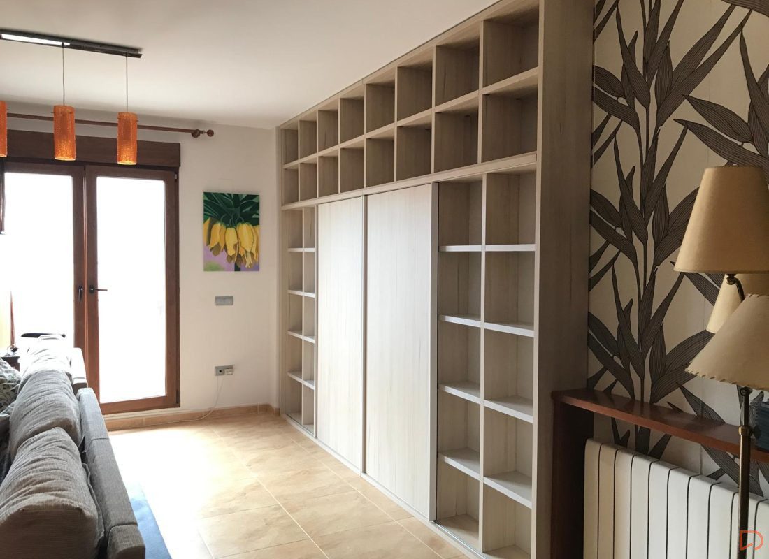 Medimos toda la pared y diseñamos una estantería con 8 cuerpos, utilizando un tono nuez aportando calidez, haciendo así destacar las puertas correderas en blanco, evitando la acumulación de polvo en la parte baja.