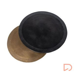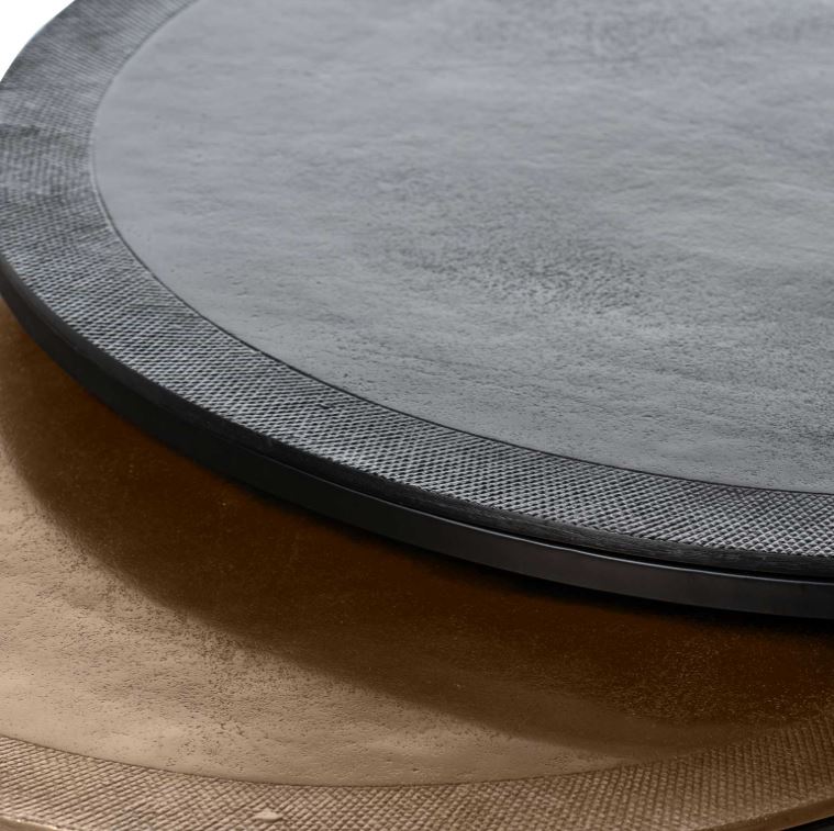Ambas mesas están fabricadas en aluminio, lo que garantiza ligereza, durabilidad y una estética refinada. Una de ellas presenta un acabado en tono negro mate, mientras que la otra luce un elegante dorado, creando un contraste sofisticado y atemporal.