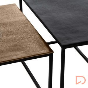 La estructura metálica en un sobrio color negro aporta estabilidad y un aire contemporáneo, mientras que las tapas de aluminio en tonos dorado crean un contraste sofisticado y audaz.