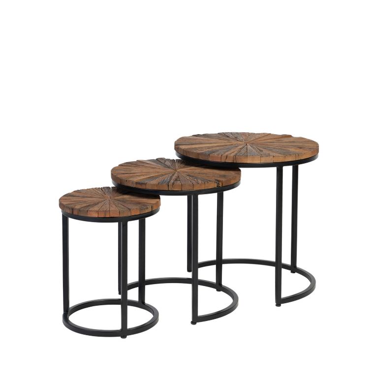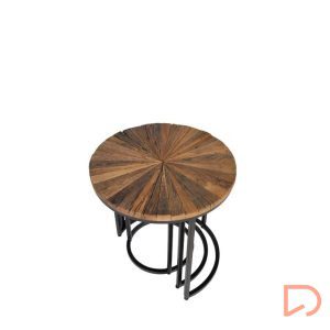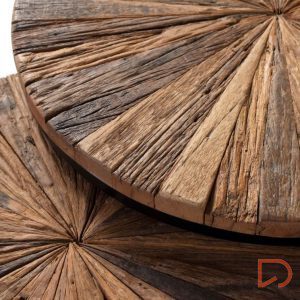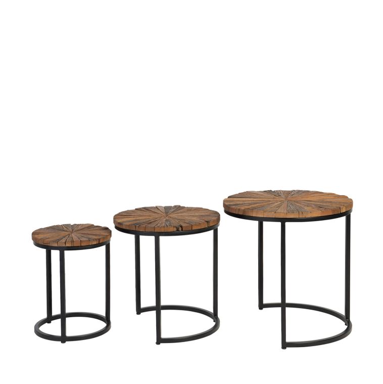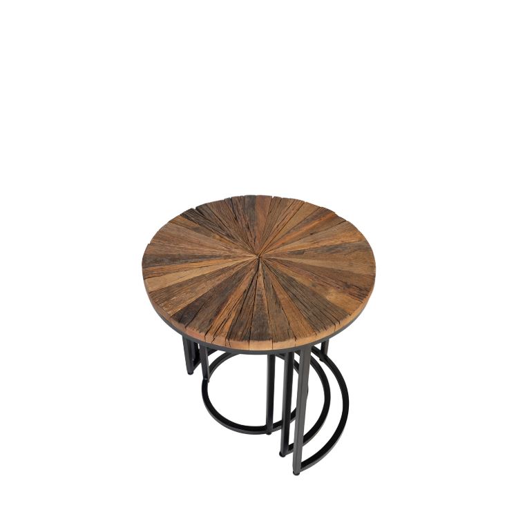 - Cada mesa presenta una tapa circular de madera reciclada, resaltando la belleza natural y la textura única de la madera. Las patas, hechas de hierro lacado en negro mate, aportan un toque moderno y elegante.