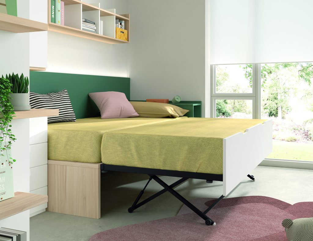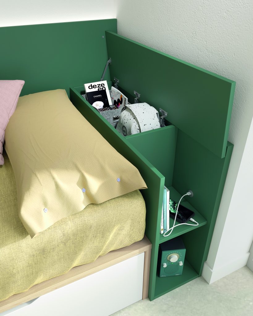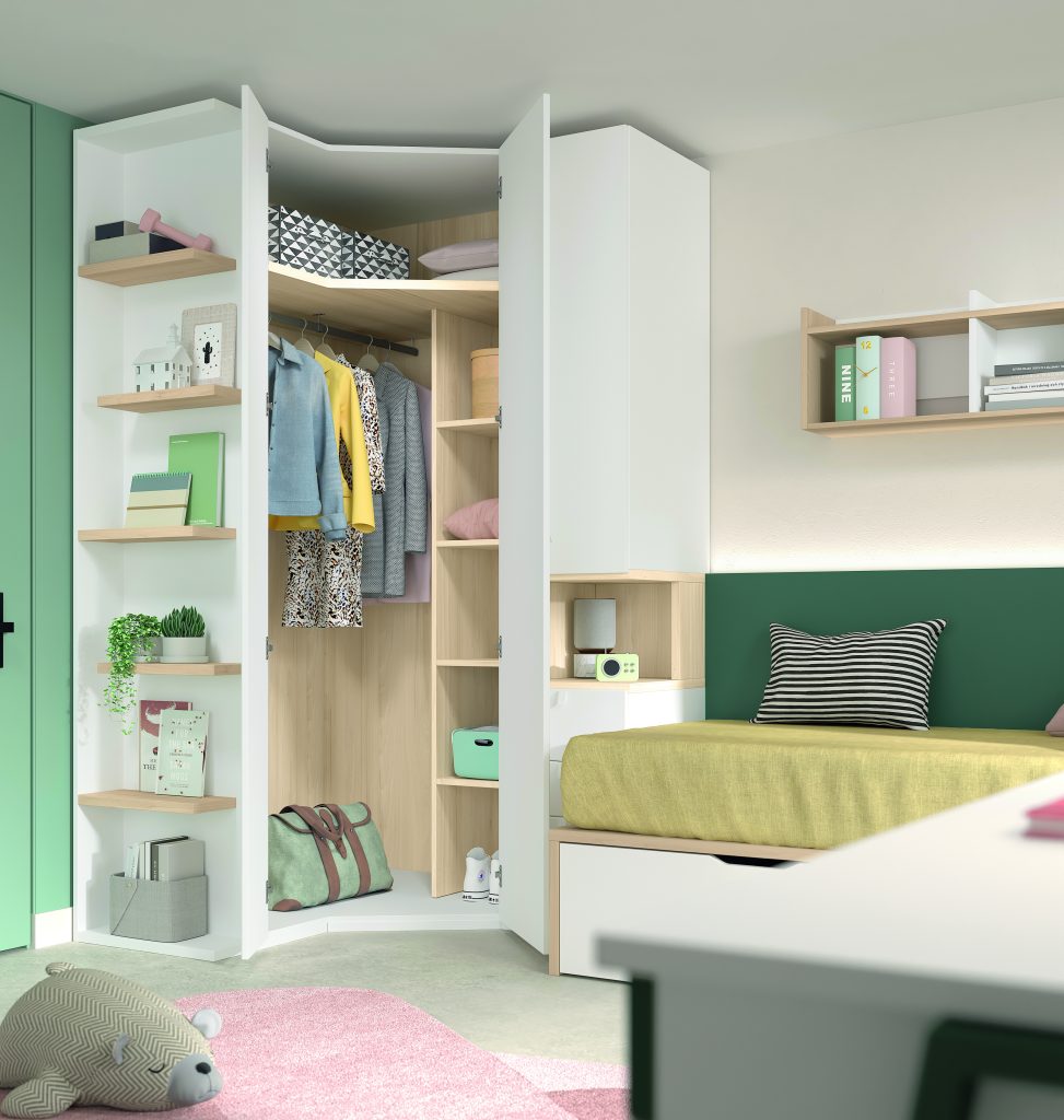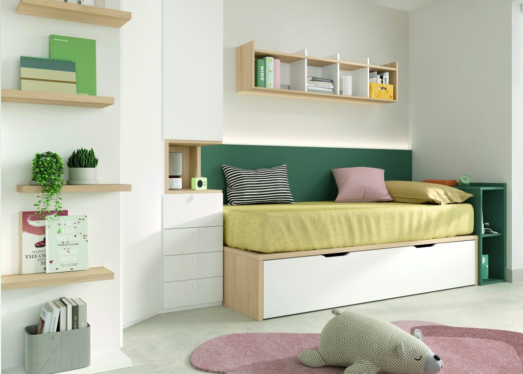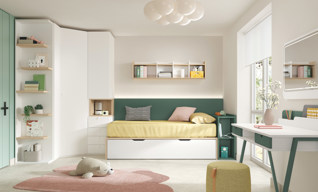 Conjunto juvenil funcional compuesto por compacto con somier de arrastre premium, armarios modulares con rinconera chaflán y zona de estudio con escritorio de dos cajones y espejo retroiluminado. Incluye arcón cabecero abatible y bandeja metálica revistero con pasa cables.