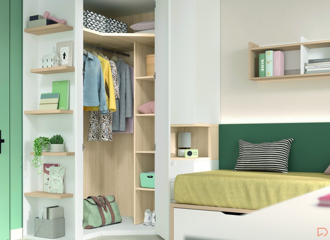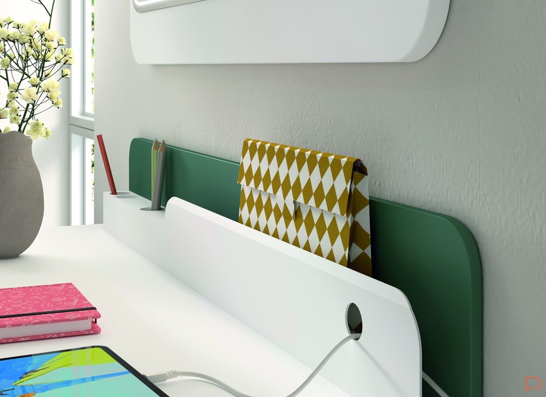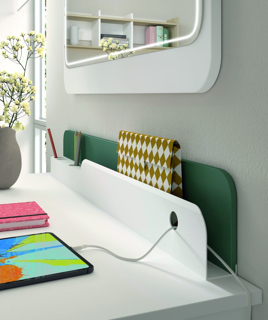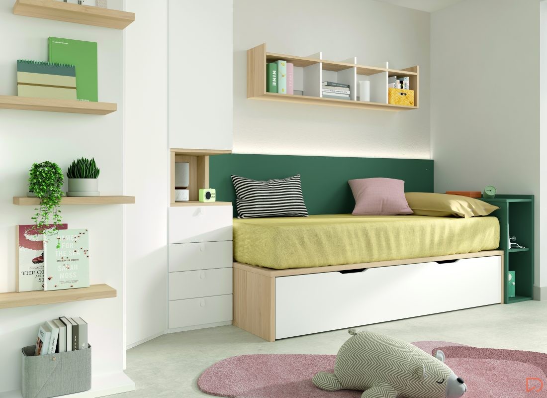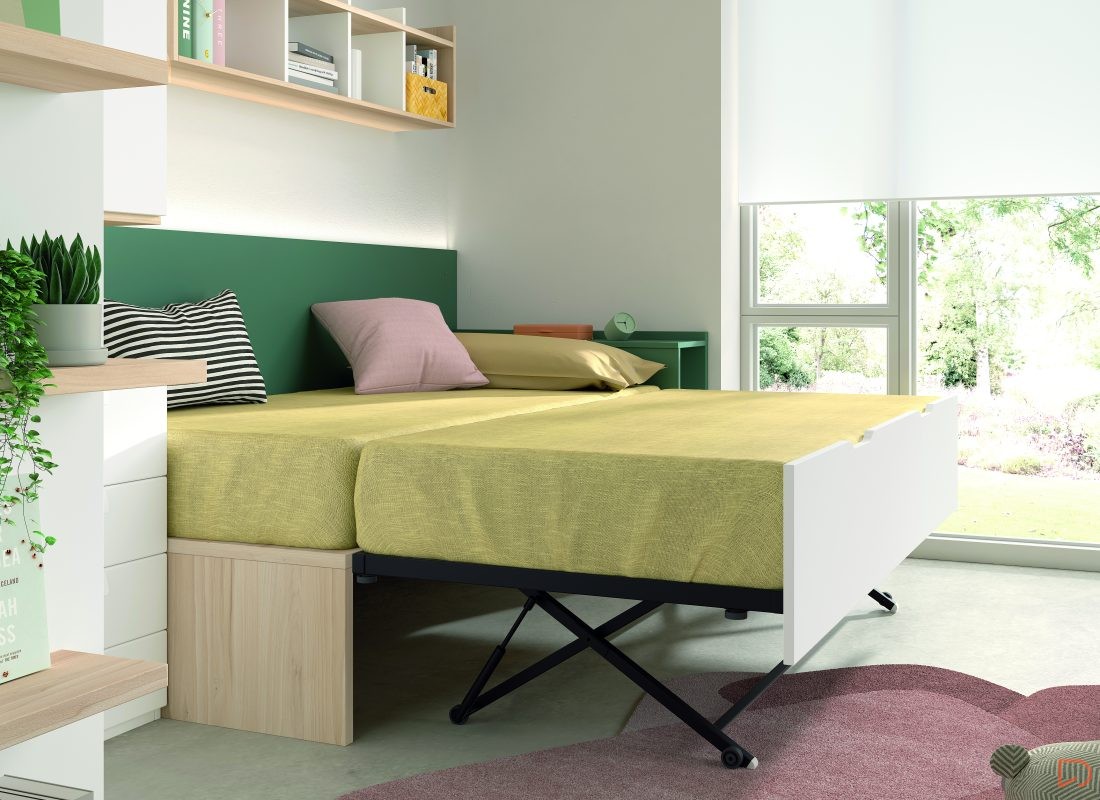 Conjunto juvenil funcional compuesto por compacto con somier de arrastre premium, armarios modulares con rinconera chaflán y zona de estudio con escritorio de dos cajones y espejo retroiluminado. Incluye arcón cabecero abatible y bandeja metálica revistero con pasa cables.