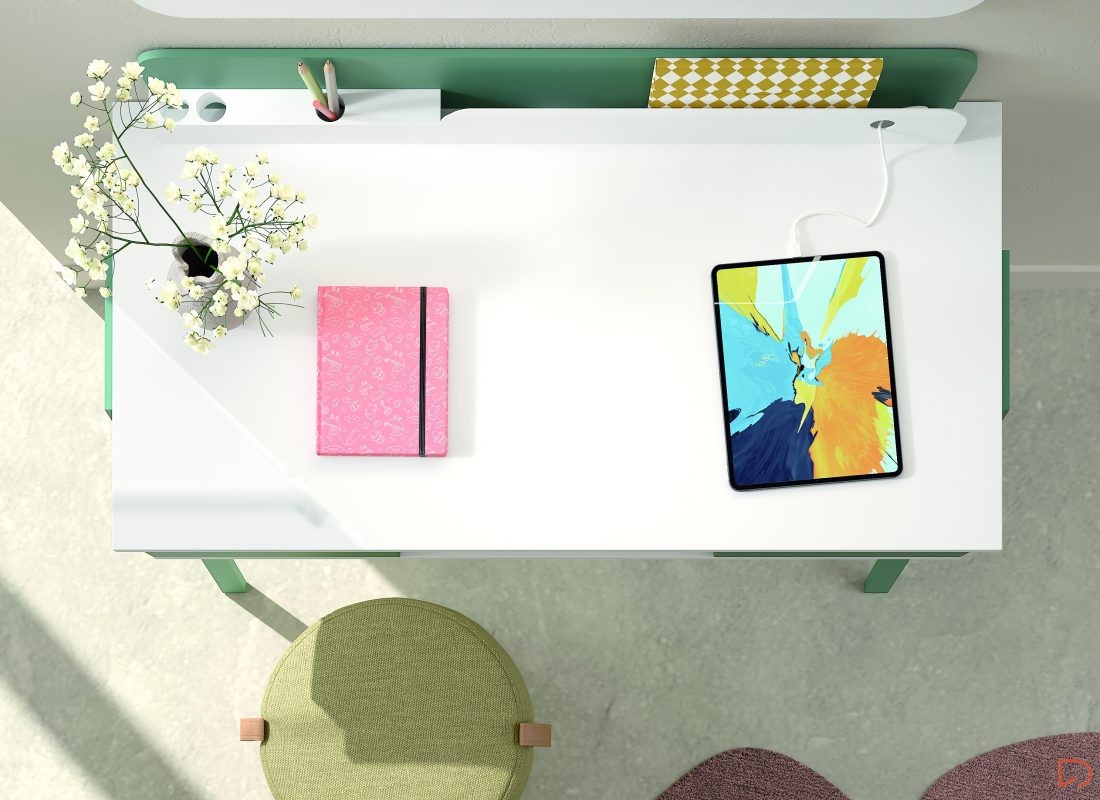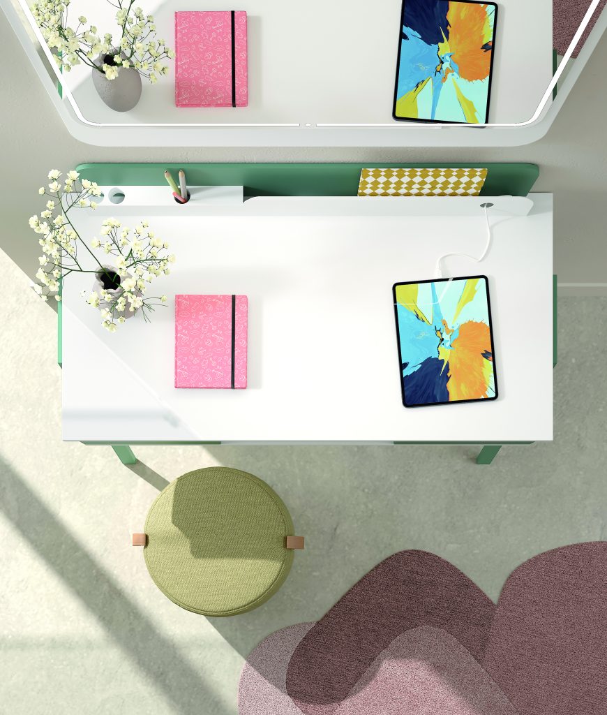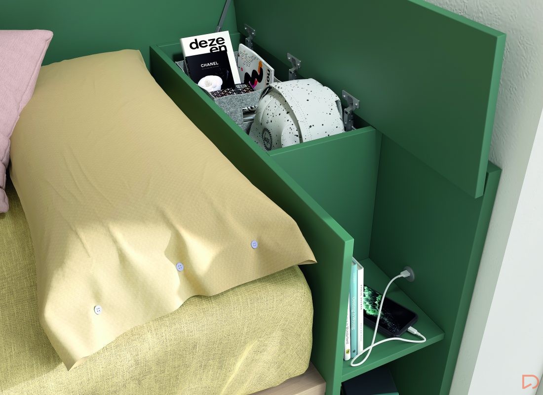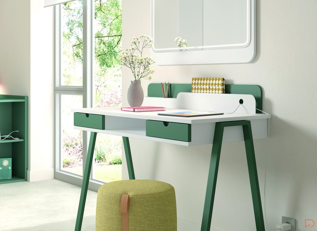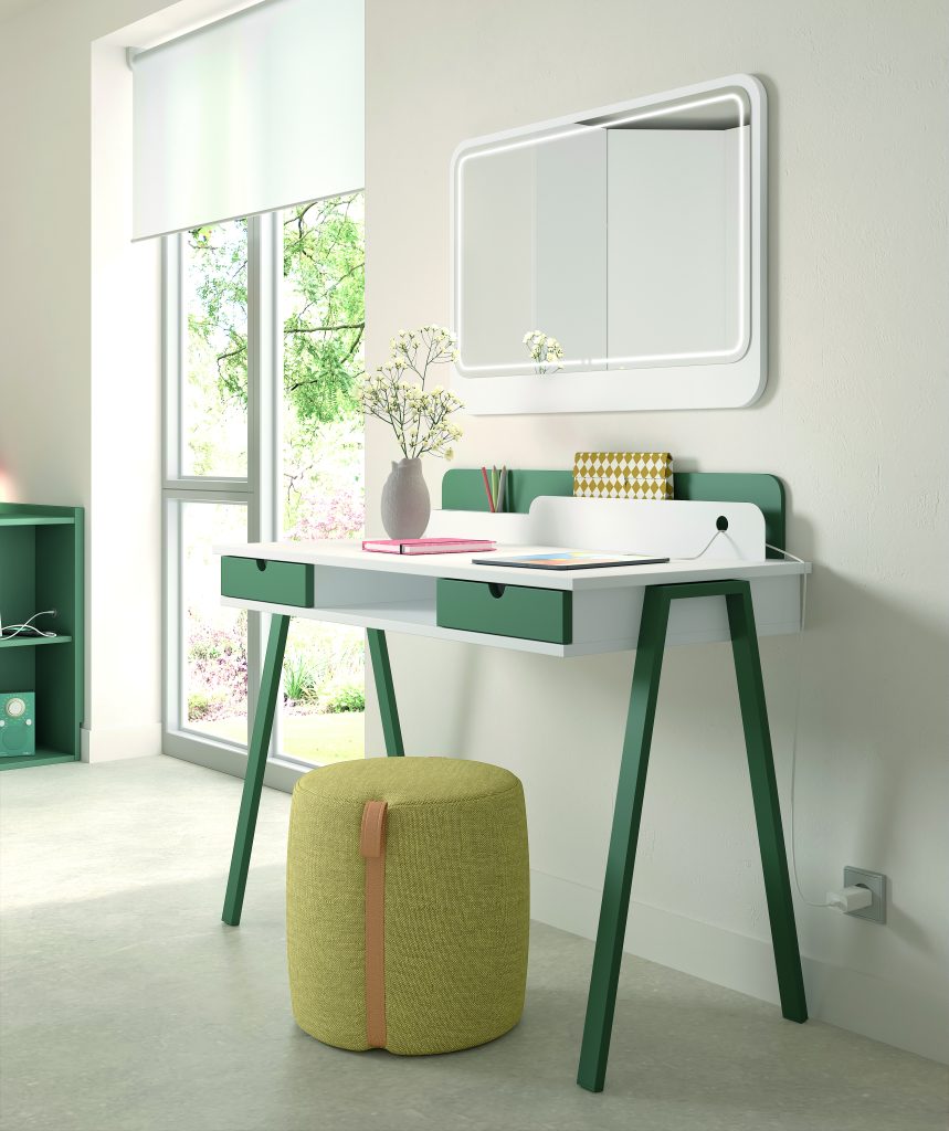 Conjunto juvenil funcional compuesto por compacto con somier de arrastre premium, armarios modulares con rinconera chaflán y zona de estudio con escritorio de dos cajones y espejo retroiluminado. Incluye arcón cabecero abatible y bandeja metálica revistero con pasa cables.