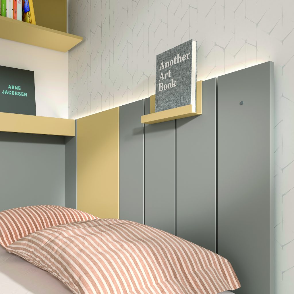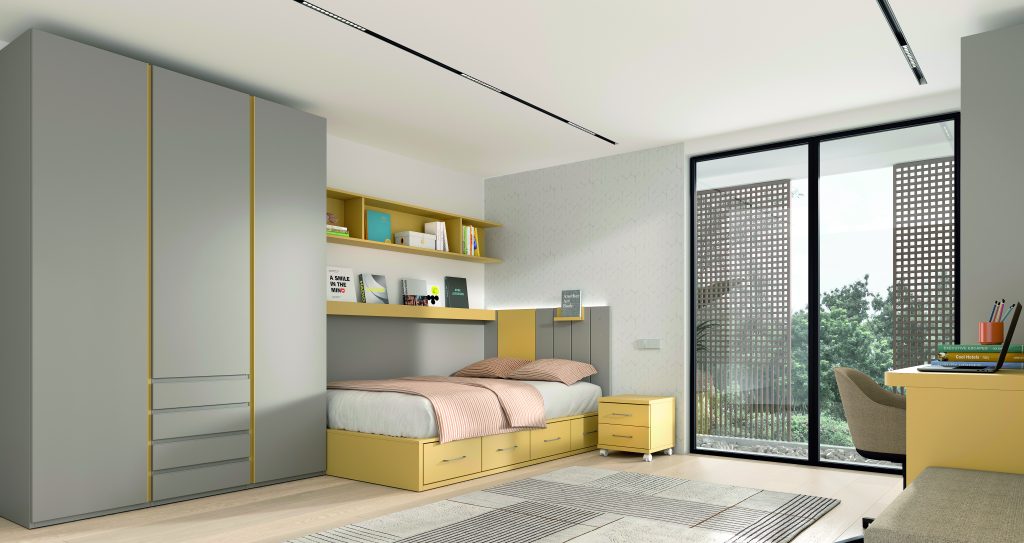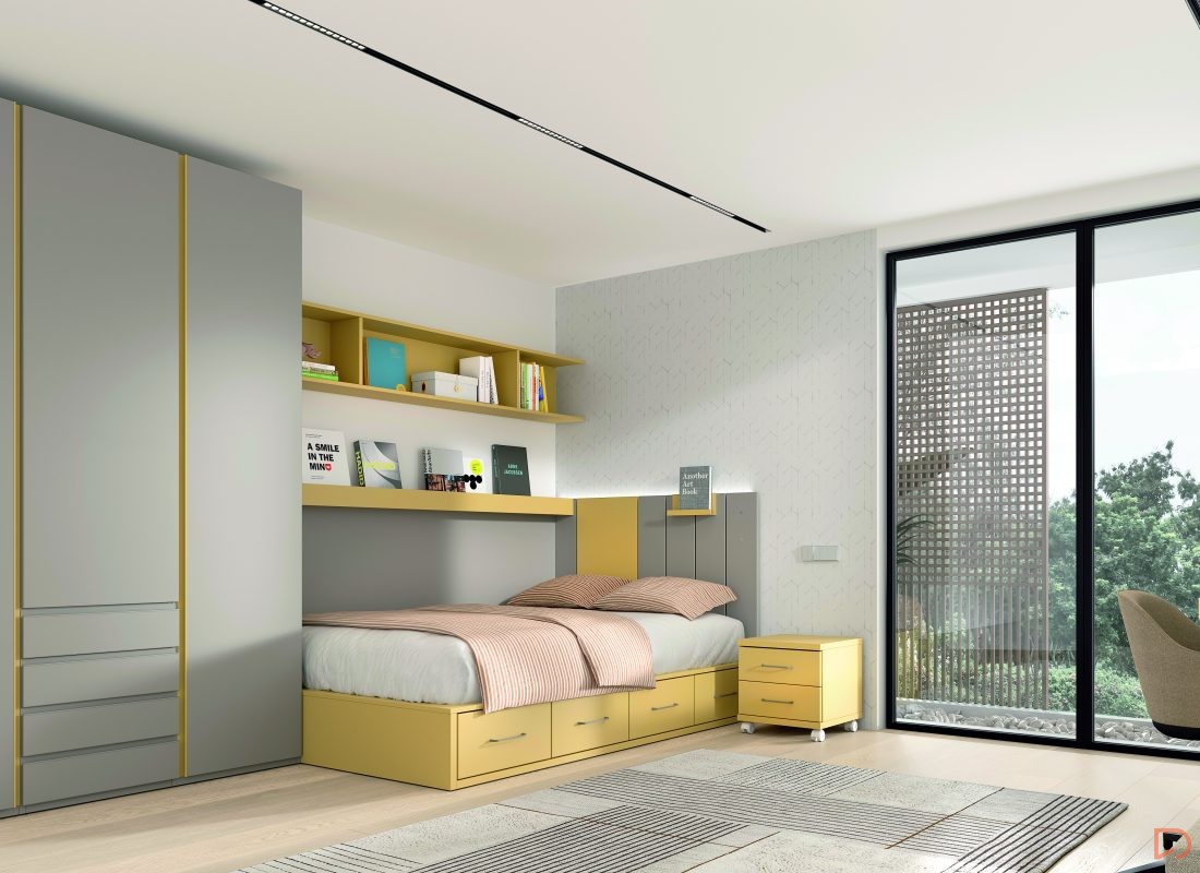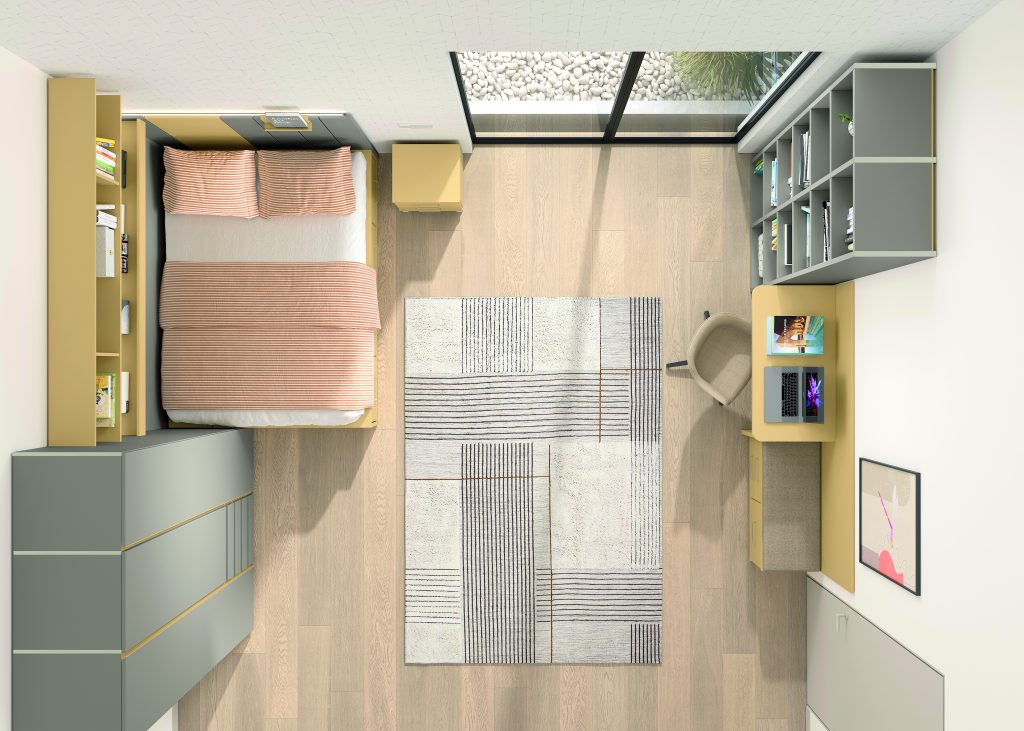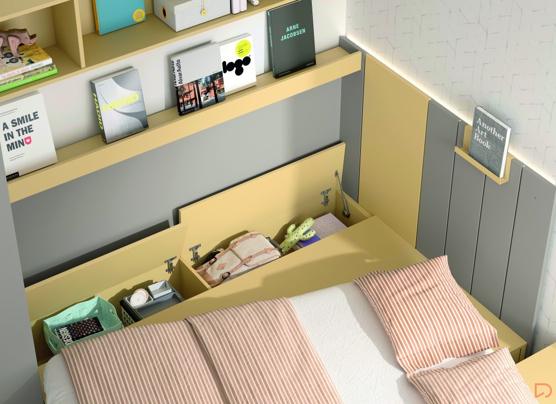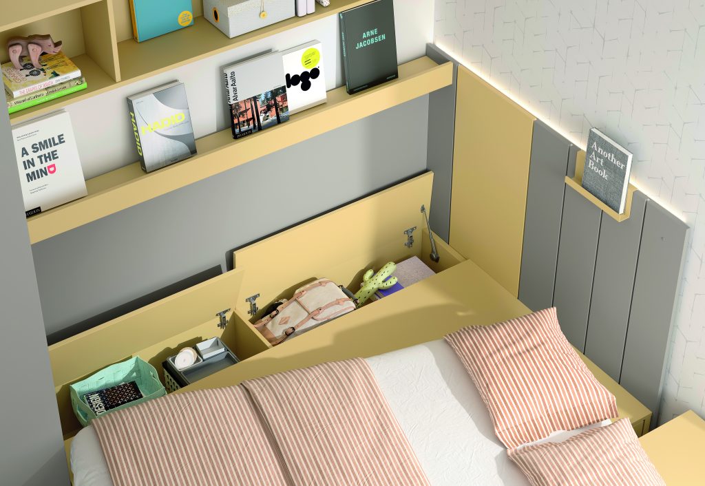 Dormitorio compacto de gran capacidad con cuatro contenedores y dos arcones traseros. Armario triple con cajonera, cabecero con iluminación LED y estanterías modulares con encimera metálica y zona de estudio integrada.