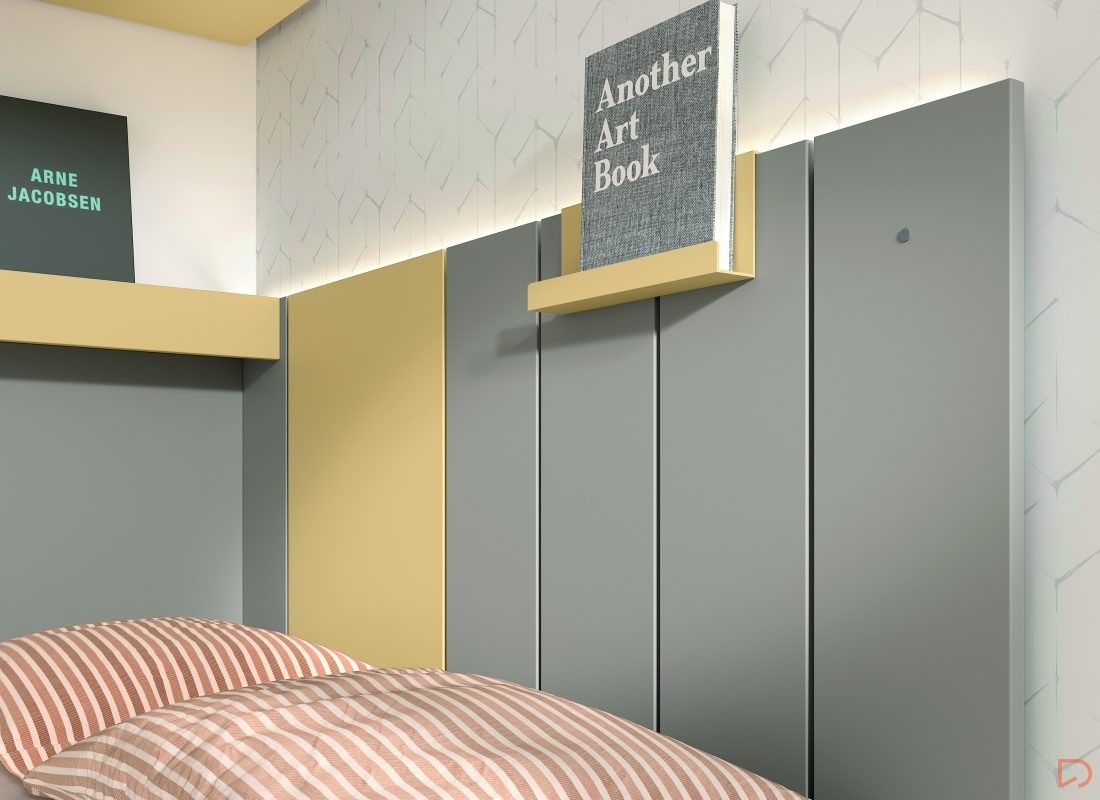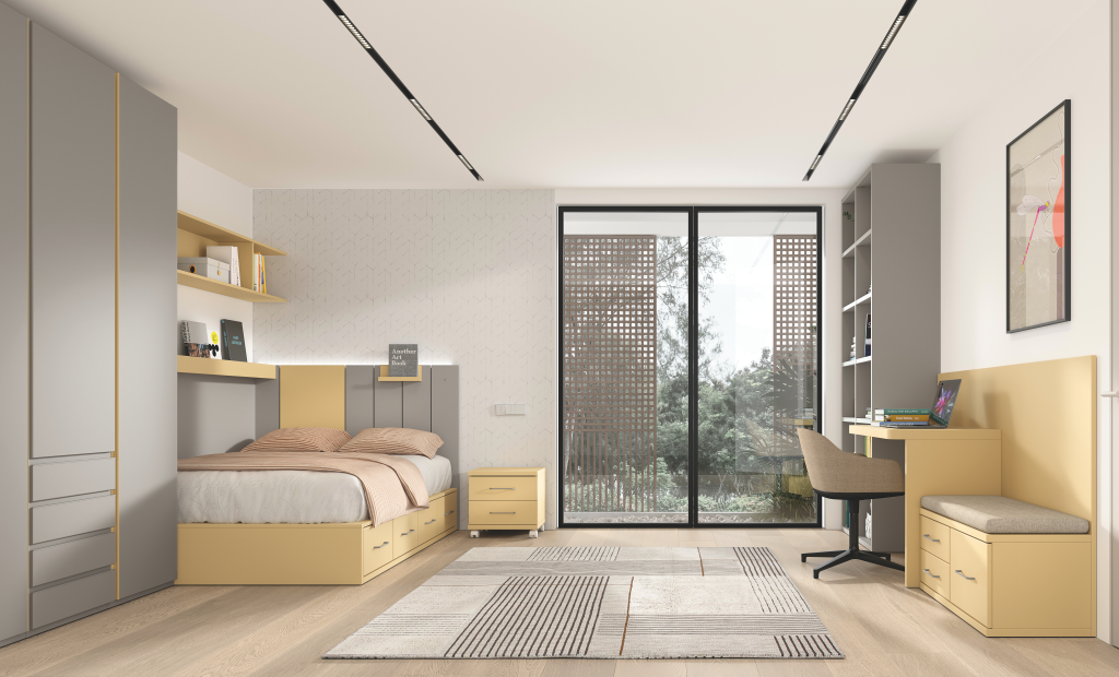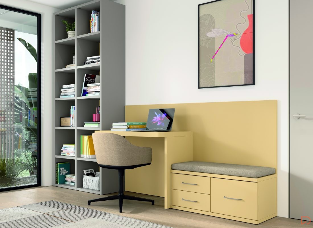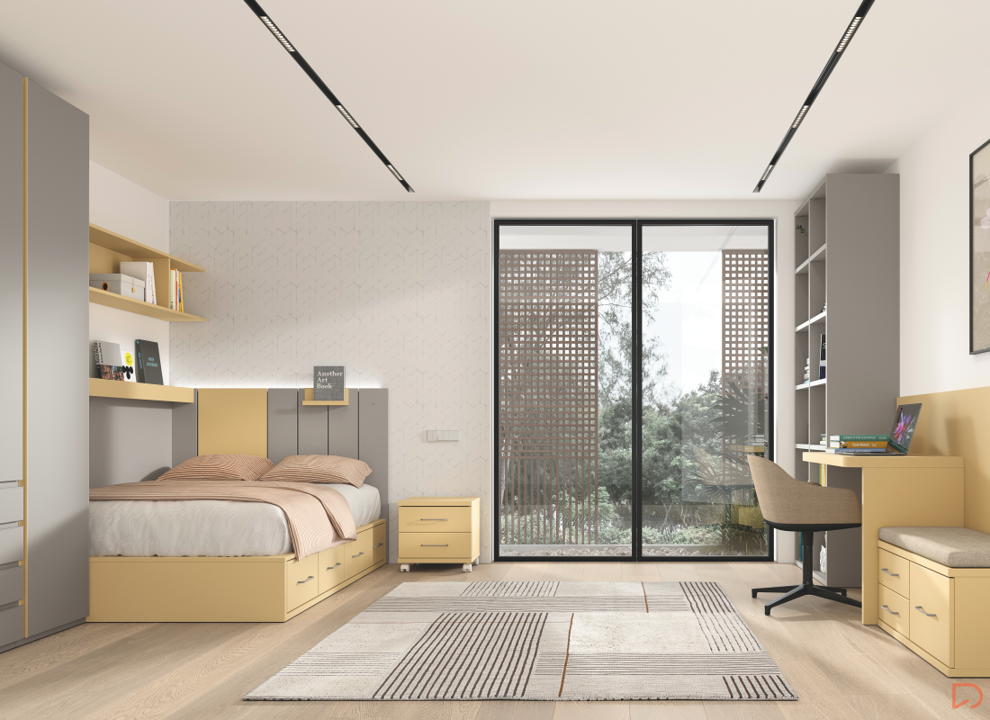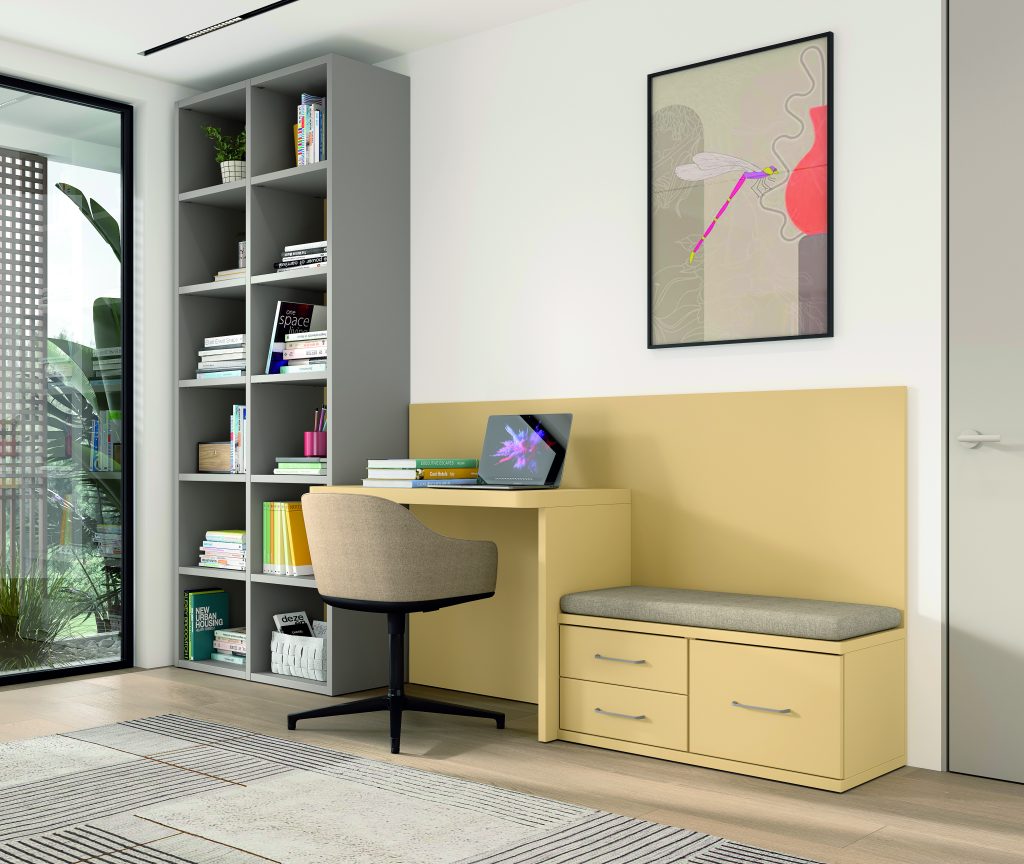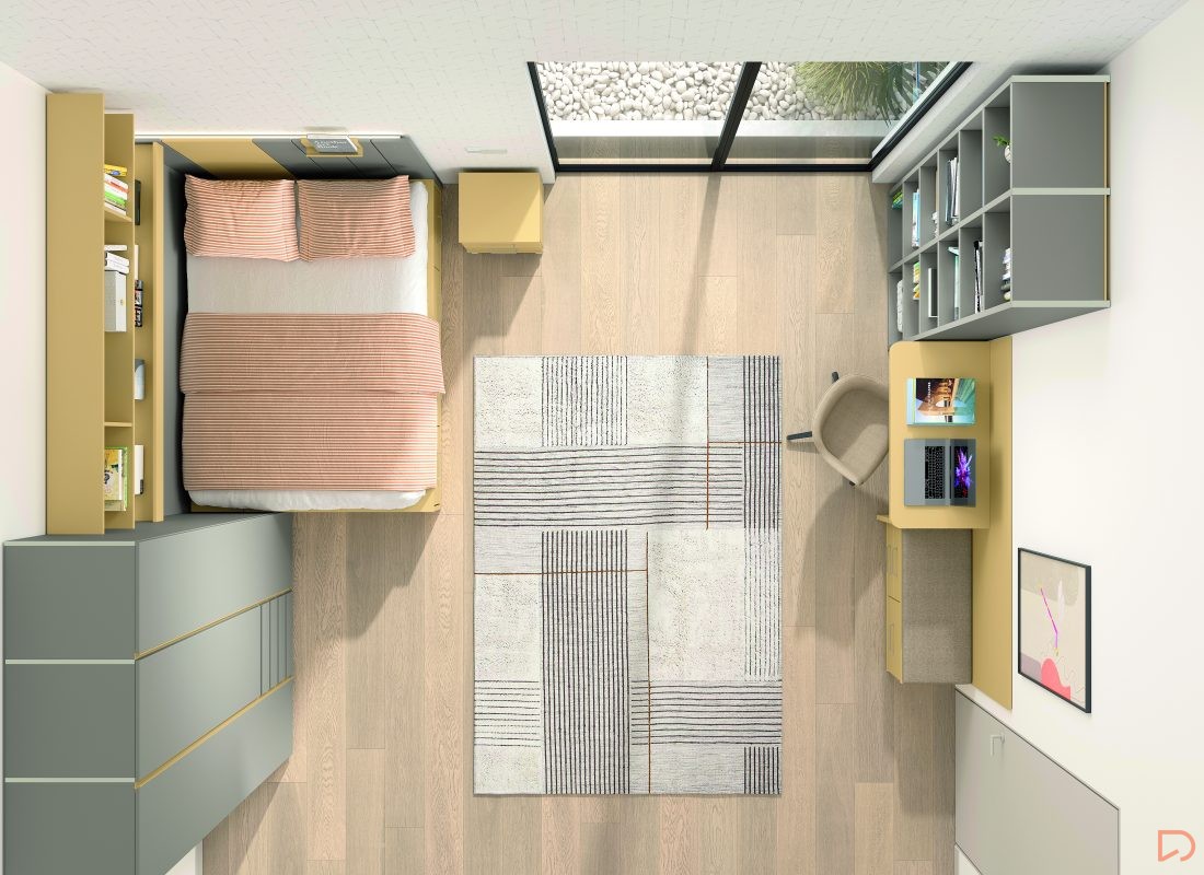 Dormitorio compacto de gran capacidad con cuatro contenedores y dos arcones traseros. Armario triple con cajonera, cabecero con iluminación LED y estanterías modulares con encimera metálica y zona de estudio integrada.