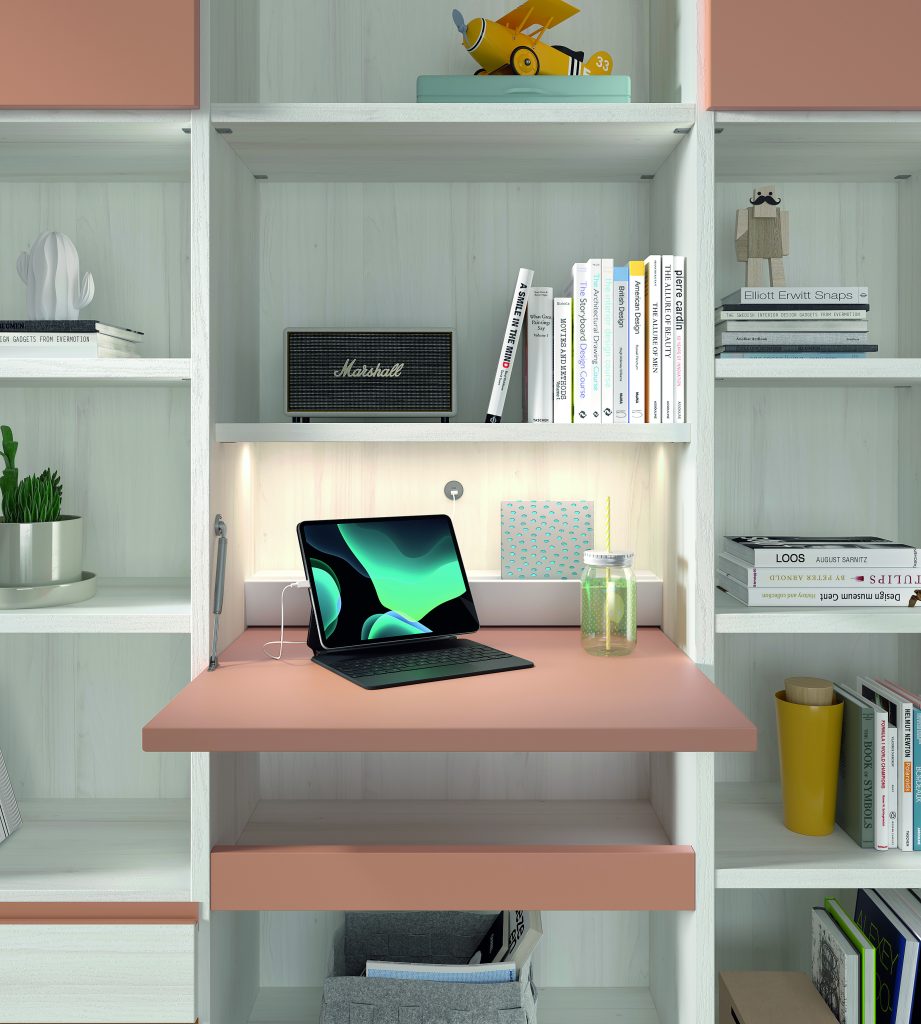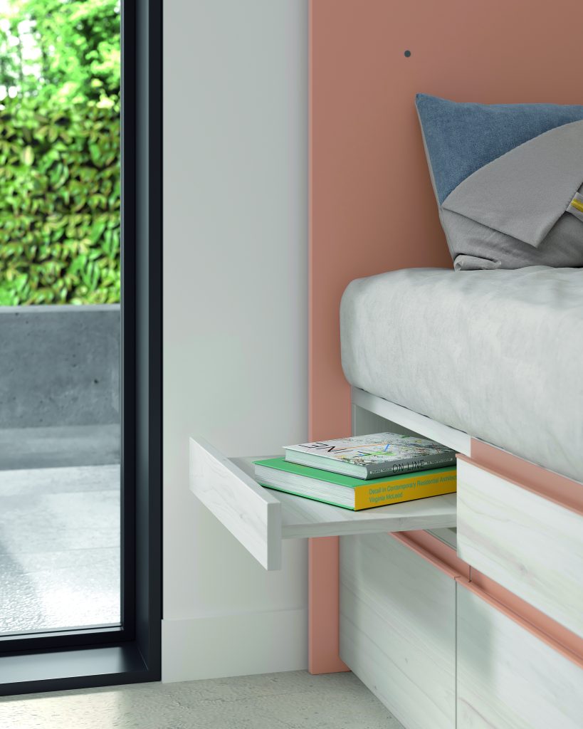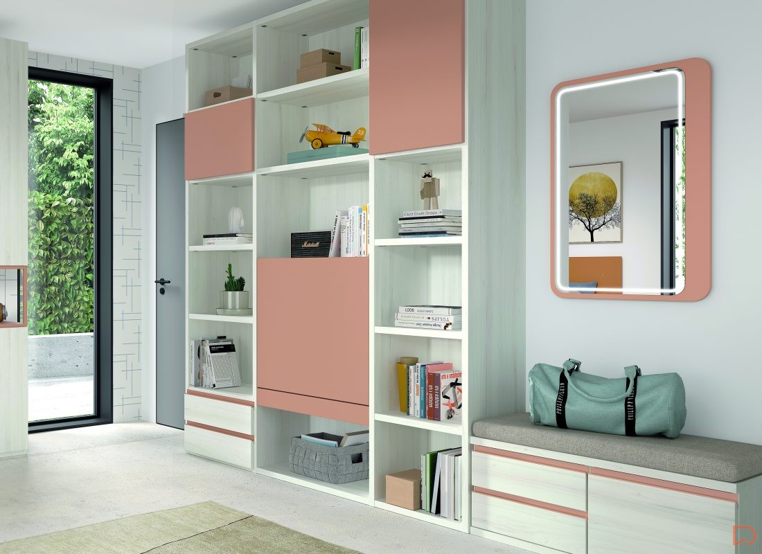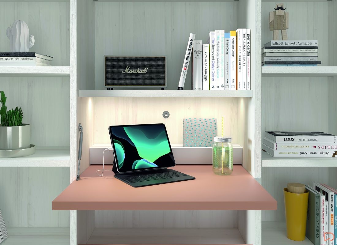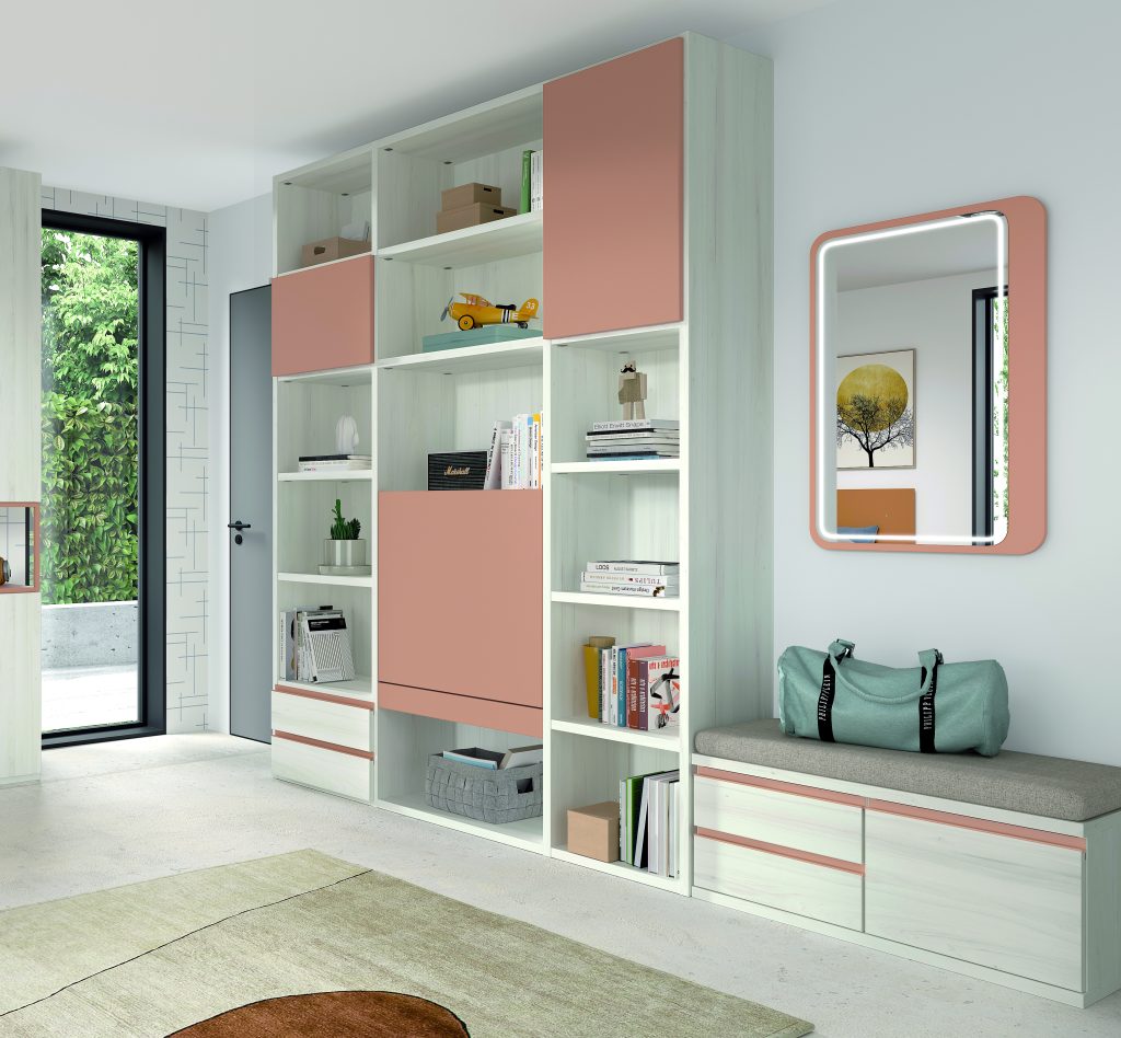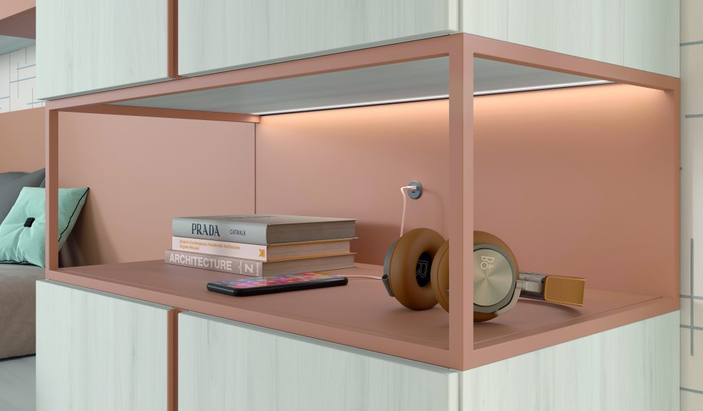 Diseño con personalidad, compuesto por módulos apilables con bandeja extraíble, cajón guardaobjetos, estante metálico iluminado y escritorio abatible. Integra armario expositor, librería modular con puertas y módulos de almacenaje base con somier de arrastre
