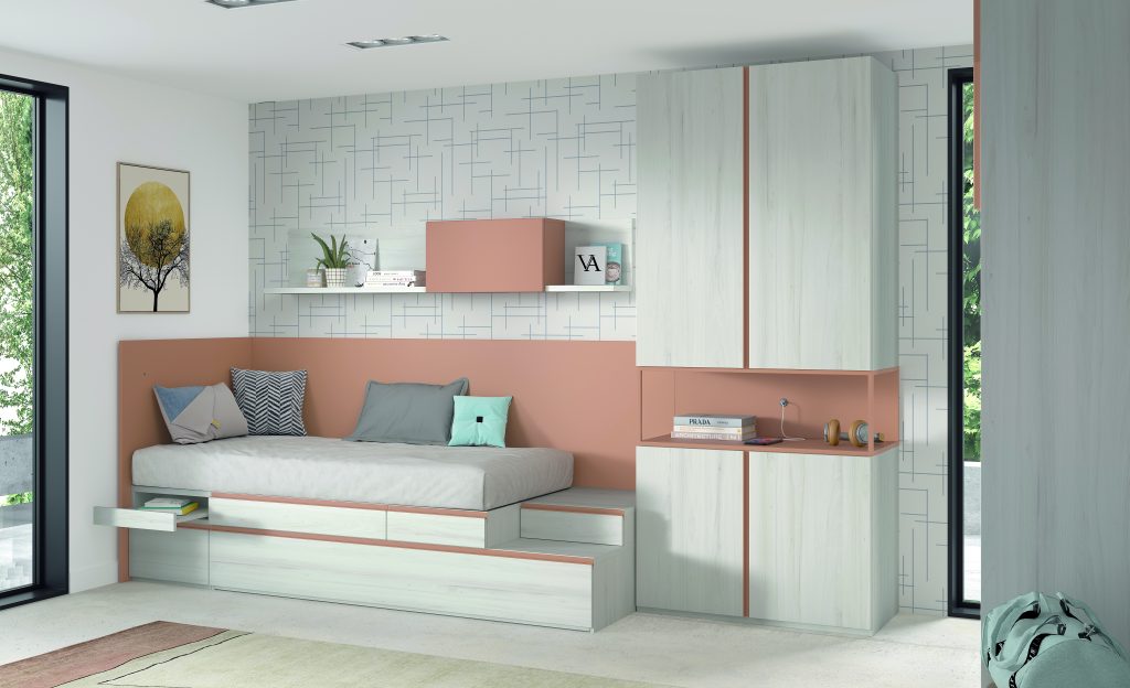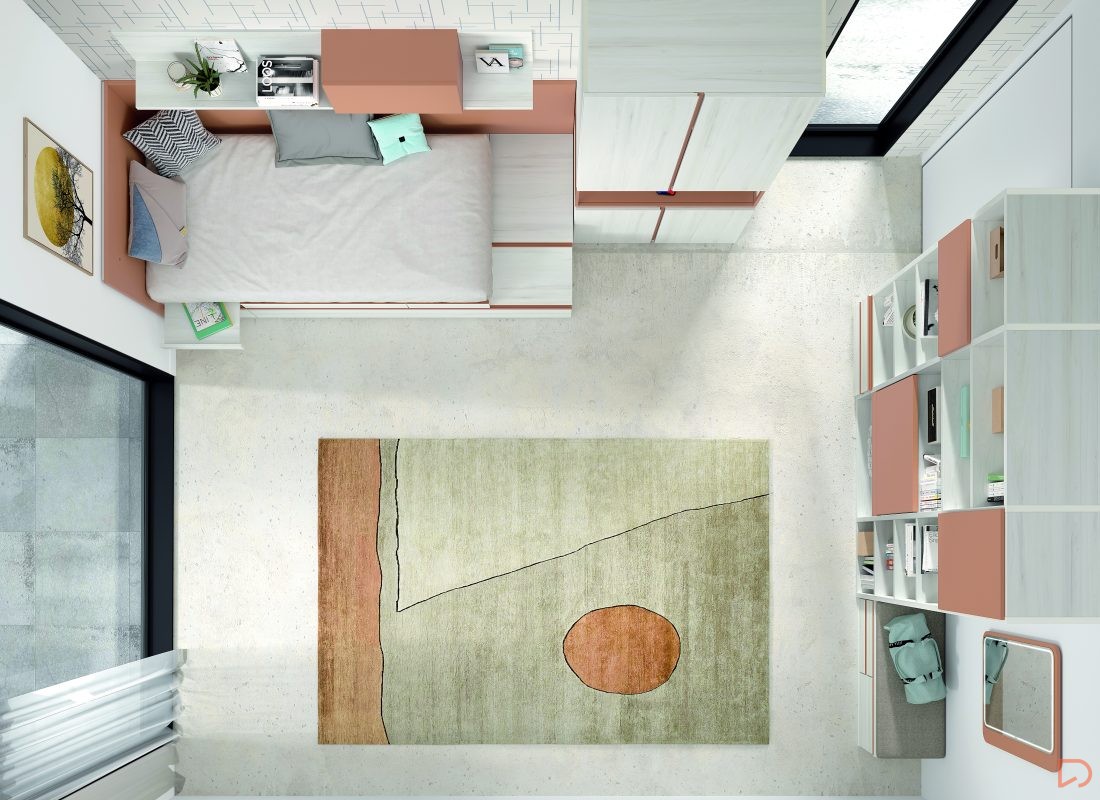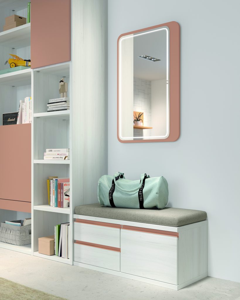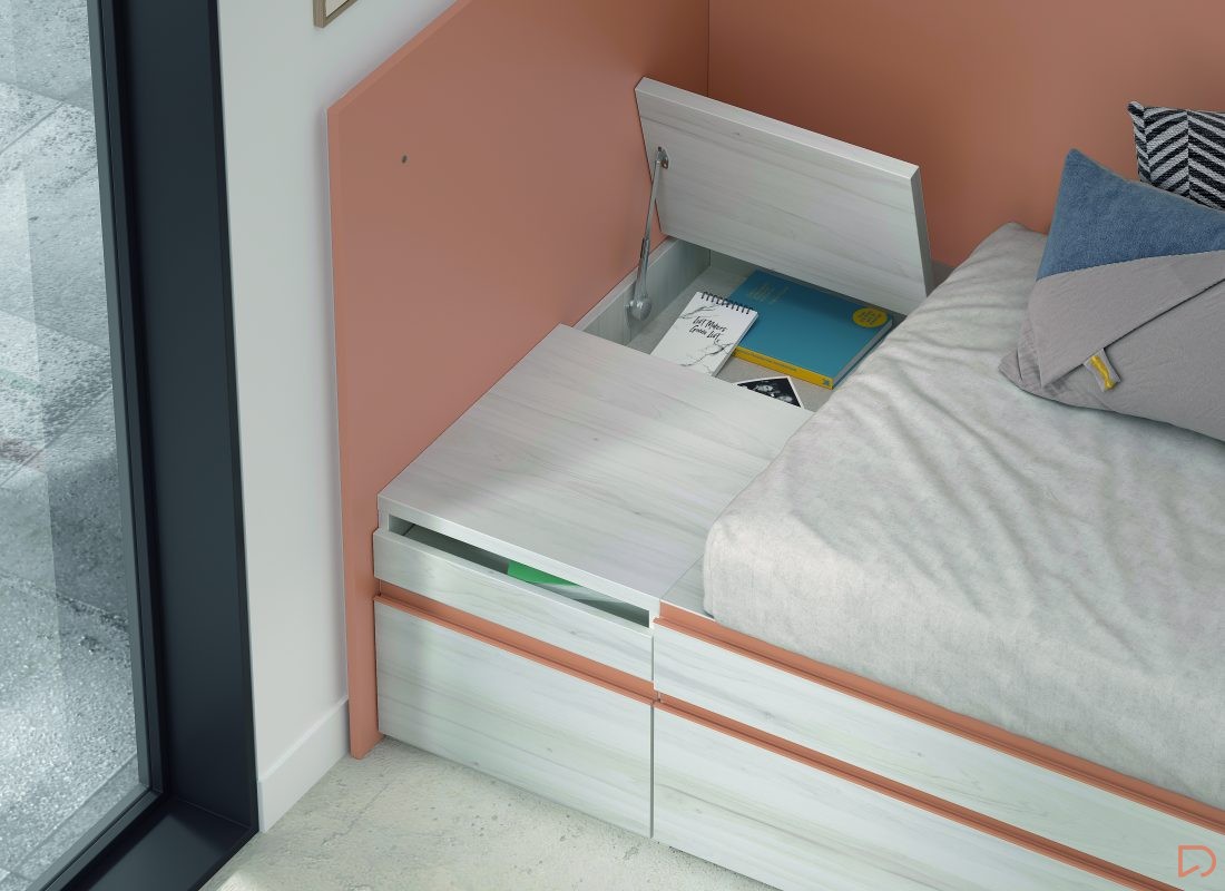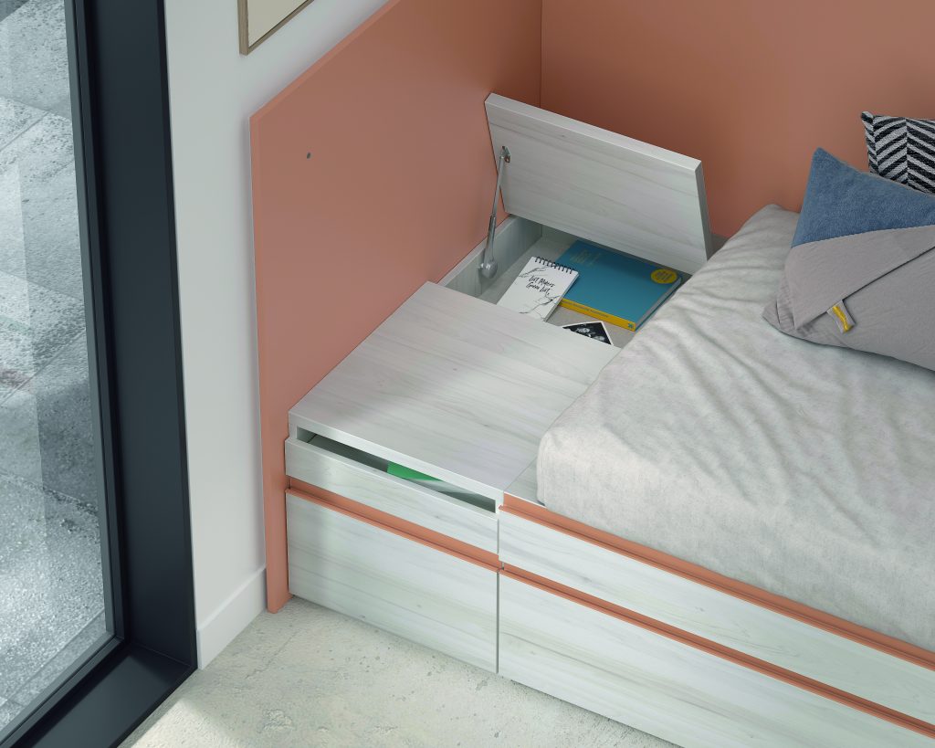Diseño con personalidad, compuesto por módulos apilables con bandeja extraíble, cajón guardaobjetos, estante metálico iluminado y escritorio abatible. Integra armario expositor, librería modular con puertas y módulos de almacenaje base con somier de arrastre