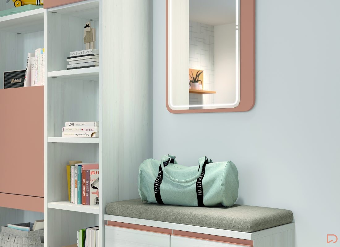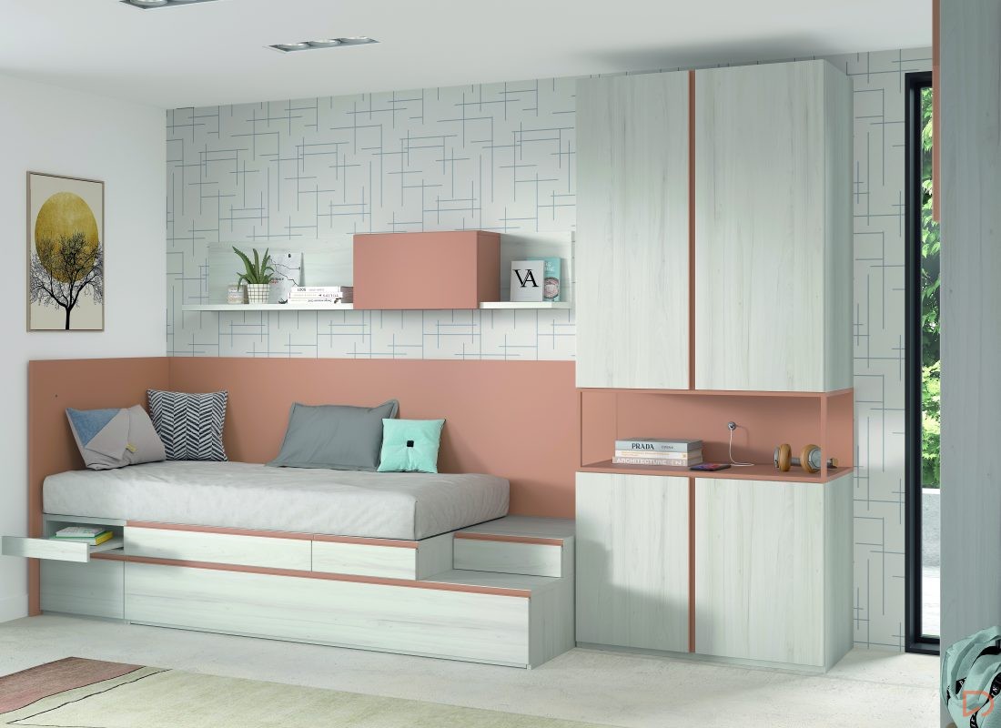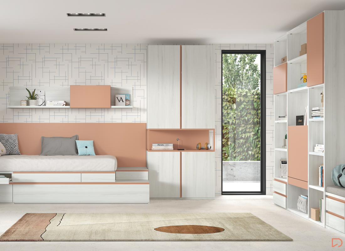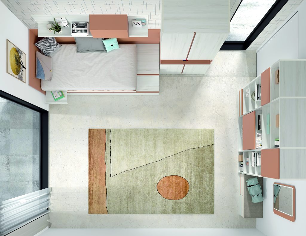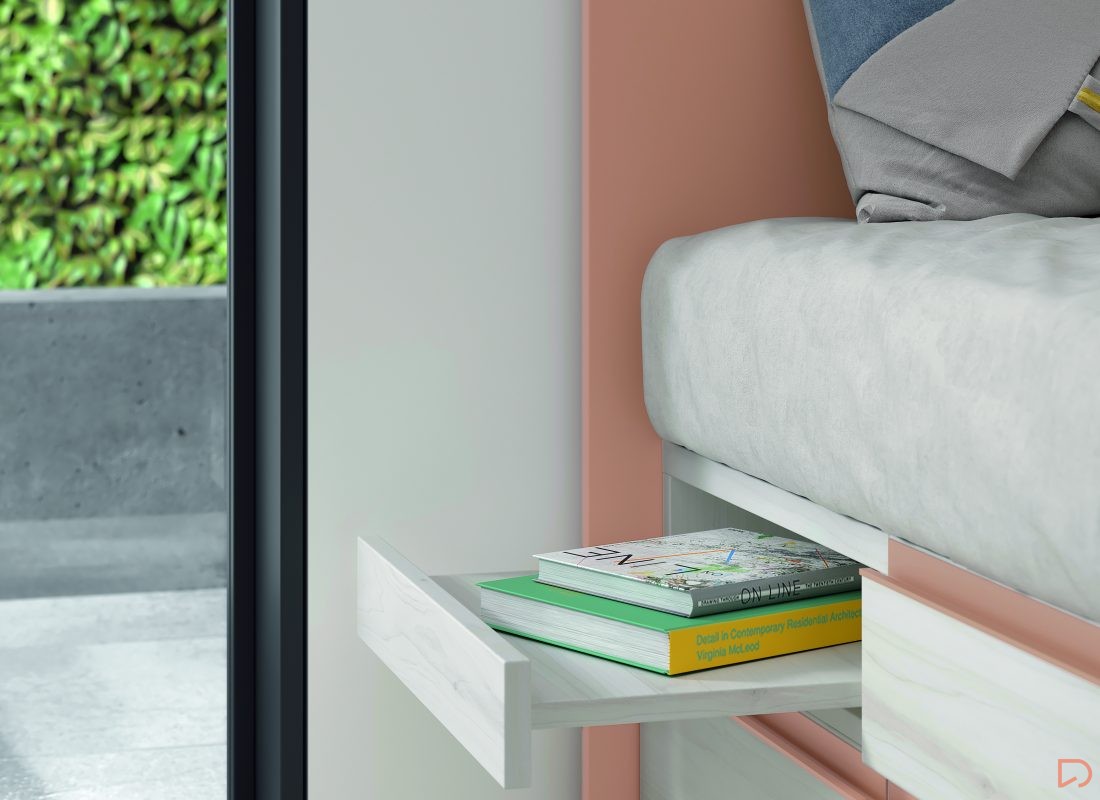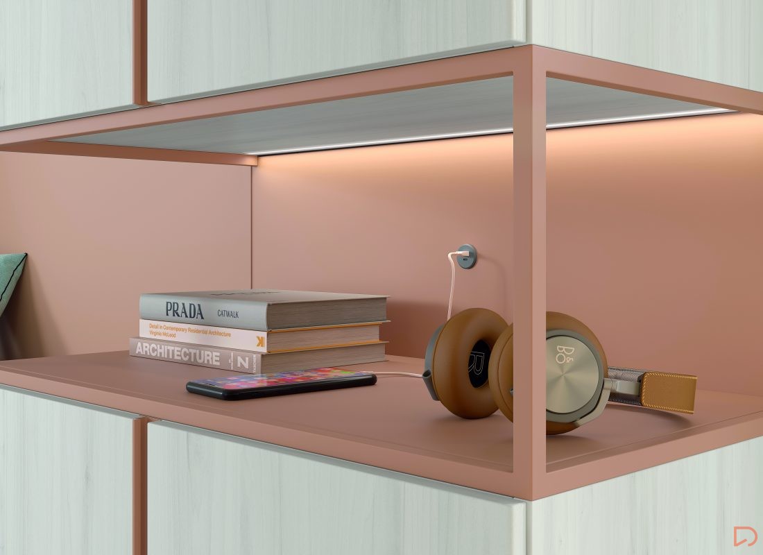 Diseño con personalidad, compuesto por módulos apilables con bandeja extraíble, cajón guardaobjetos, estante metálico iluminado y escritorio abatible. Integra armario expositor, librería modular con puertas y módulos de almacenaje base con somier de arrastre
