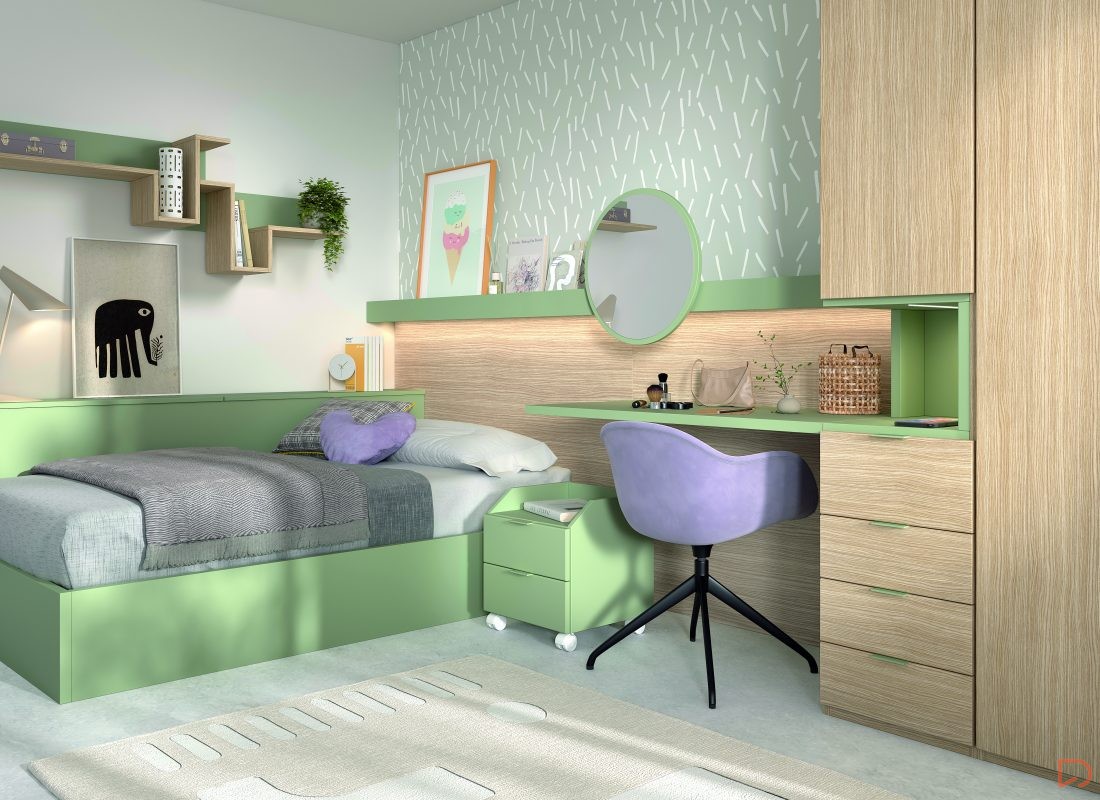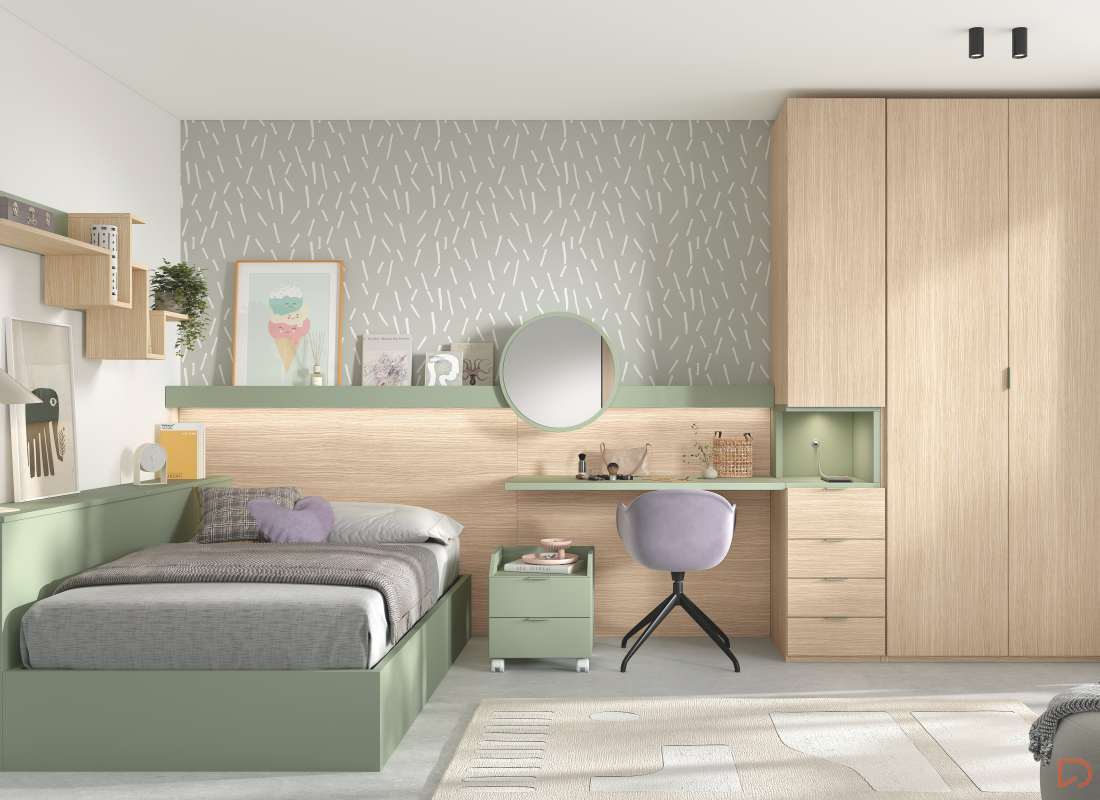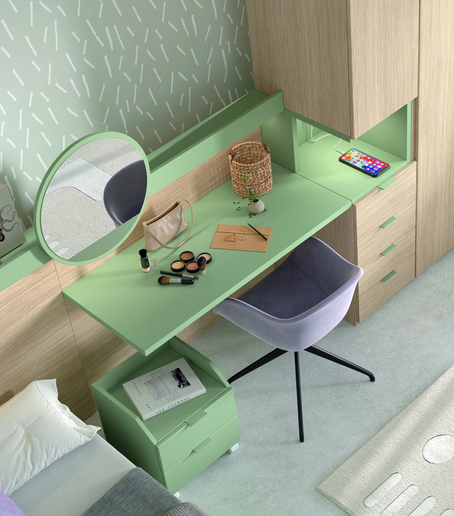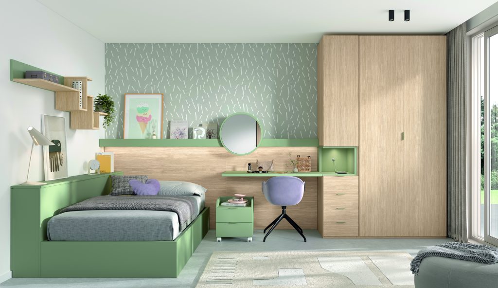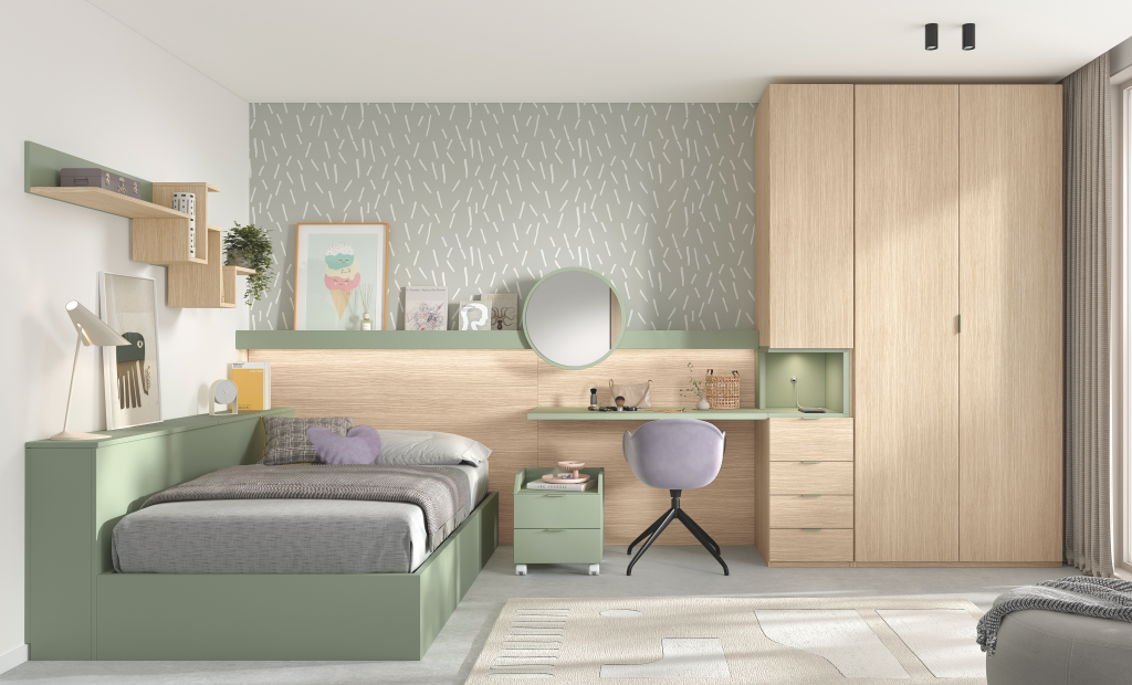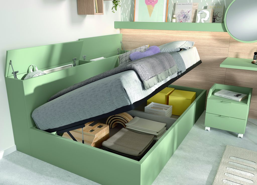Dormitorio juvenil con bañera de somier elevable y arcón respaldo de tapas abatibles. Incluye armarios altos, zona de trabajo con encimera volada y mesita auxiliar con ruedas. Ideal para optimizar espacio con estilo contemporáneo.