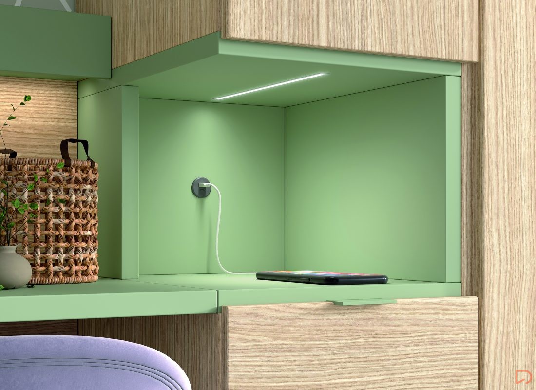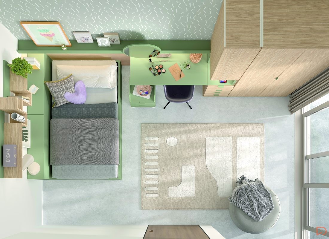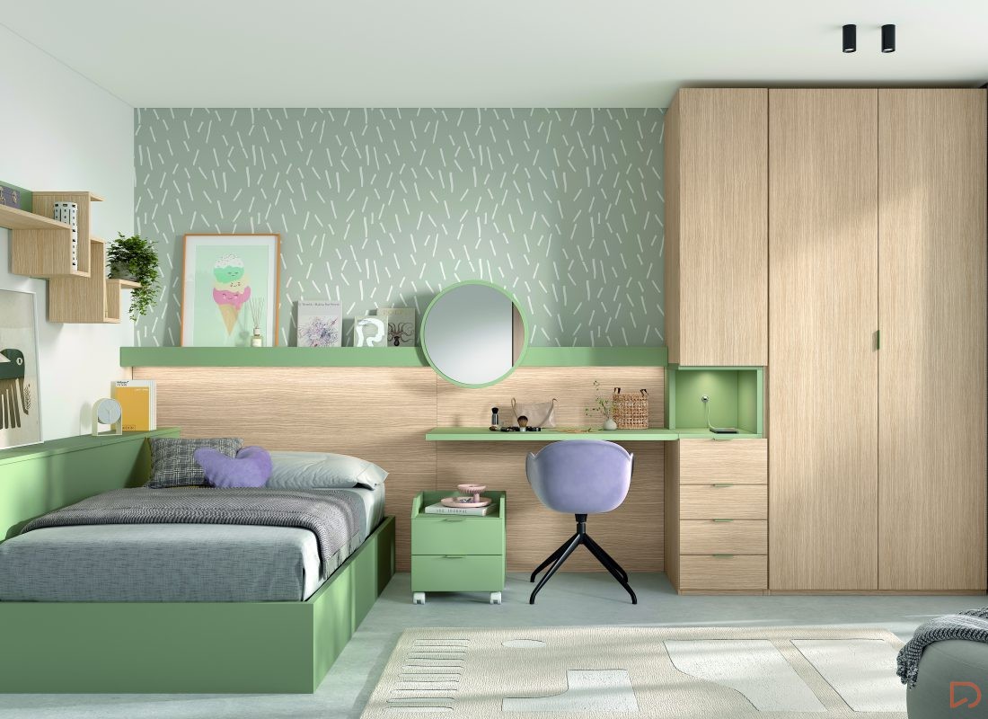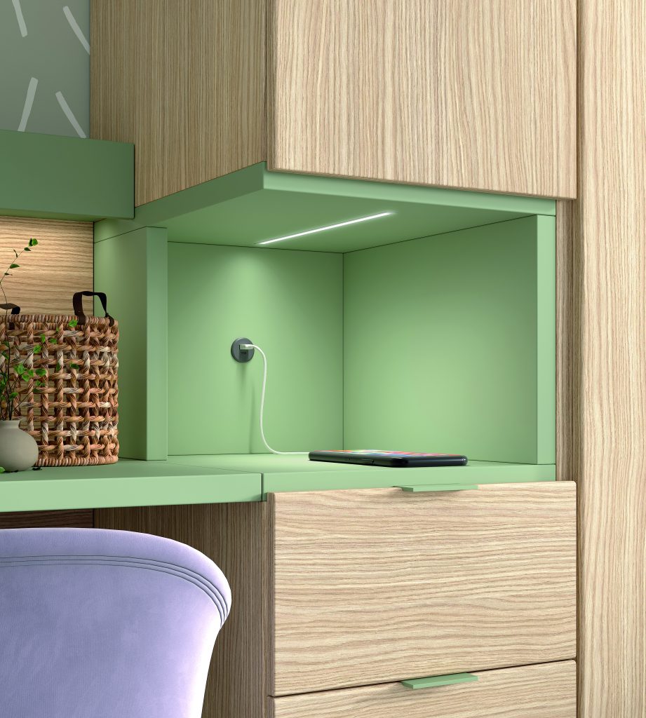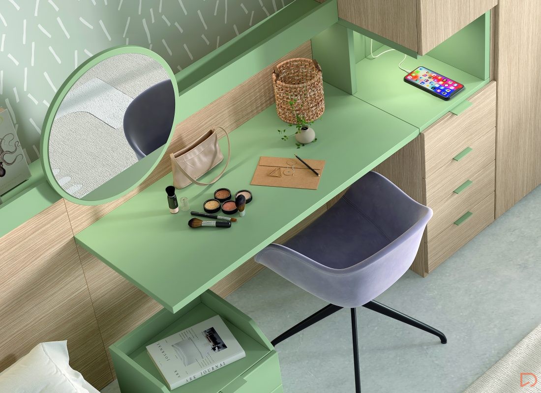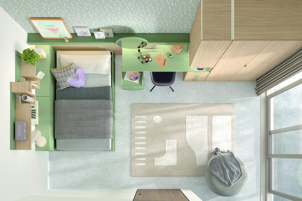 Dormitorio juvenil con bañera de somier elevable y arcón respaldo de tapas abatibles. Incluye armarios altos, zona de trabajo con encimera volada y mesita auxiliar con ruedas. Ideal para optimizar espacio con estilo contemporáneo.