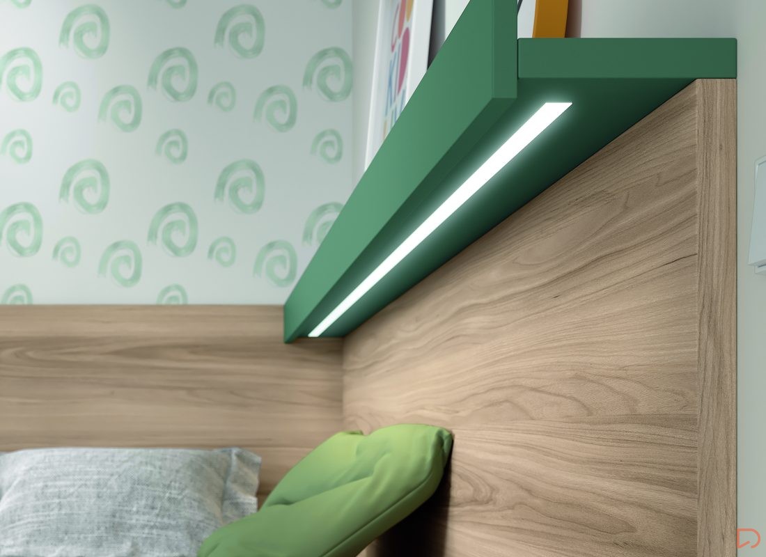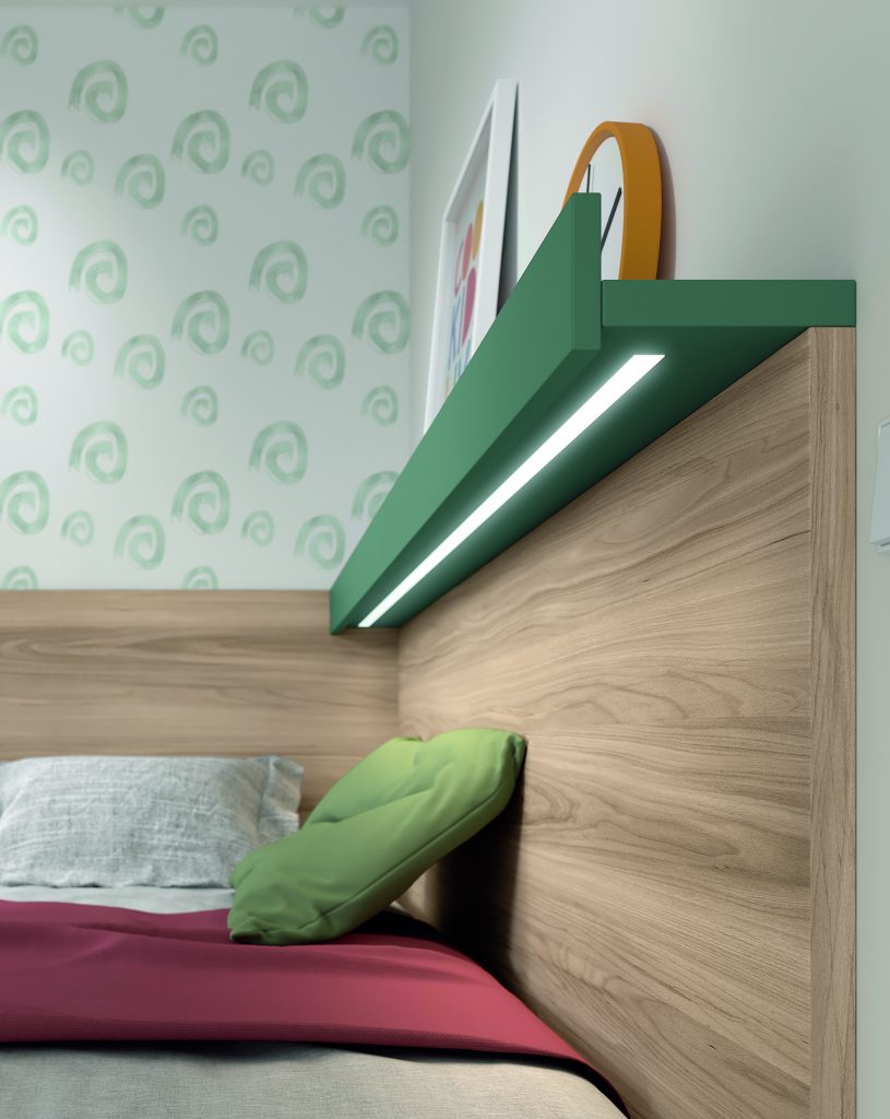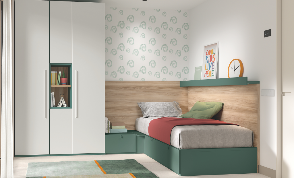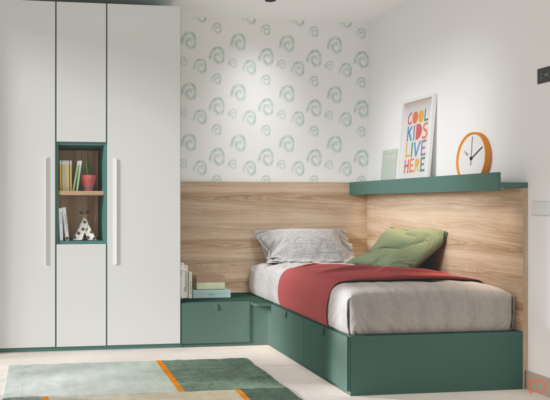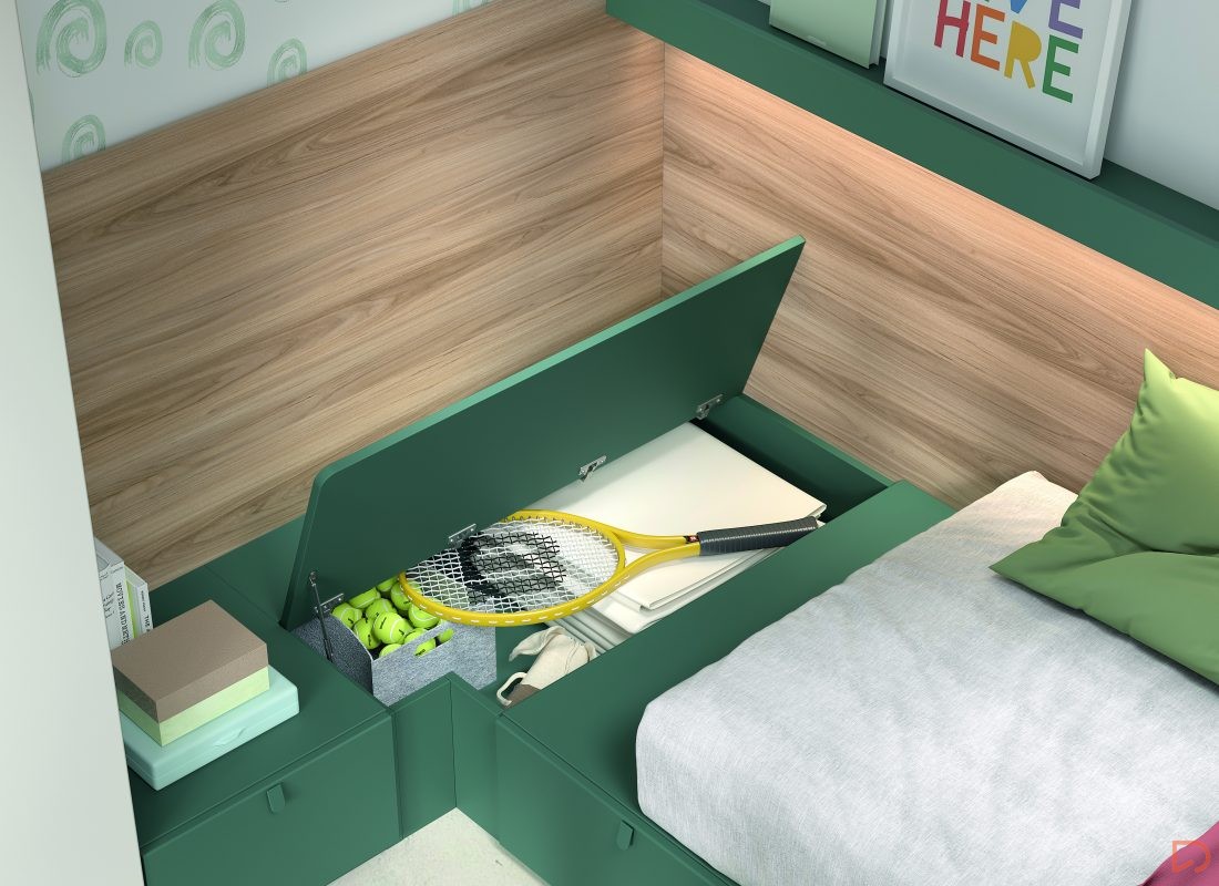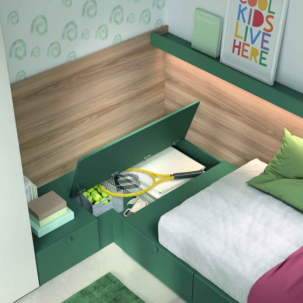 Espacio versátil con arcón oculto bajo el colchón, ideal para almacenaje discreto. Incluye armarios con estantes, módulos contenedores, cabezales Fuelle, zona de estudio con encimera y cubos colgantes. Diseño moderno y adaptable.