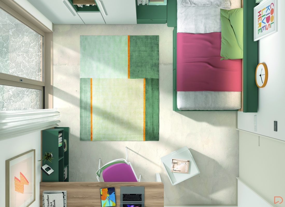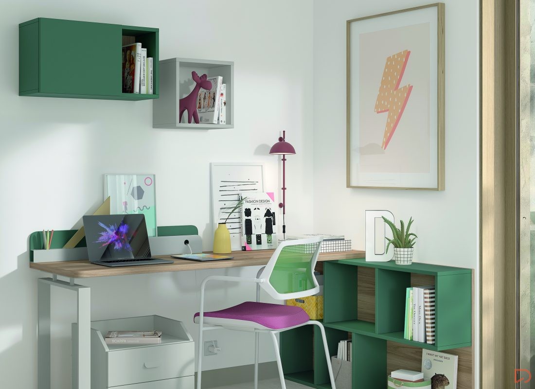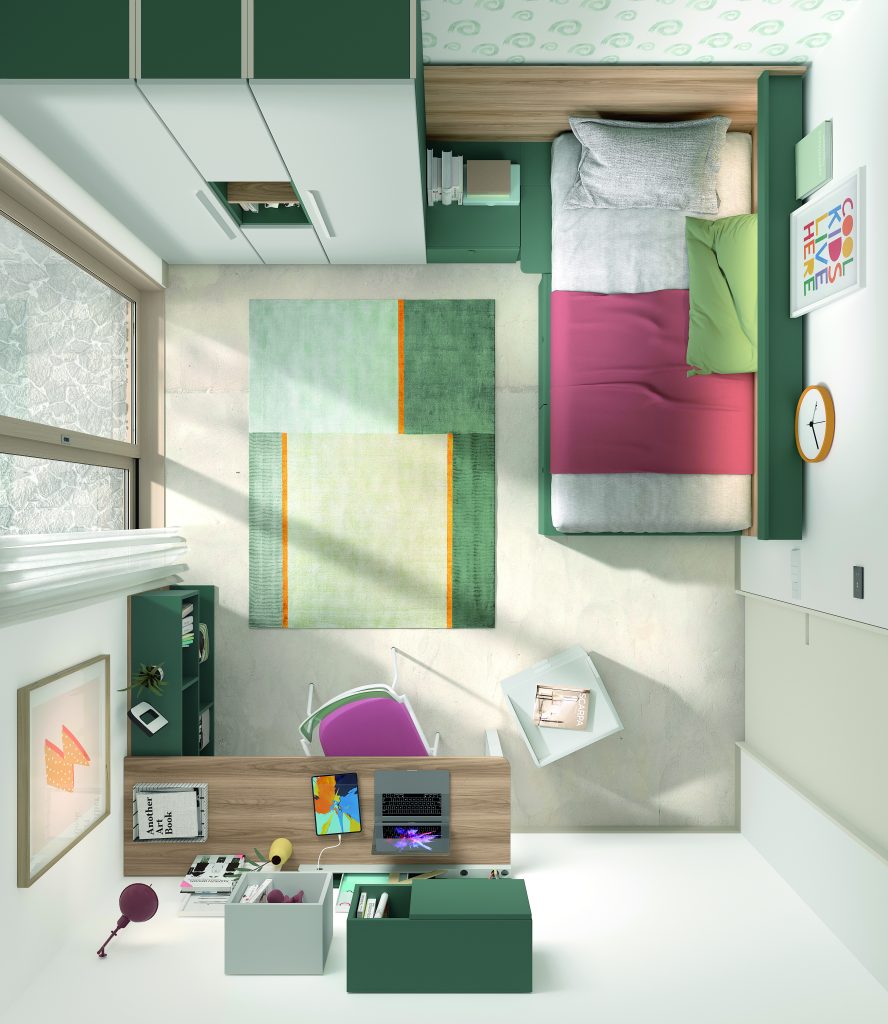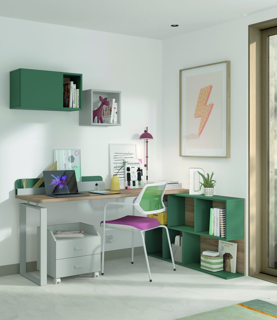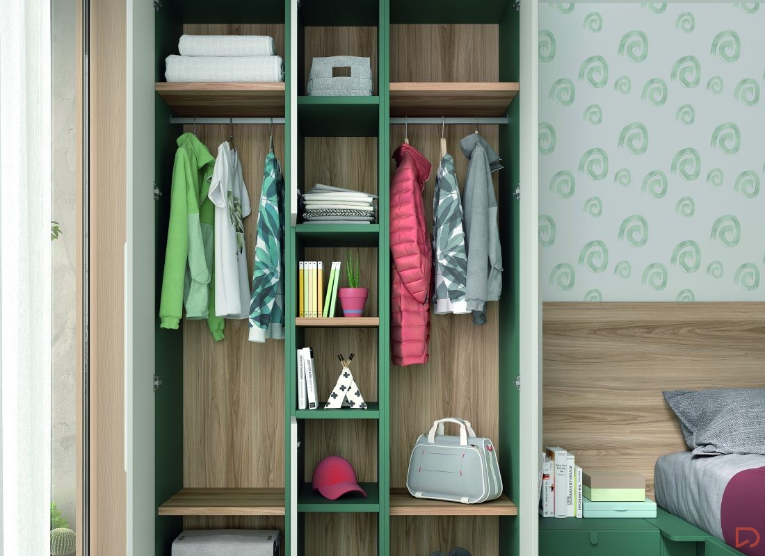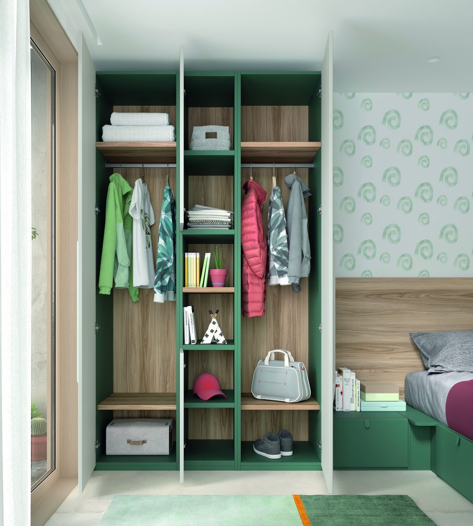 Espacio versátil con arcón oculto bajo el colchón, ideal para almacenaje discreto. Incluye armarios con estantes, módulos contenedores, cabezales Fuelle, zona de estudio con encimera y cubos colgantes. Diseño moderno y adaptable.