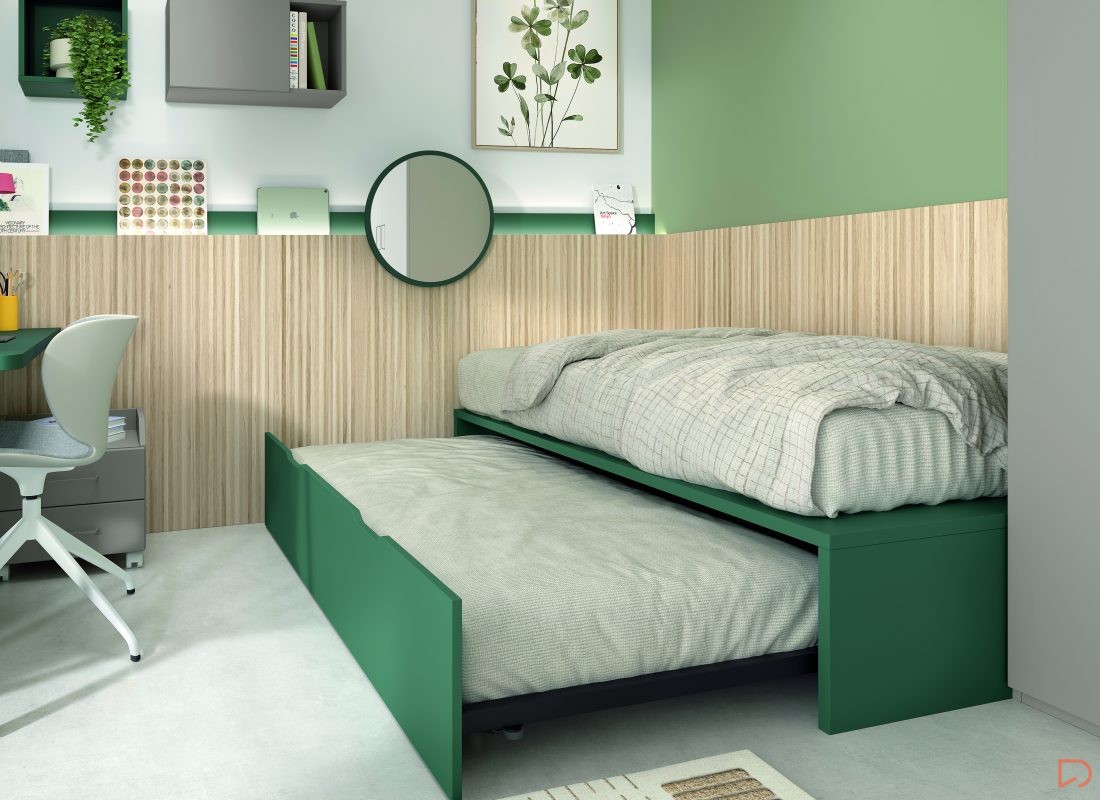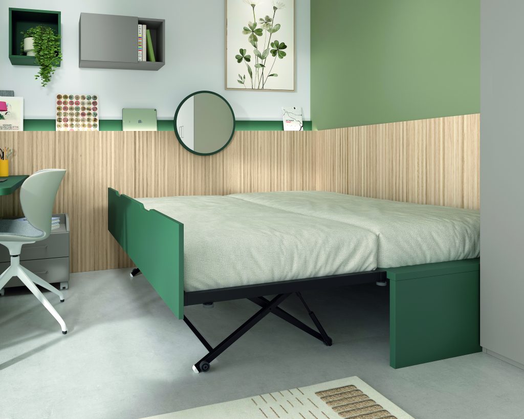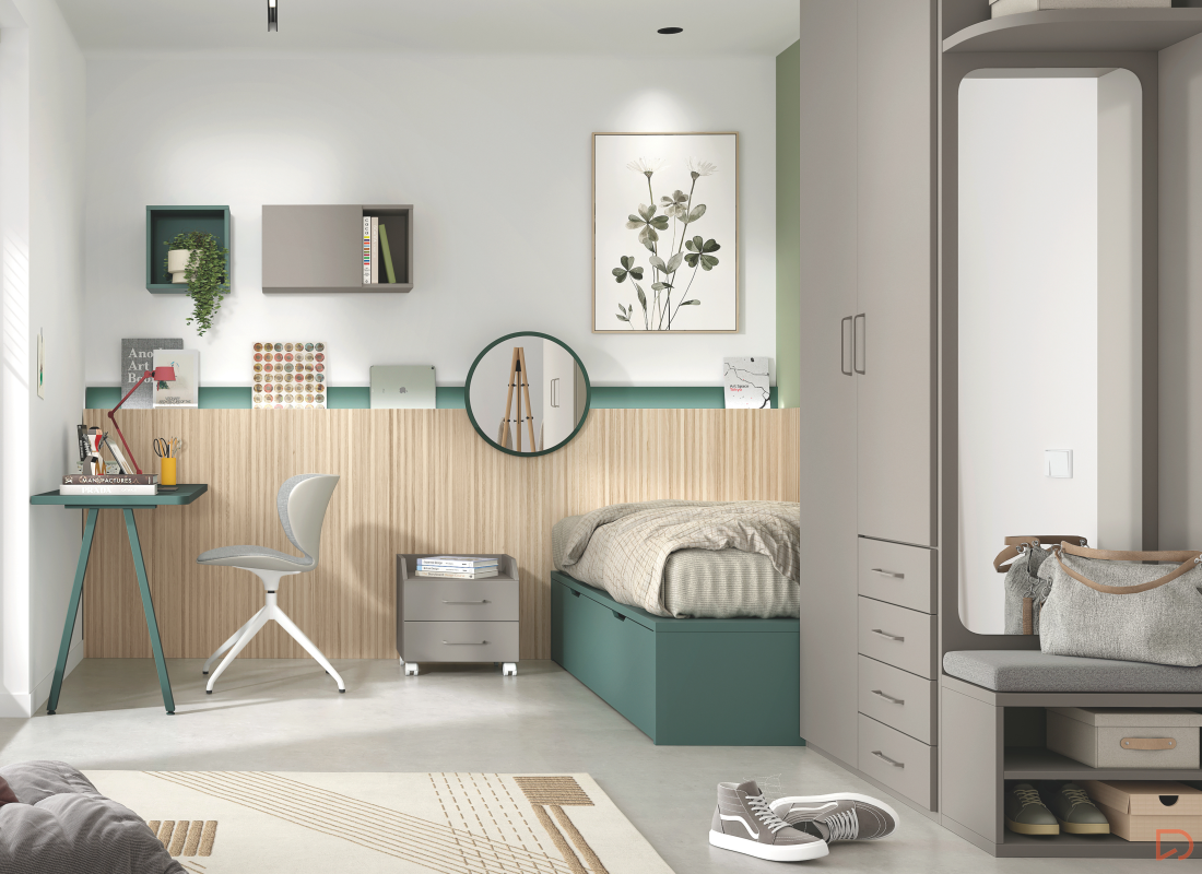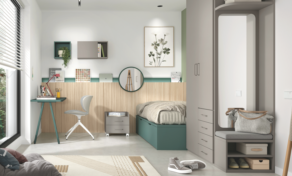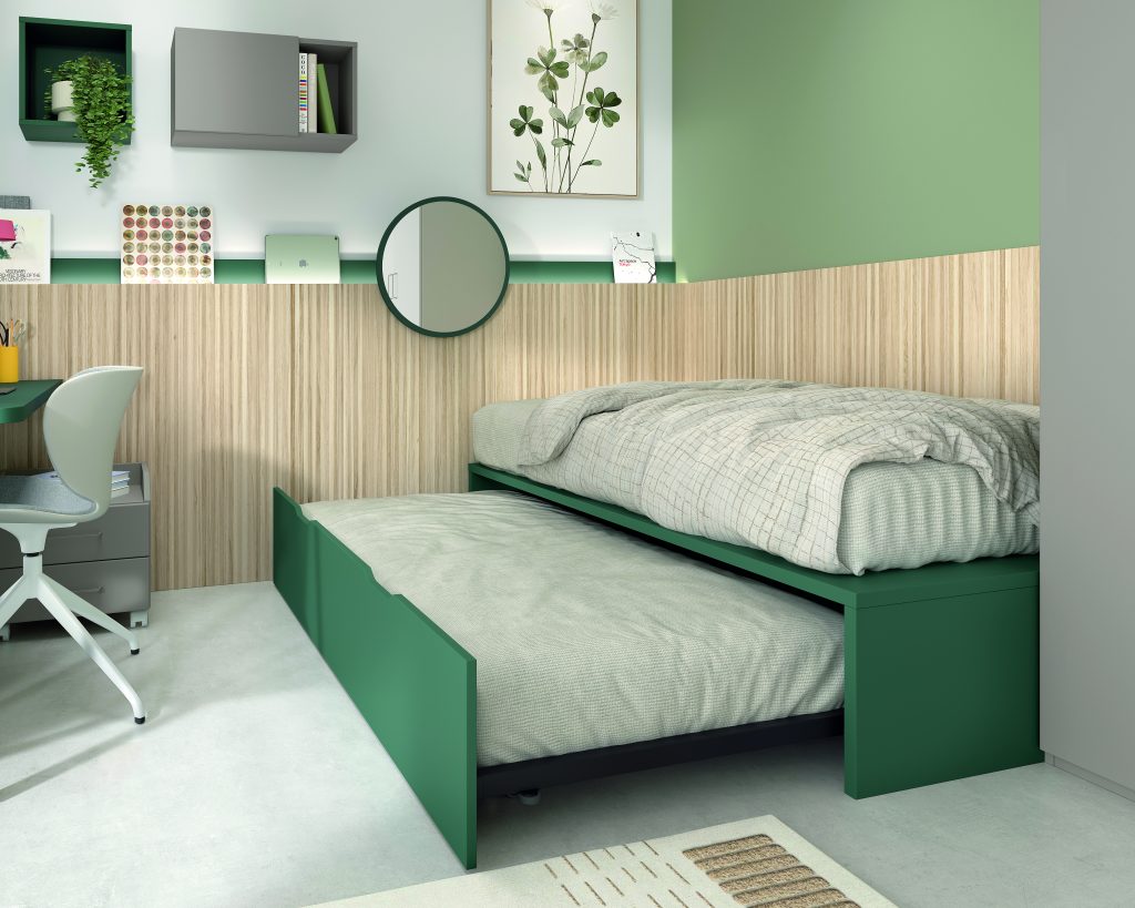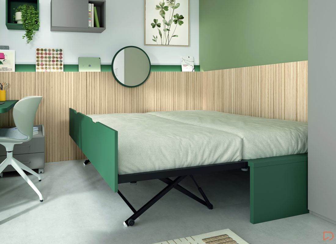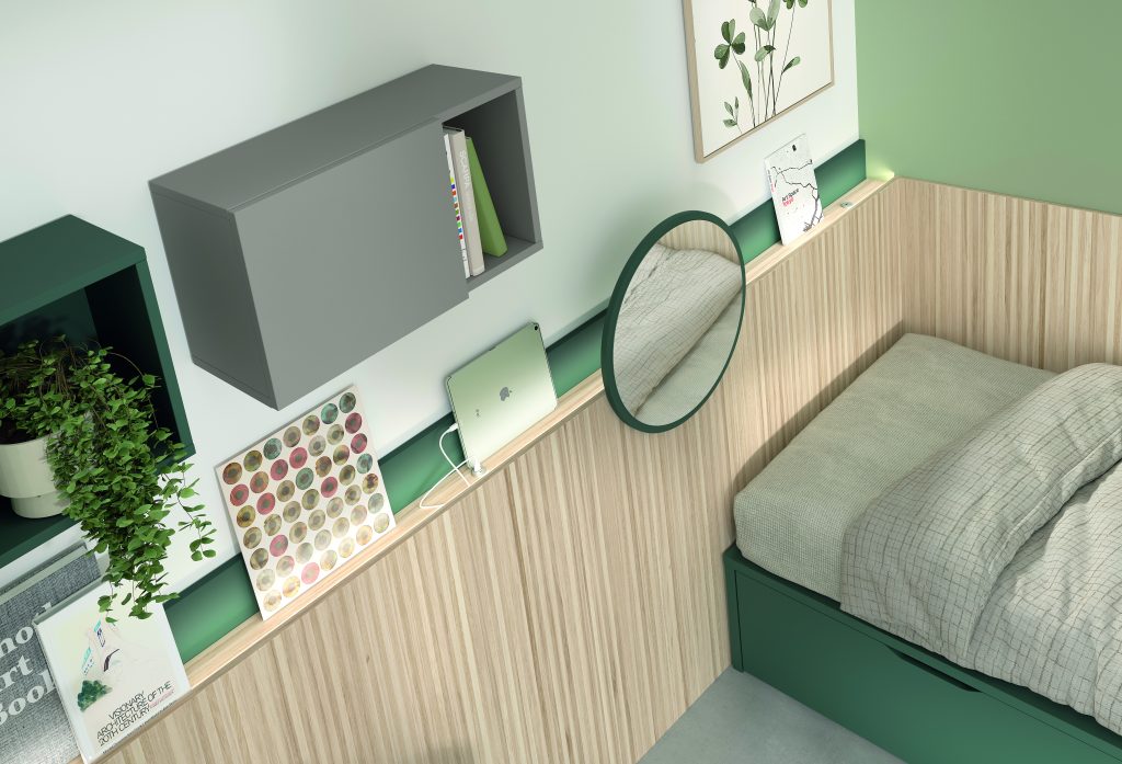 Compacto base 30 con somier de arrastre premium y terminal con asiento y espejo. Incluye cabeceros con repisa, LED y USB, más encimera con soporte metálico y módulo colgante. Permite crear una doble cama al mismo nivel.
