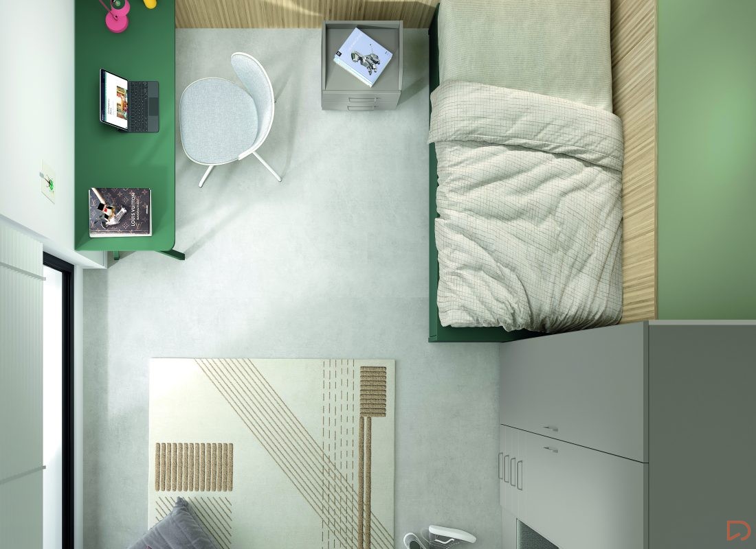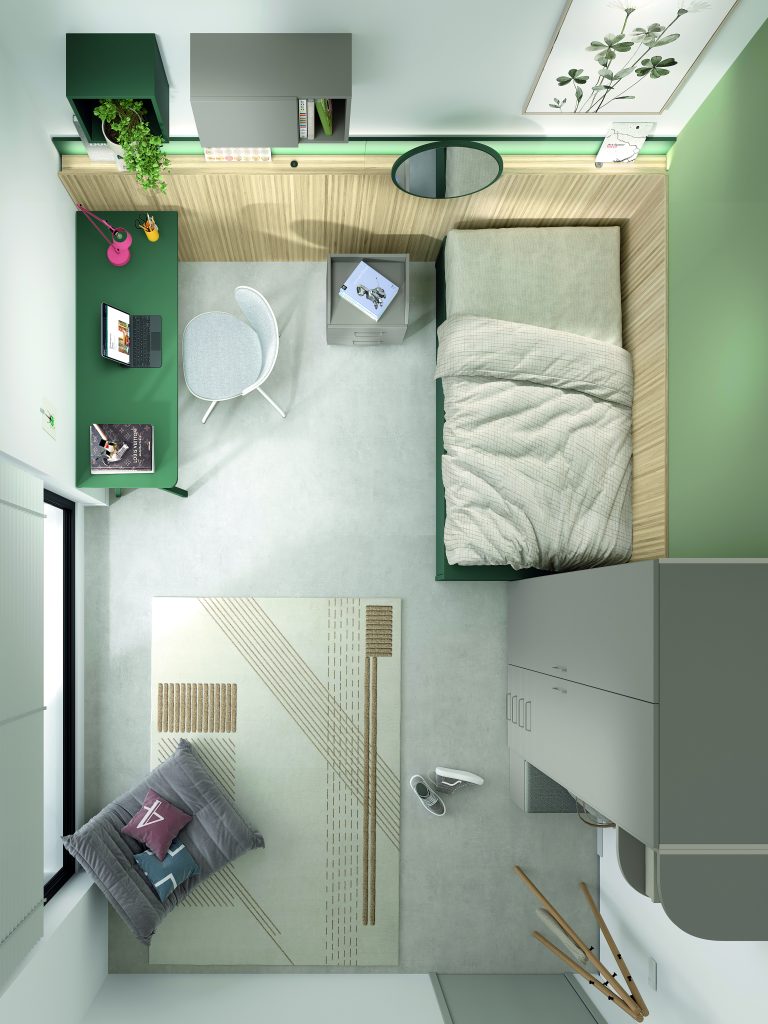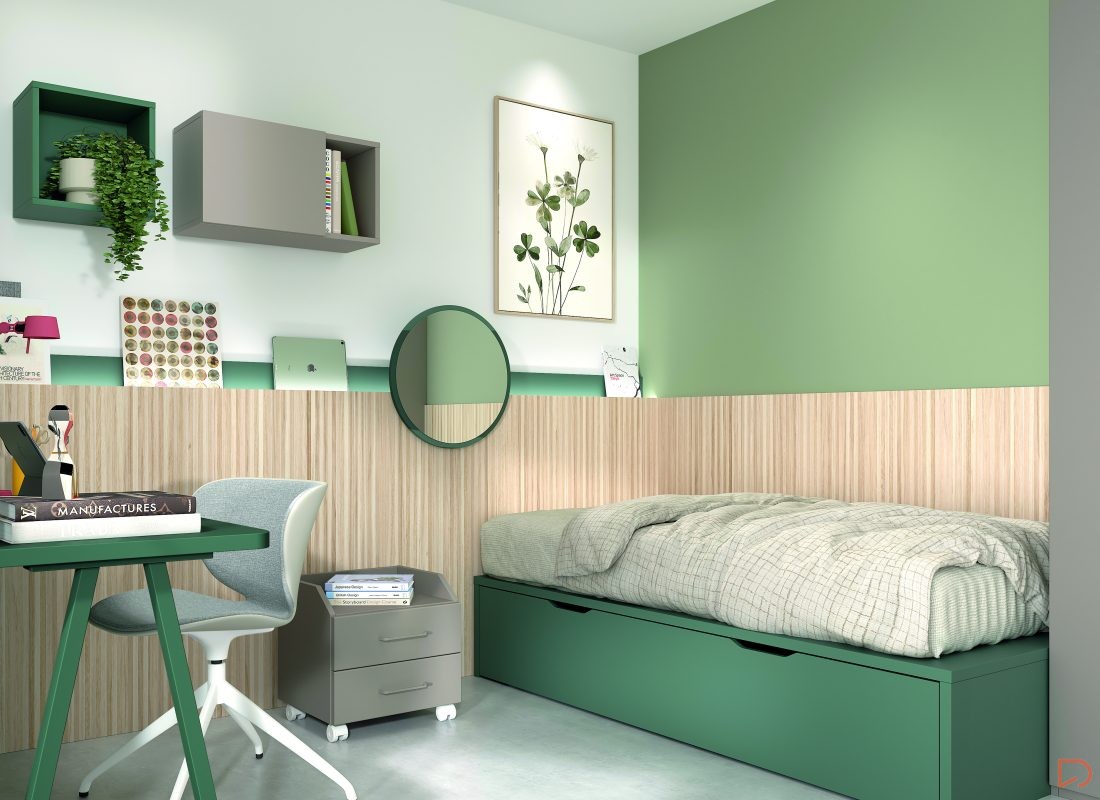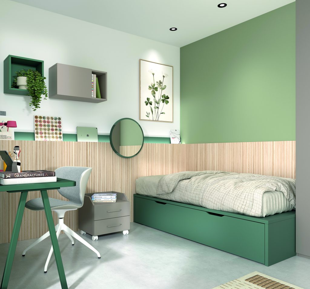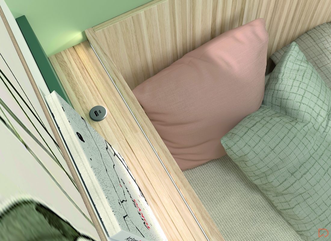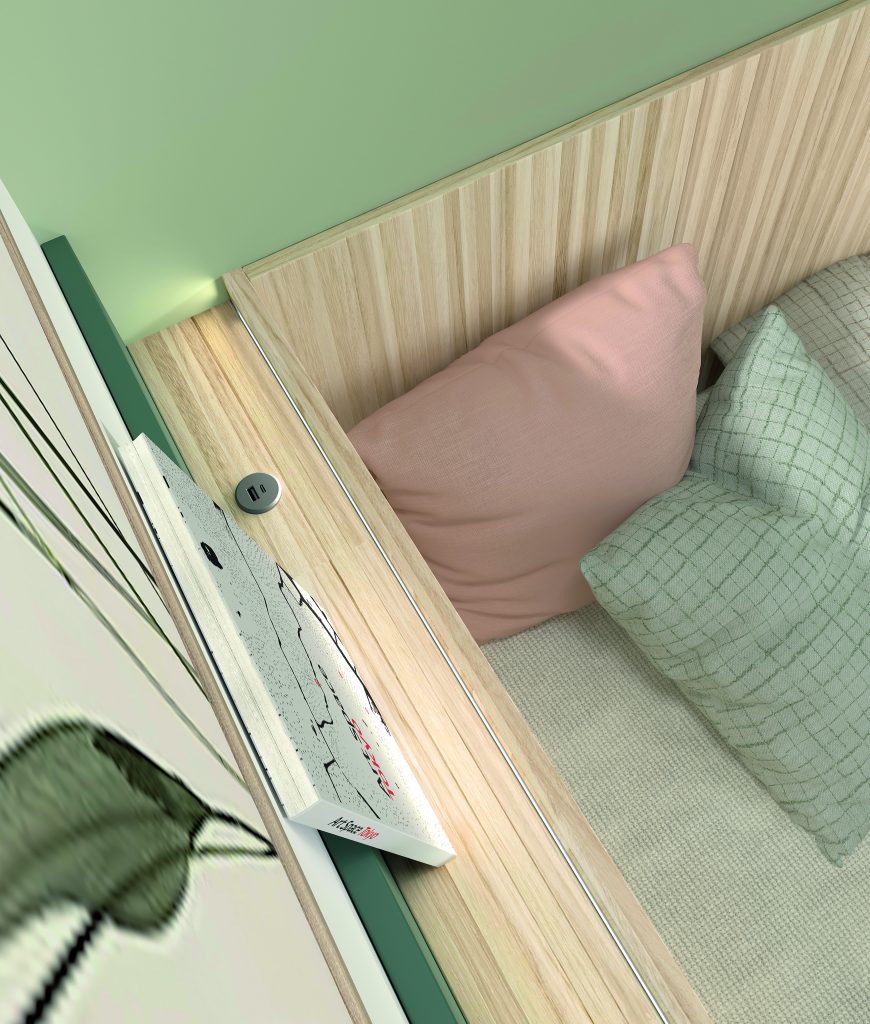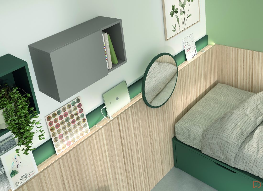 Compacto base 30 con somier de arrastre premium y terminal con asiento y espejo. Incluye cabeceros con repisa, LED y USB, más encimera con soporte metálico y módulo colgante. Permite crear una doble cama al mismo nivel.