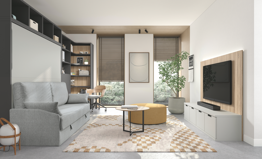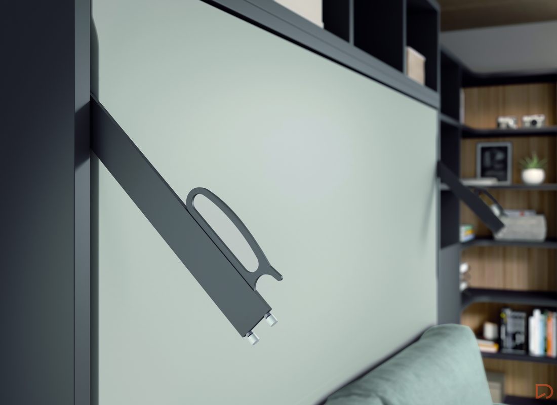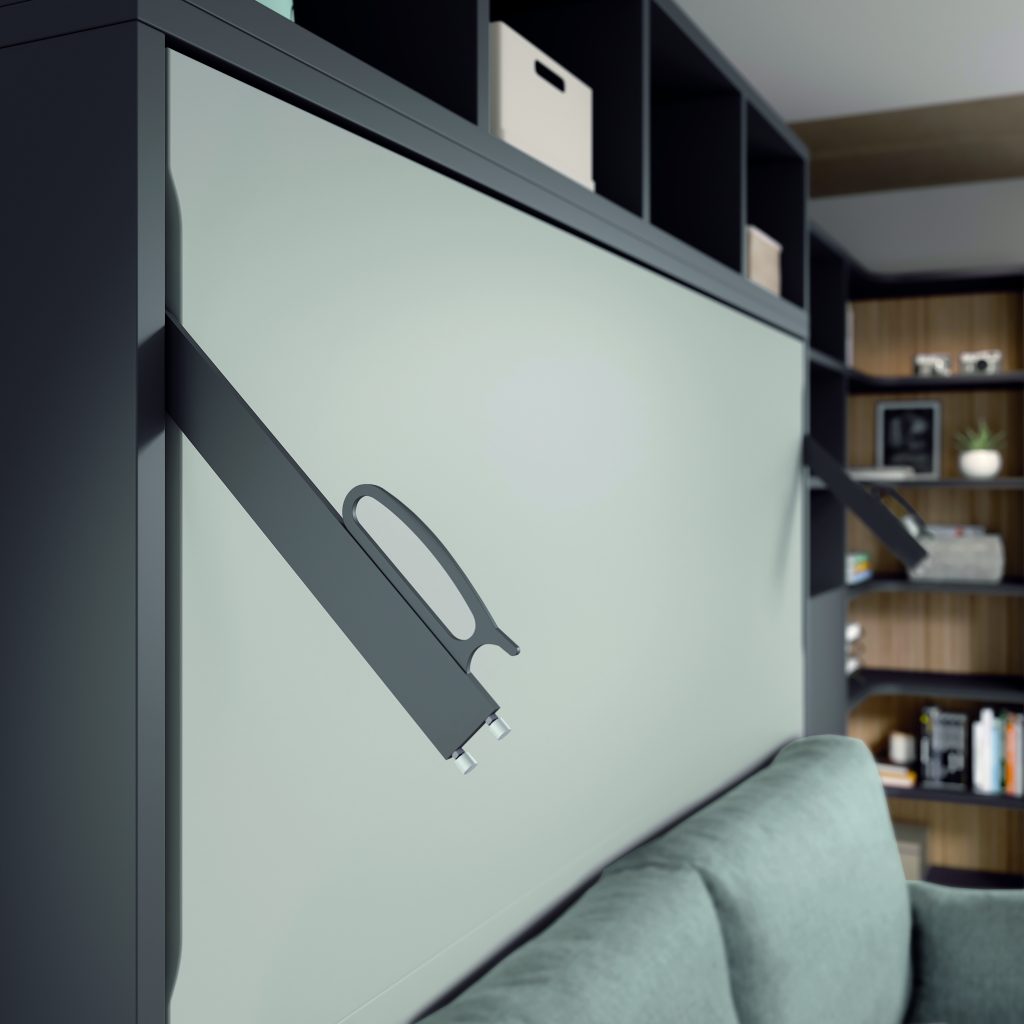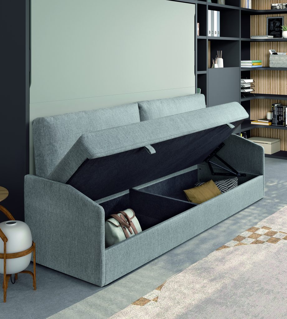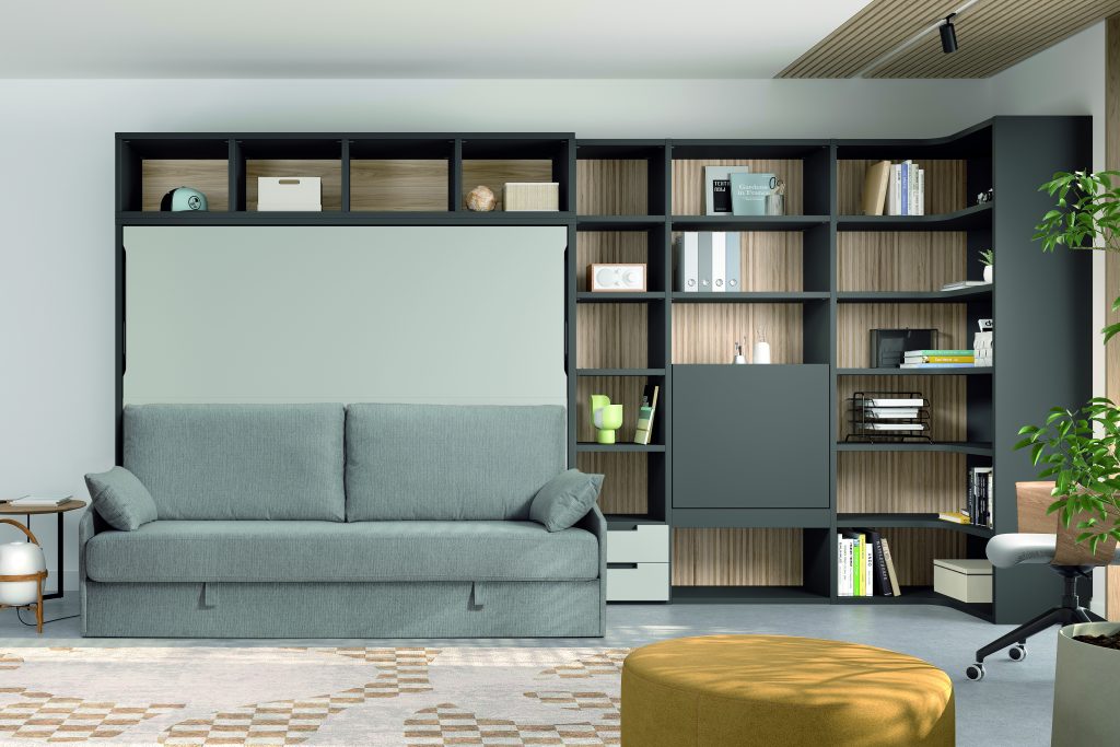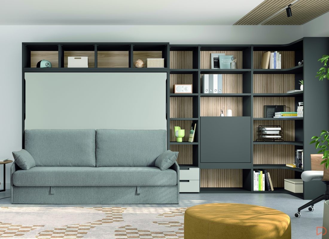 Cama abatible horizontal con sofá canapé y estantería superior. Incluye librería modular con mesa abatible, encimera auxiliar y cabezal con iluminación LED. Diseño moderno que maximiza espacio y confort.