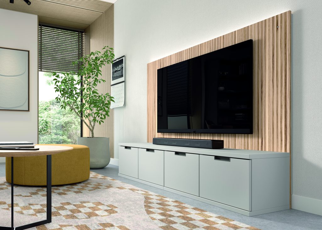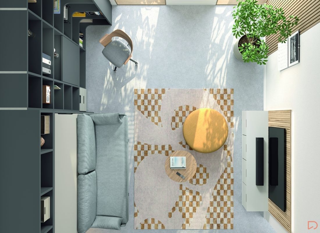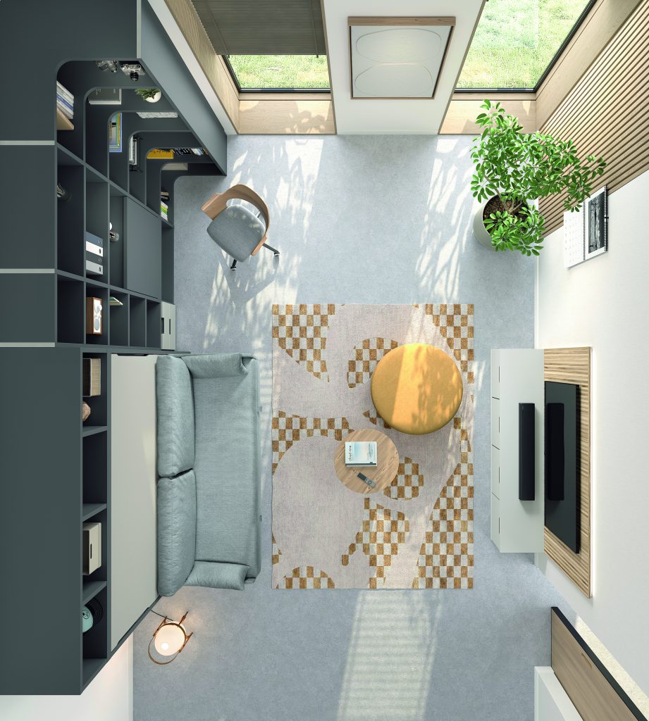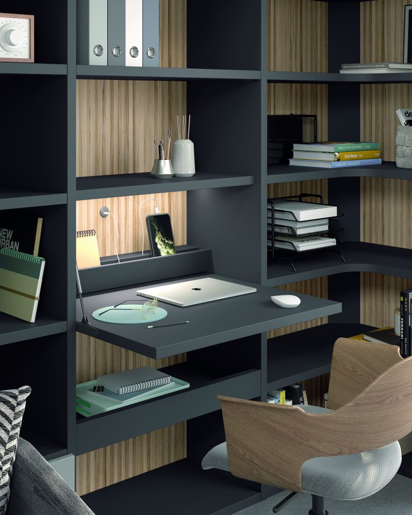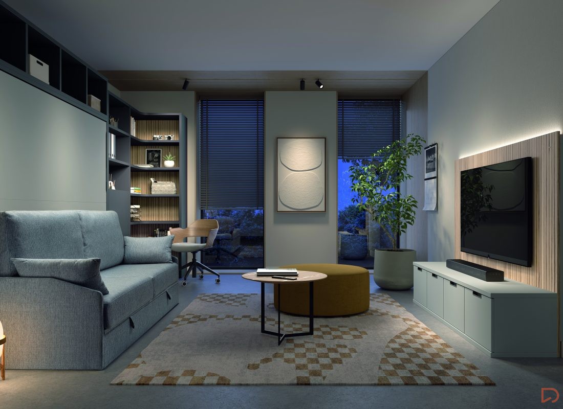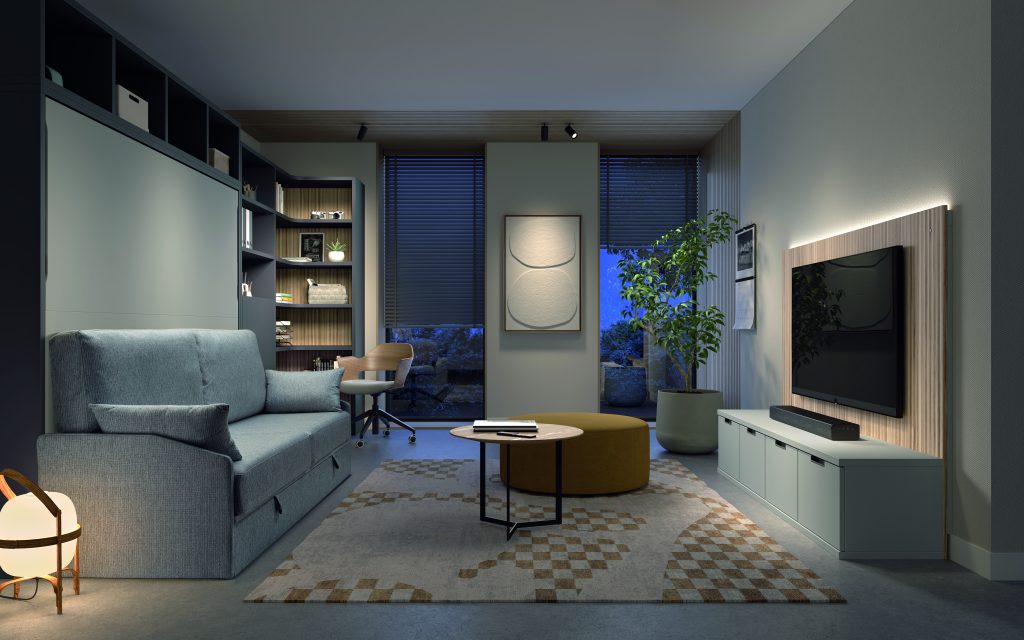 Cama abatible horizontal con sofá canapé y estantería superior. Incluye librería modular con mesa abatible, encimera auxiliar y cabezal con iluminación LED. Diseño moderno que maximiza espacio y confort.