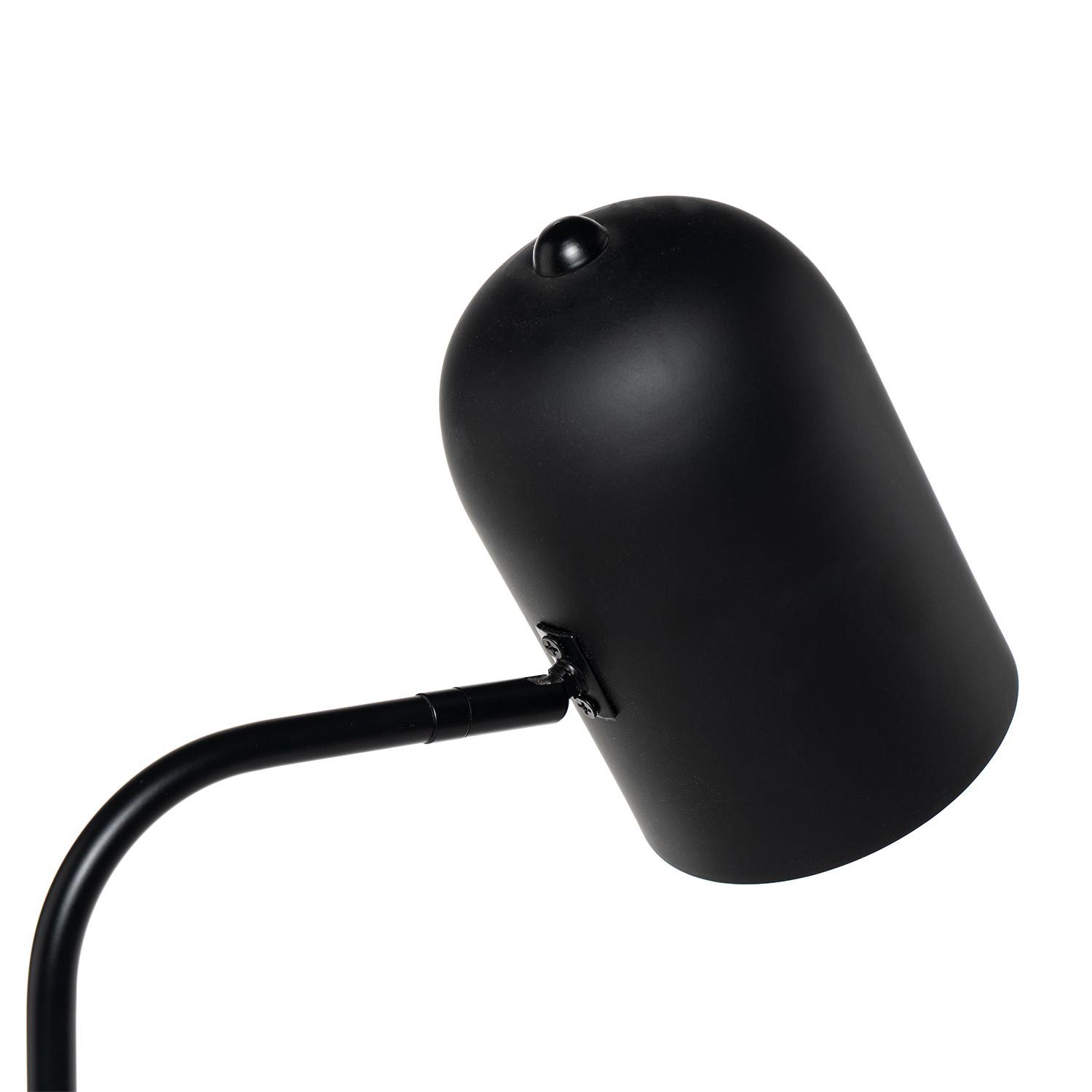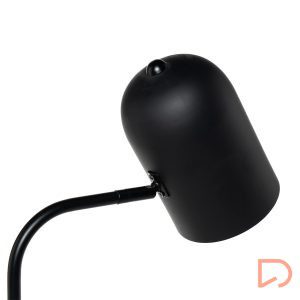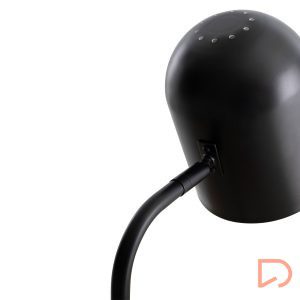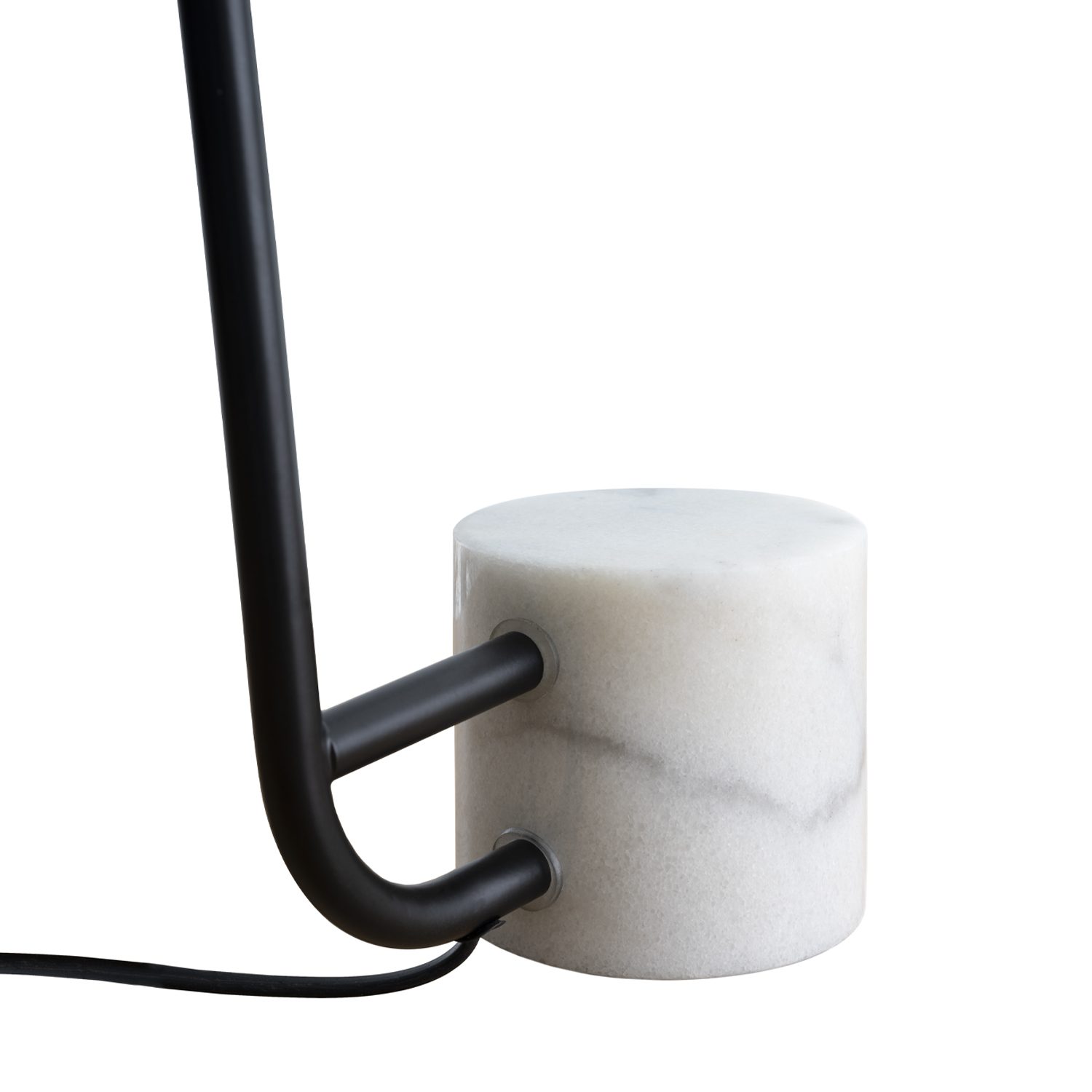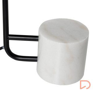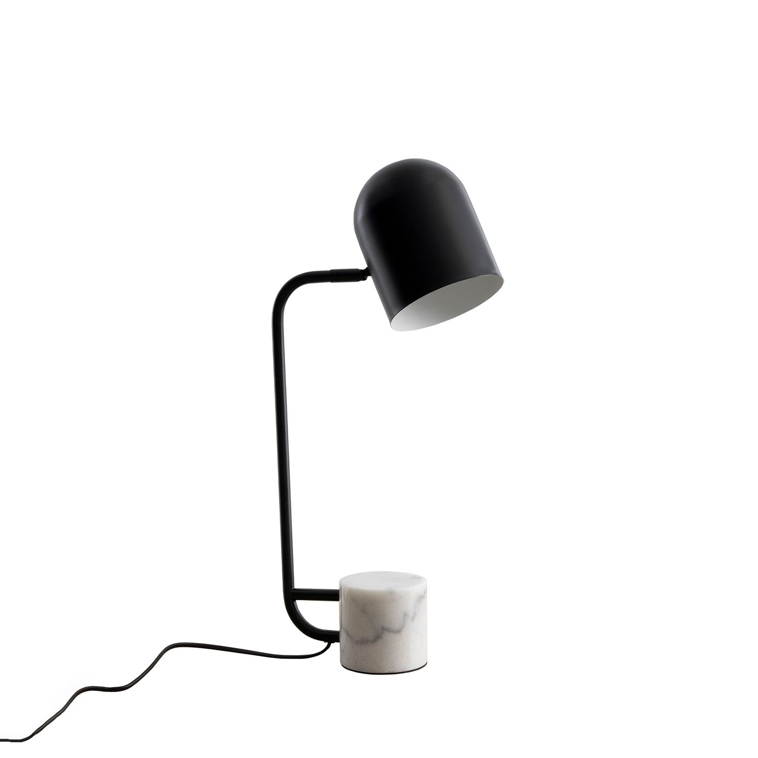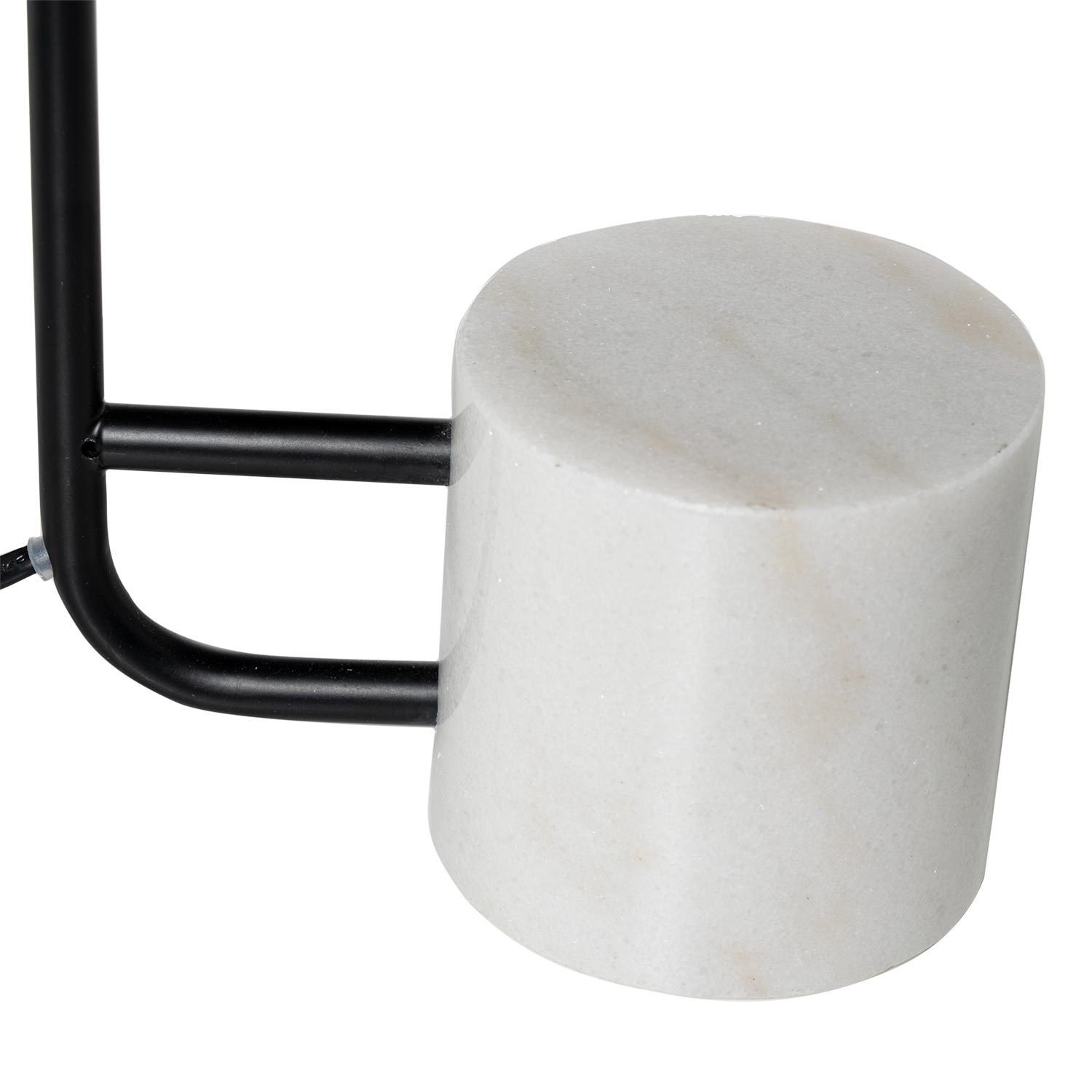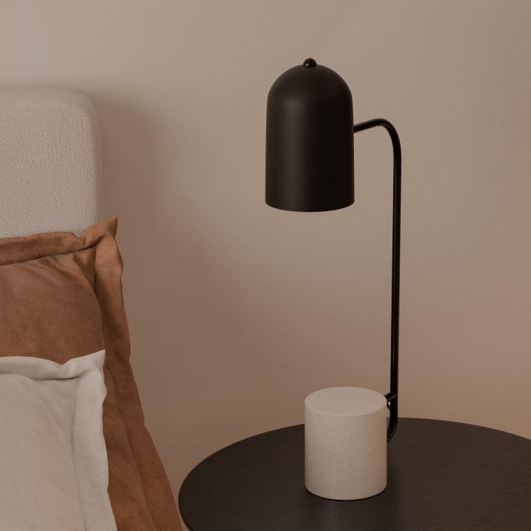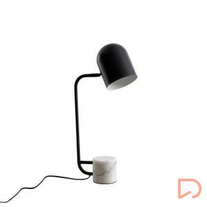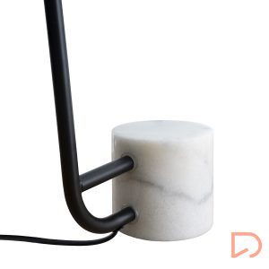 Lámpara de sobremesa con estructura en metal de color negro y base de mármol blanco.