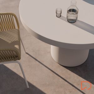 La mesa THELMA destaca por su estética depurada y su presencia serena, gracias a su acabado en cemento blanco que aporta luminosidad y modernidad a cualquier entorno. Su tapa, de imponente grosor de 8 cm, refuerza el carácter sólido y escultórico de la pieza, generando un impacto visual que no pasa desapercibido.
