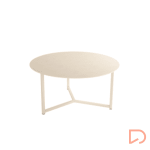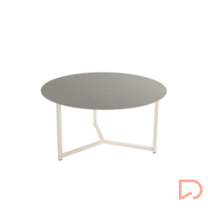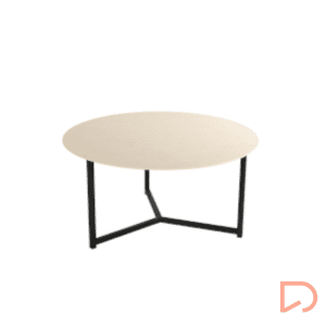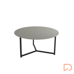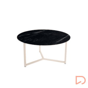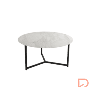 - Mesa auxiliar redonda con pata metálica y sobre porcelánico en diseño piedras.