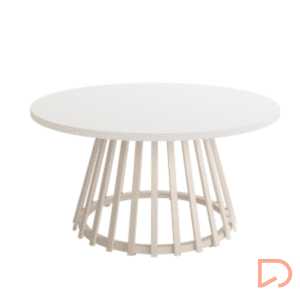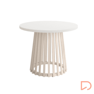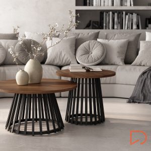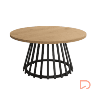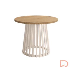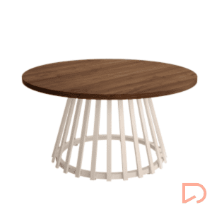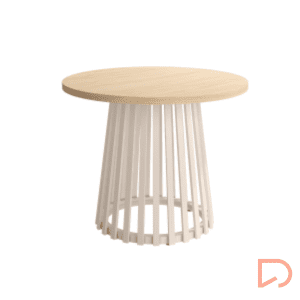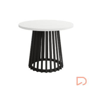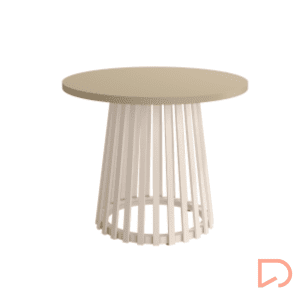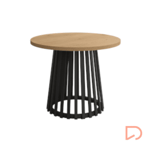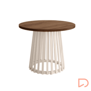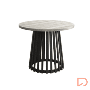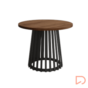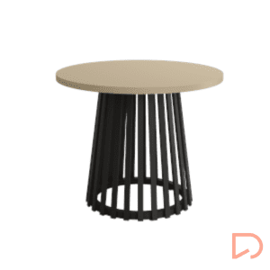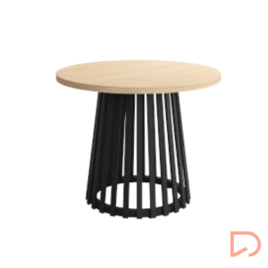 - Mesa auxiliar redonda con pata metálica y sobre laminado.