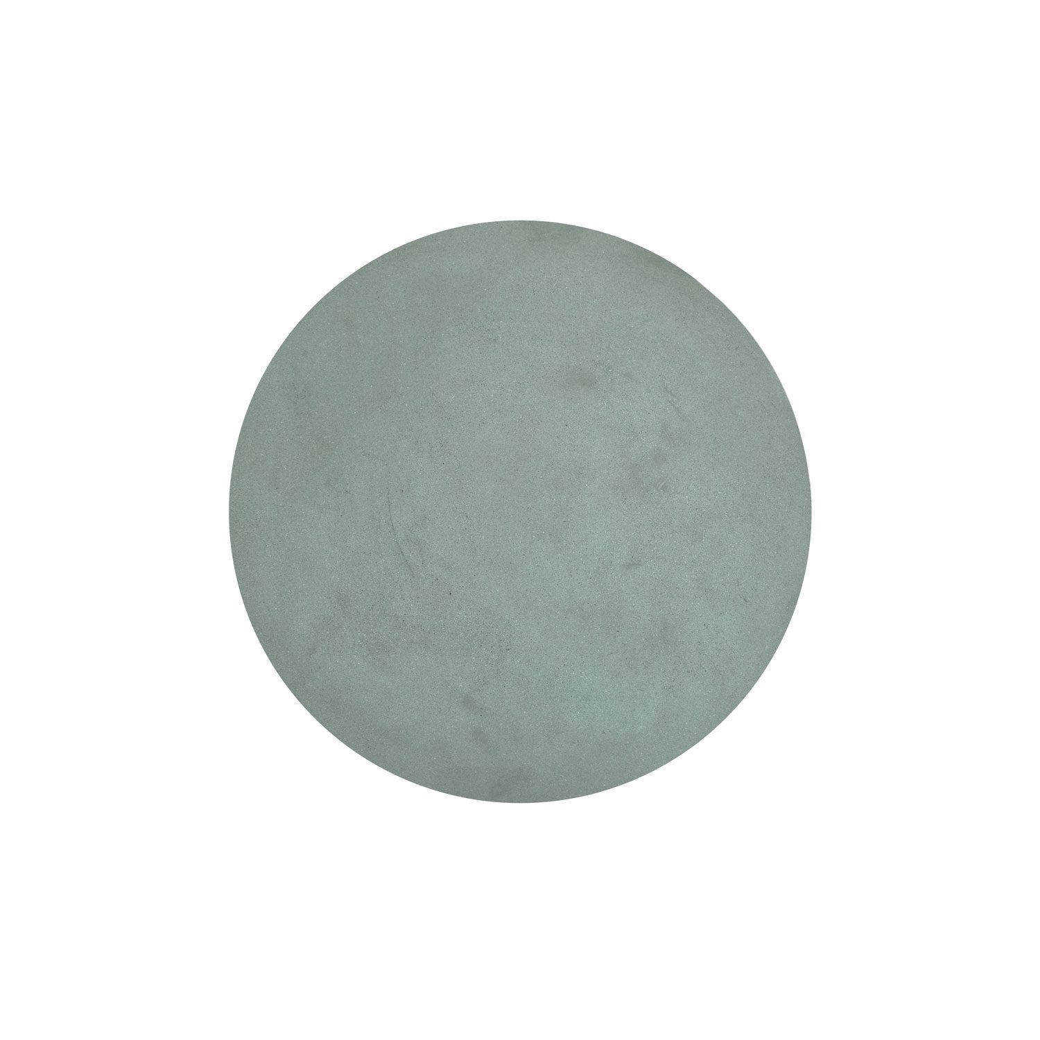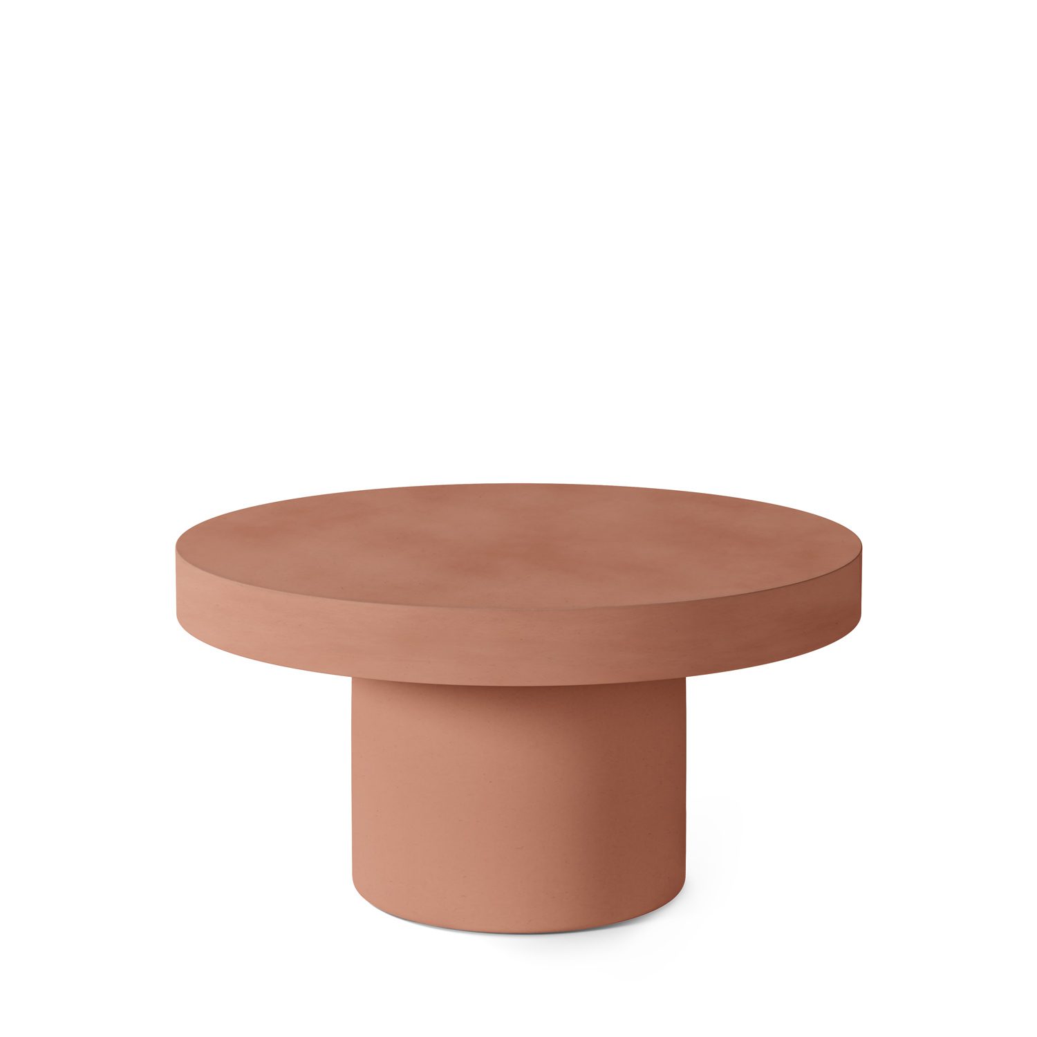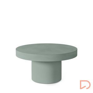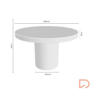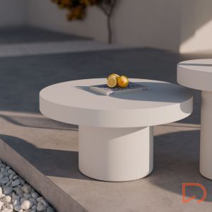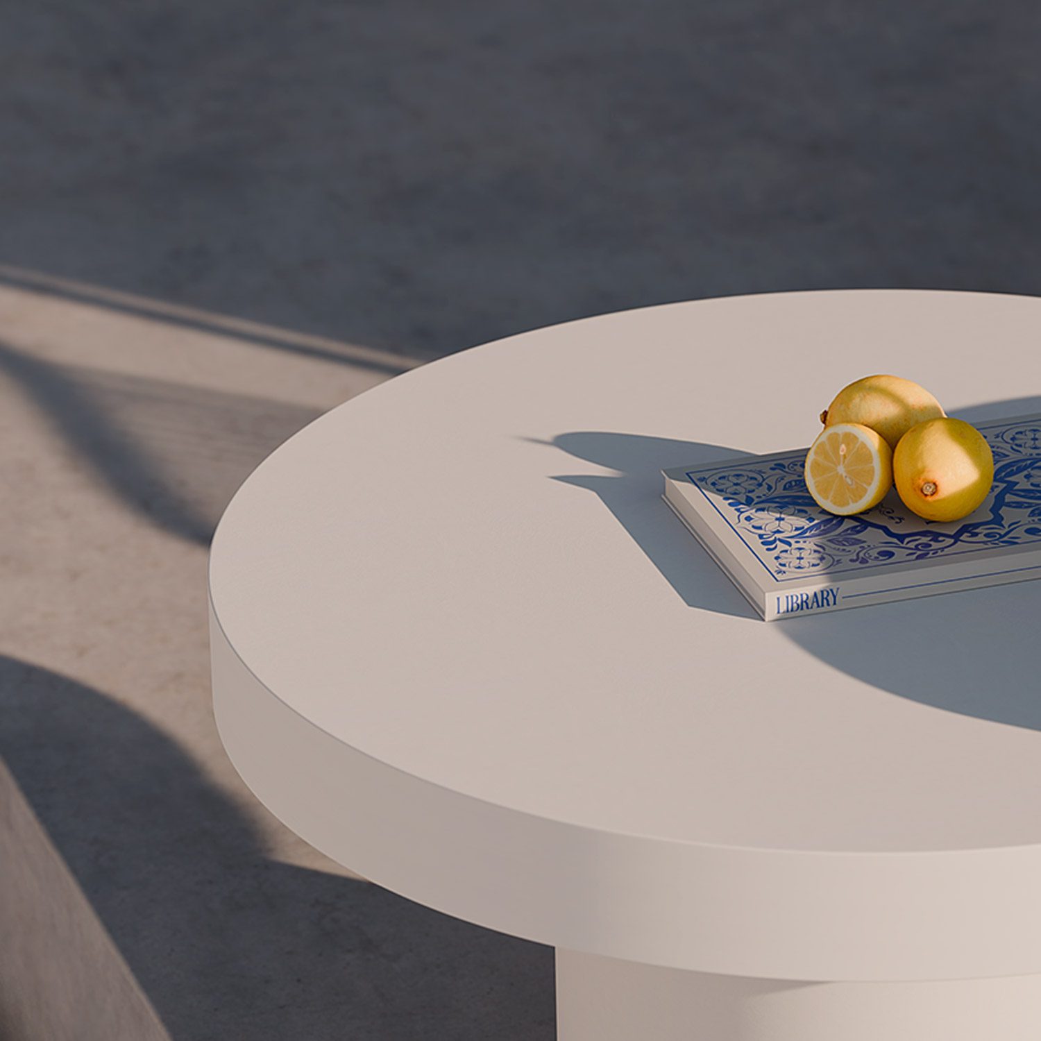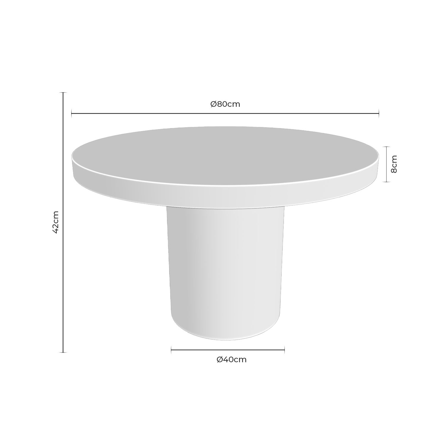Con un diámetro de 80 cm y una altura de 40 cm, su diseño compacto pero rotundo destaca por la contundencia de su base cilíndrica y el grosor de 8 cm de su tapa, que aporta una sensación de solidez y presencia arquitectónica. La textura lisa del microcemento y su color neutro permiten integrarla fácilmente en diferentes ambientes, funcionando tanto como pieza central como complemento decorativo.